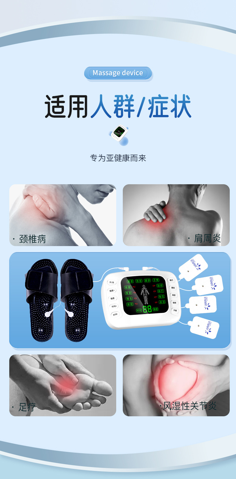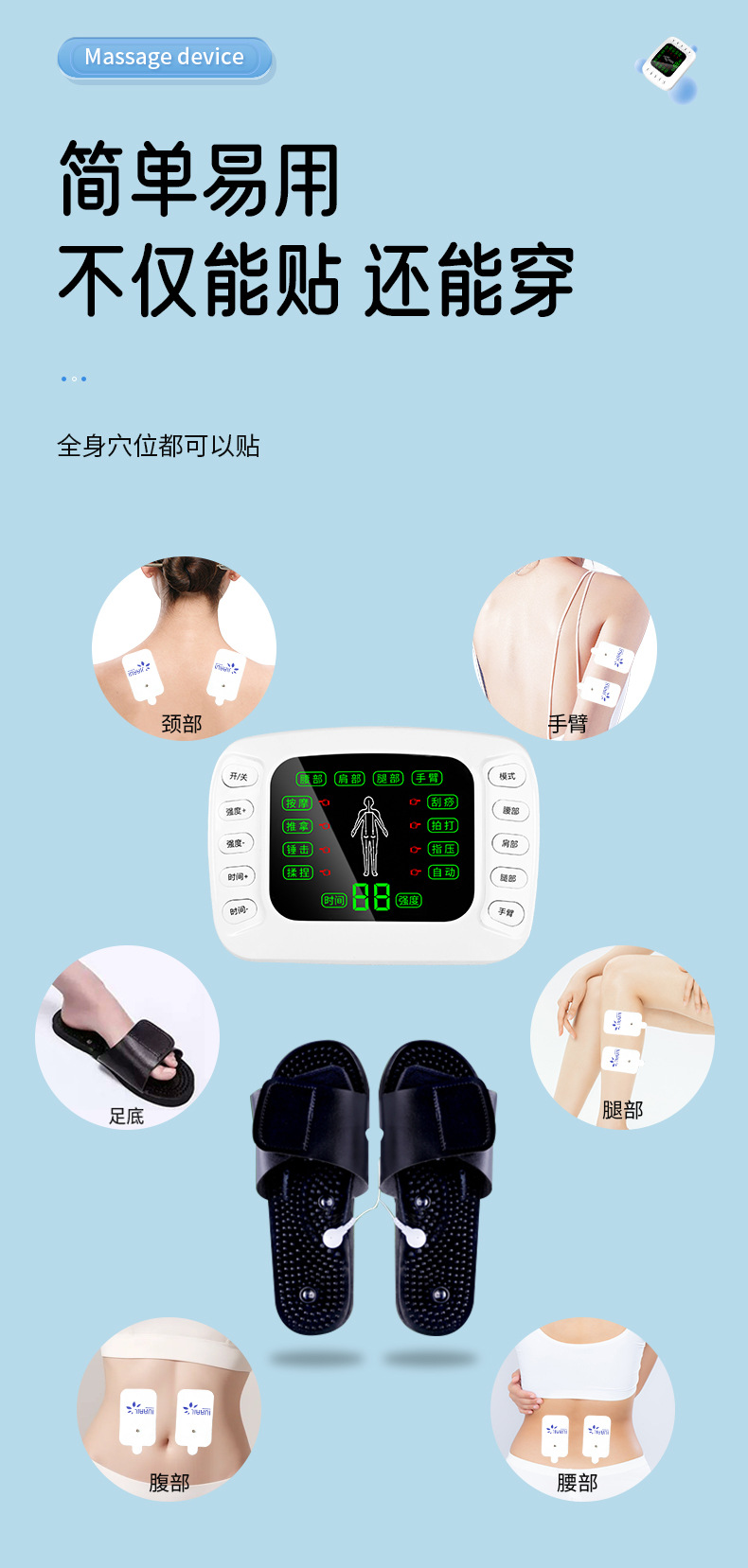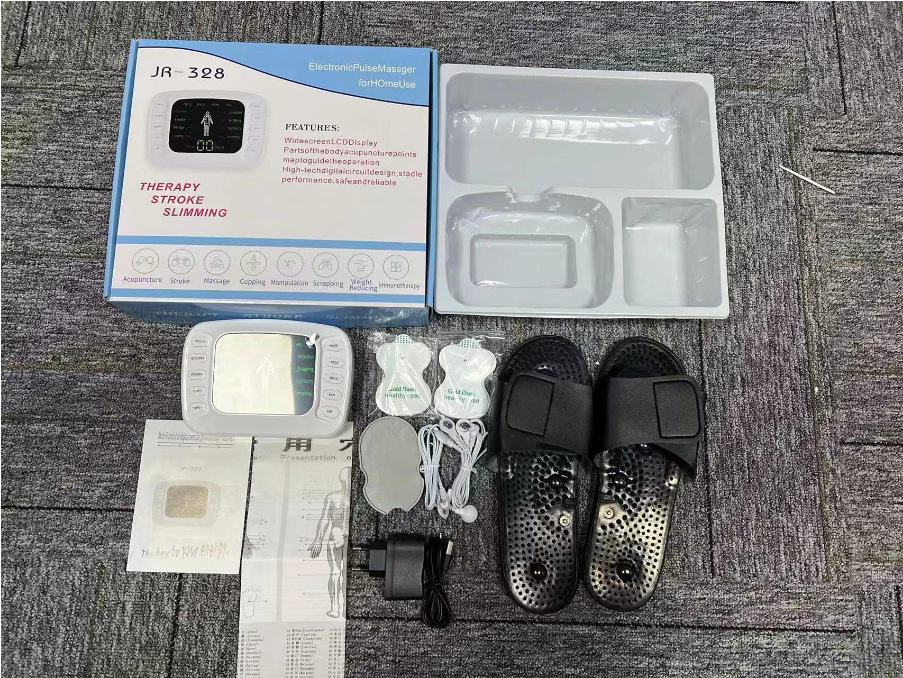 (一拖2扣子线1条,一拖4扣子线1条,粘板1个,英文贴片2对, 黑色拖鞋1对,英文裸机1个,英文说明书 1个,穴位图1张, 欧规电源1个,USB线1条,小包装 )