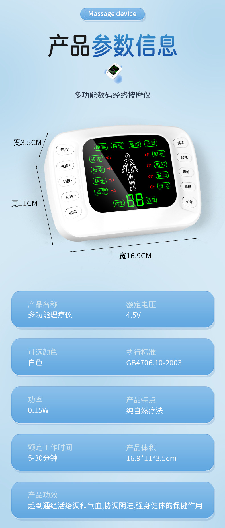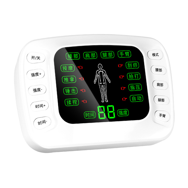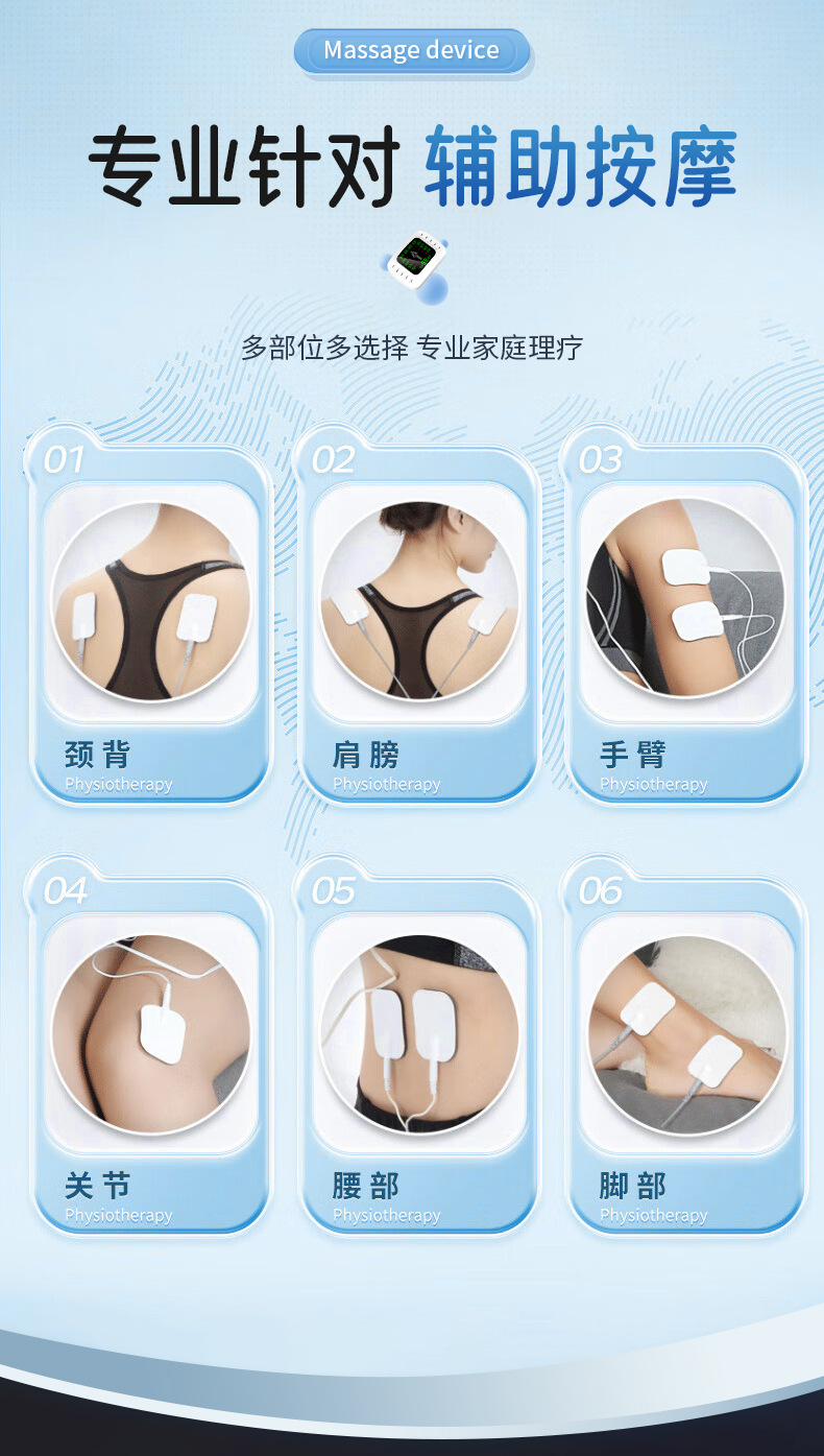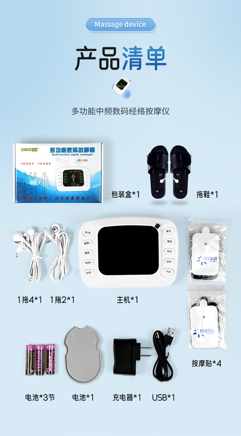 (一拖2扣子线1条,一拖4扣子线1条,粘板1个, 贴片2对, 中文裸机1个,中文说明书 1个,穴位图1张, 欧规电源1个,USB线1条,包装,吸塑 )
