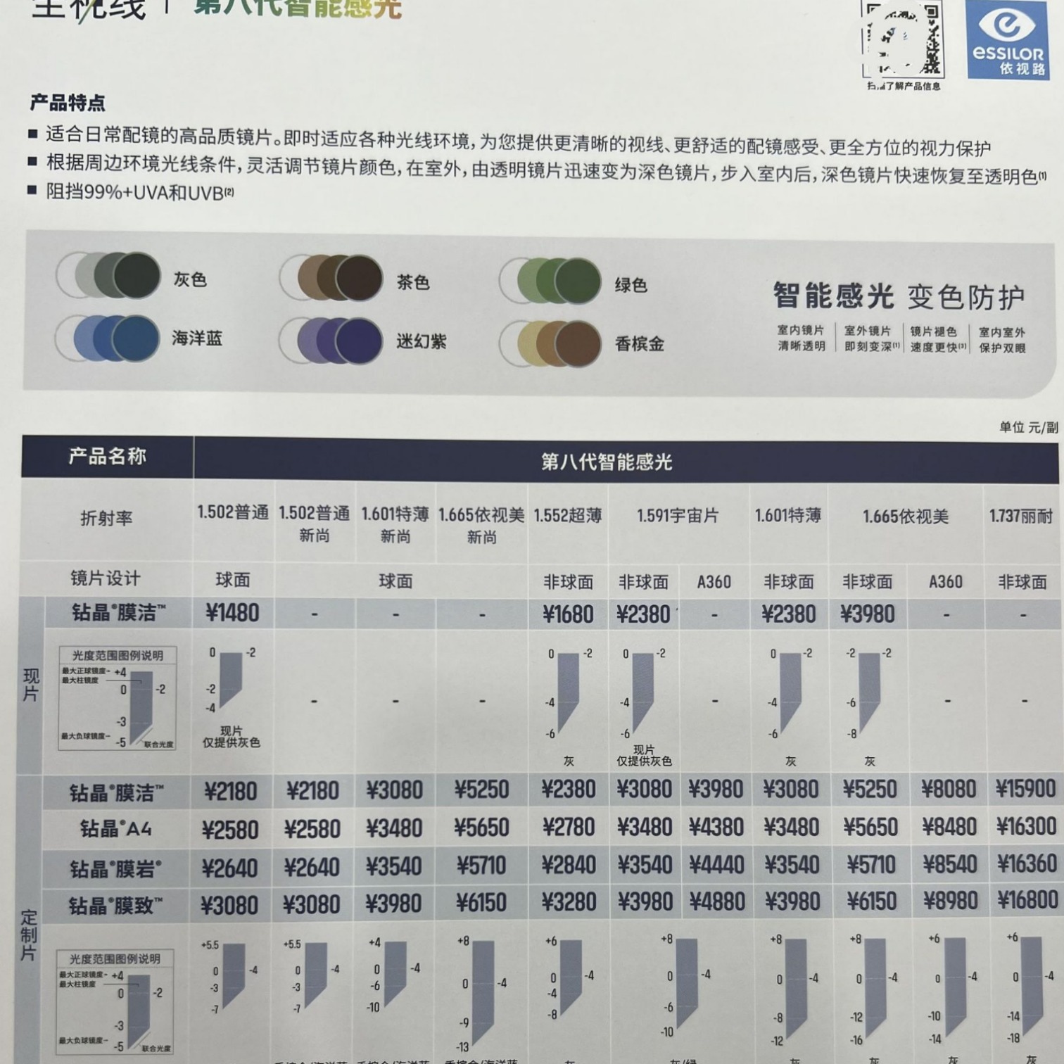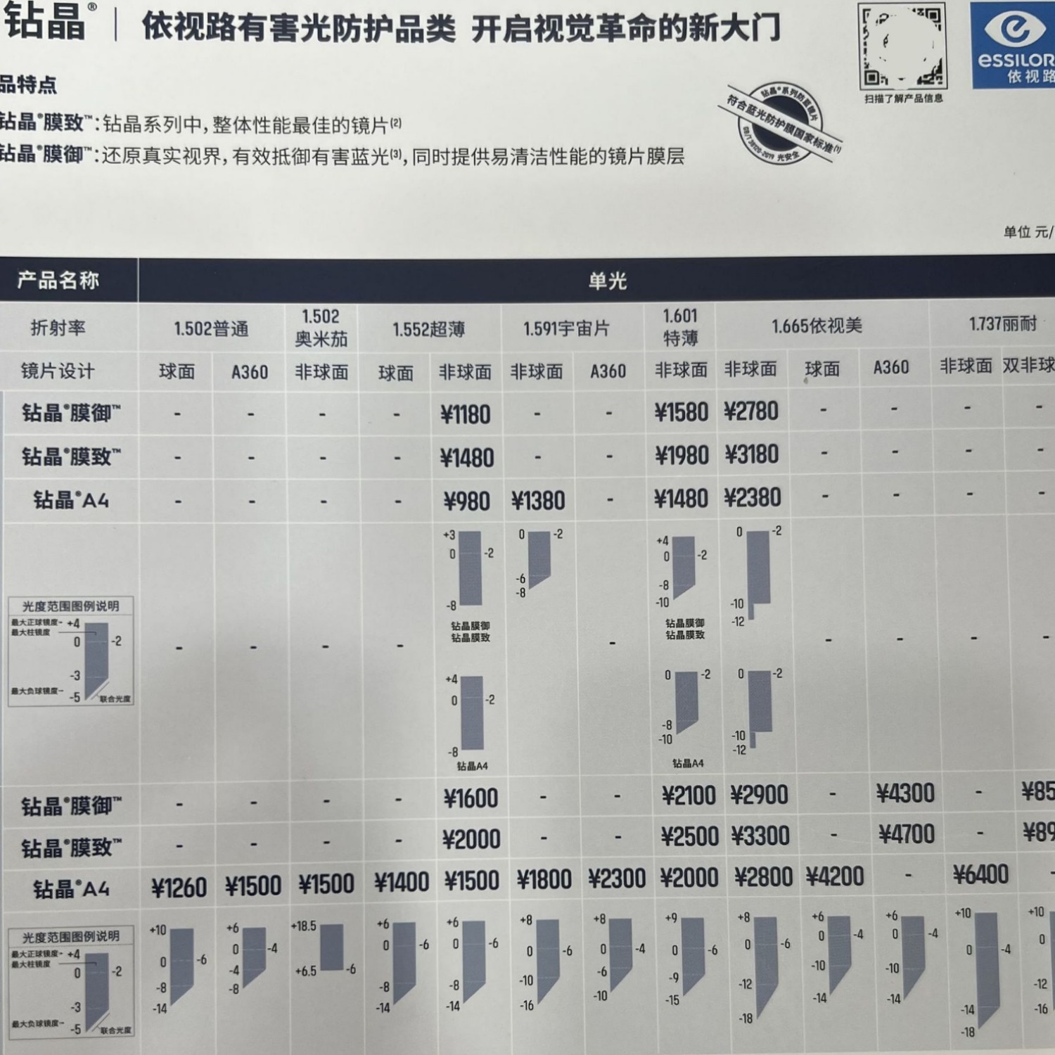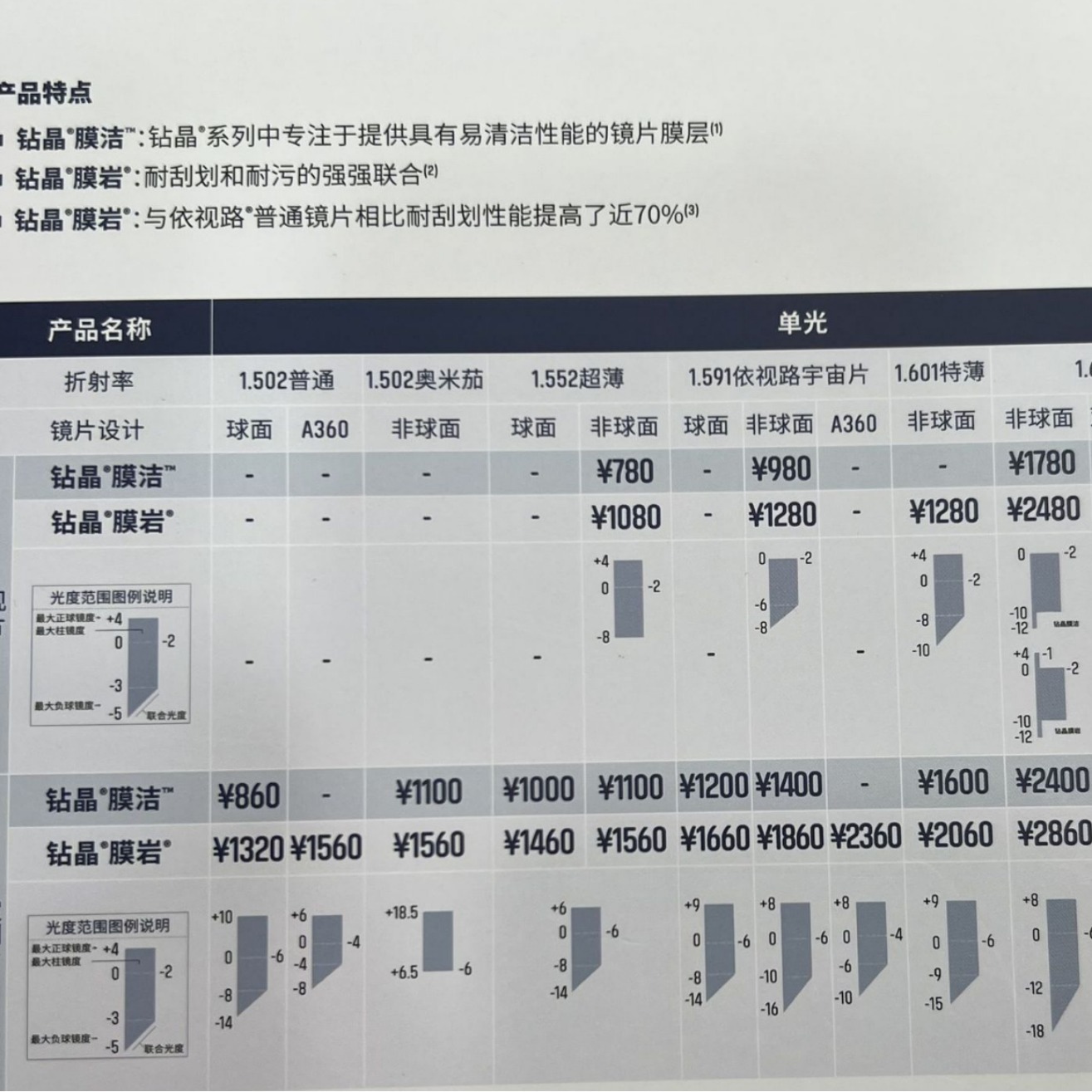 2、详情里面图片是依视路镜片销售手册,线下同步的 零沟通差。按需选择您需要的,不懂的可以截图咨询。