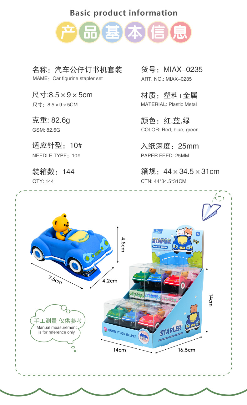 产品类别: 订书机 类型: 迷你订书机 品牌: 美即爱学 装订厚度: 15mm 装订数: 15页 适应针型: 10# 货号: MIAX-0235 型号: MIAX-0235 规格: 小熊汽车订书机(款式随机) 包装方式: 展示盒 加印LOGO: 可以 加工定制: 是 净重: 见详情 使用书针型号: 10# 是否进口: 否 主要下游平台: 亚马逊,速卖通,其他 主要销售地区: 非洲,欧洲,南美,东南亚,北美,东北亚, 有可授权的自有品牌: 否 是否跨境出口专供货源: 是 是否属于礼品: 否 重量: 0.1 kg/只