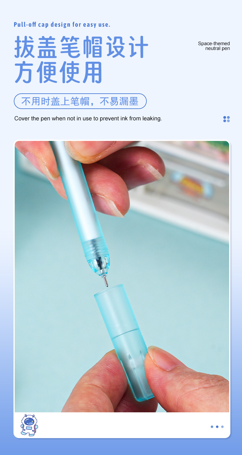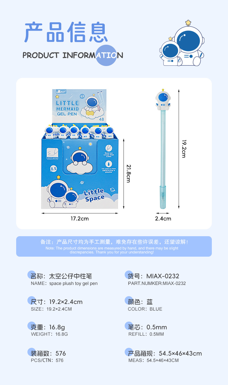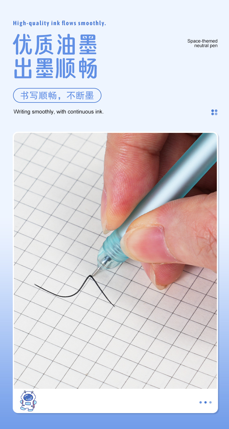外壳材质: 塑料 品牌: 美即爱学 笔尖材质: 其他材质 是否可擦: 否 系列: 宇航员 货号: LJ-E191A 笔芯颜色: 宇航员中性笔(黑) 笔头: 0.5mm 重量: 0.025 kg/支