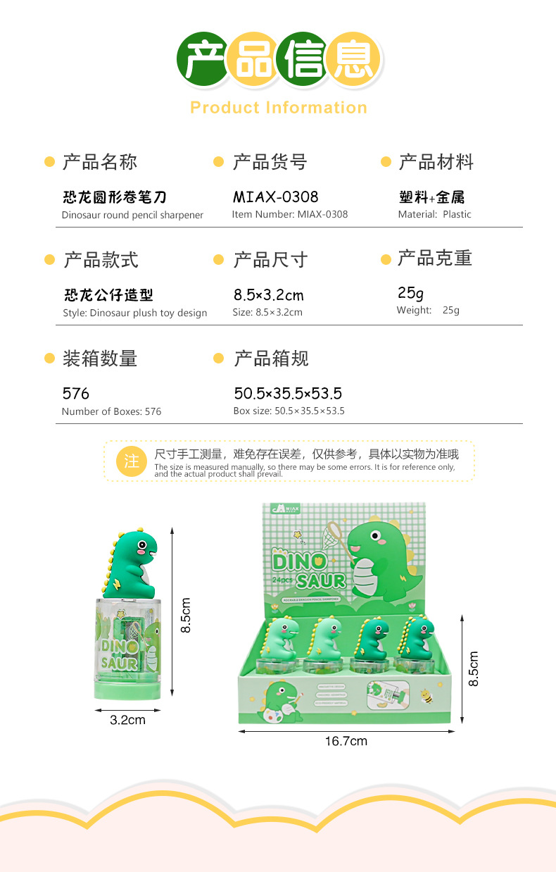 材质: 塑料 驱动方式: 手动 品牌: 美即爱学 规格: 8.5*3.2 是否电动: 否 货号: MIAX-0308 型号: MIAX-0308 造型: 动物型 长x宽x高: 8.5*3.2*2.4(mm) 净重: 25g 包装规格: 中盒装 是否进口: 否 颜色: 小恐龙卷笔刀(颜色随机发) 主要下游平台: ebay,亚马逊,wish,速卖通,独立 主要销售地区: 非洲,欧洲,南美,东南亚,北美,东北亚, 有可授权的自有品牌: 否 是否跨境出口专供货源: 是 是否属于礼品: 是,个人礼品 适用送礼关系: 晚辈,情侣,夫妻,同事,朋友,长辈,孩子 适用节日: 圣诞节,情人节,春节,父亲节,母亲节,教 重量: 0.04 kg/个