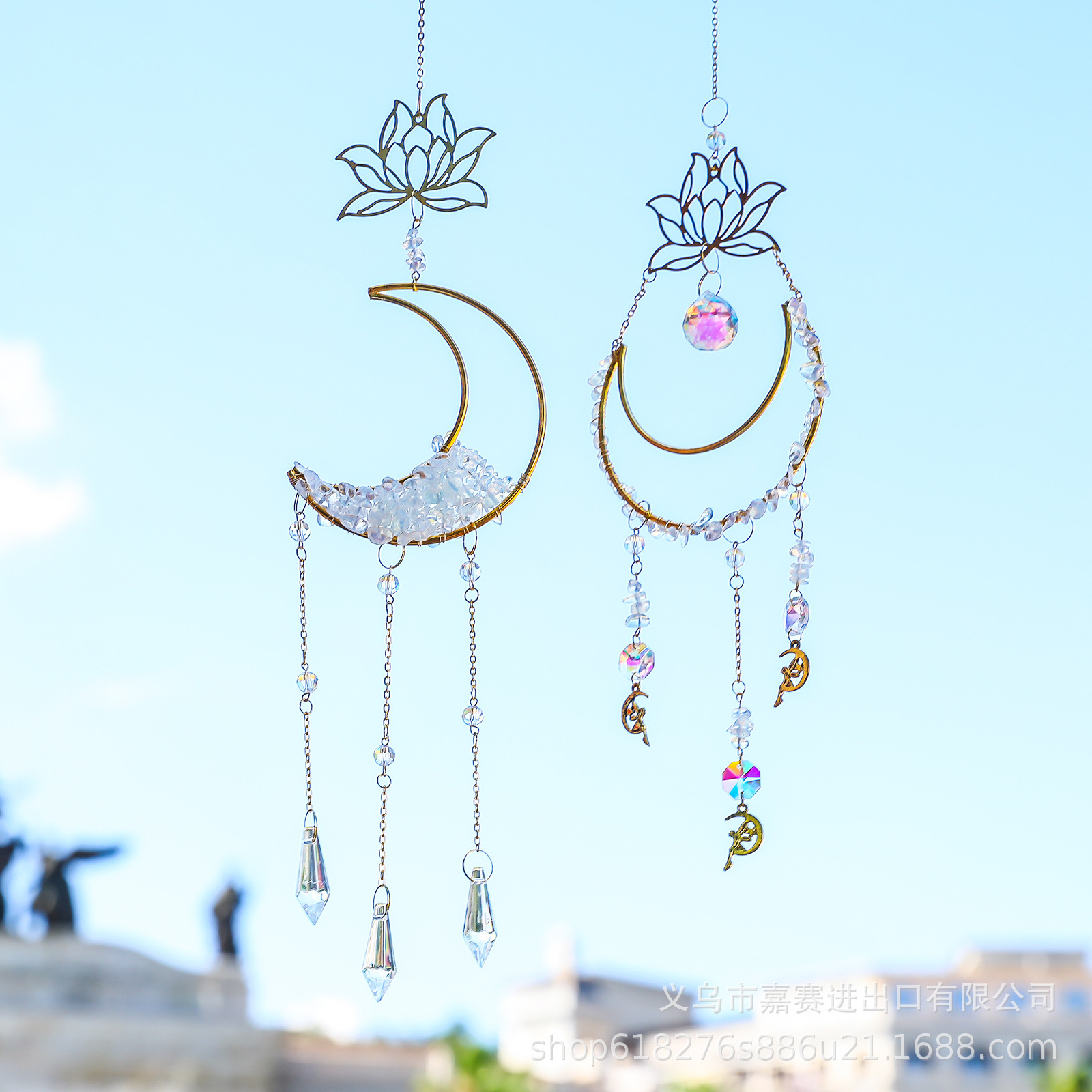 亚马逊跨境货源风铃手工编花碎石莲花月亮庭院装饰金色水晶挂件
