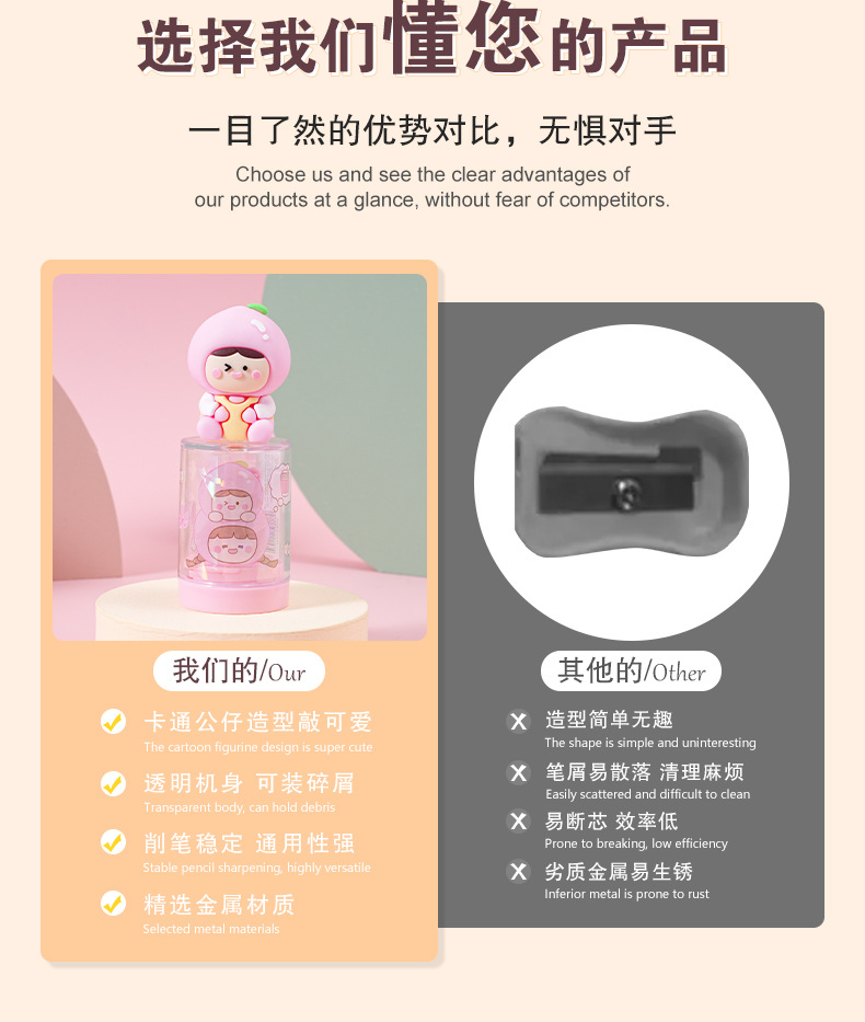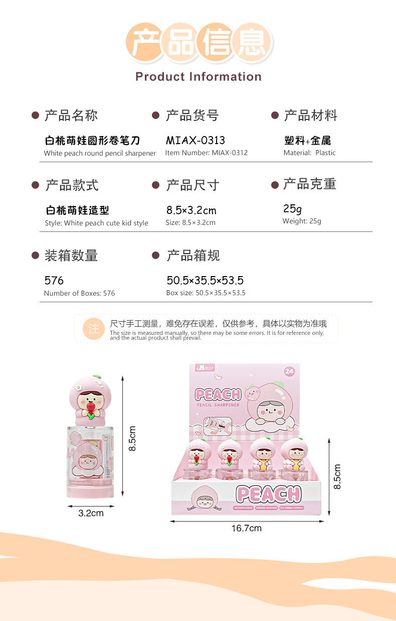 材质: 塑料 驱动方式: 手动 品牌: 美即爱学 规格: 卷笔刀 是否电动: 否 货号: MIAX-0313 型号: MIAX-0313 造型: 动物型 长x宽x高: 5*4*3 净重: 30G 包装规格: 24个/盒 是否进口: 否 颜色: MIAX-0313(单个装) 主要下游平台: ebay,亚马逊,wish,速卖通,独立 主要销售地区: 非洲,欧洲,南美,东南亚,北美,东北亚, 有可授权的自有品牌: 否 是否跨境出口专供货源: 是 是否属于礼品: 是,个人礼品 适用送礼关系: 晚辈,情侣,夫妻,同事,朋友,长辈,孩子 适用节日: 圣诞节,情人节,春节,父亲节,母亲节,教 重量: 0.04 kg/件