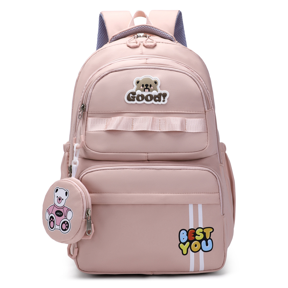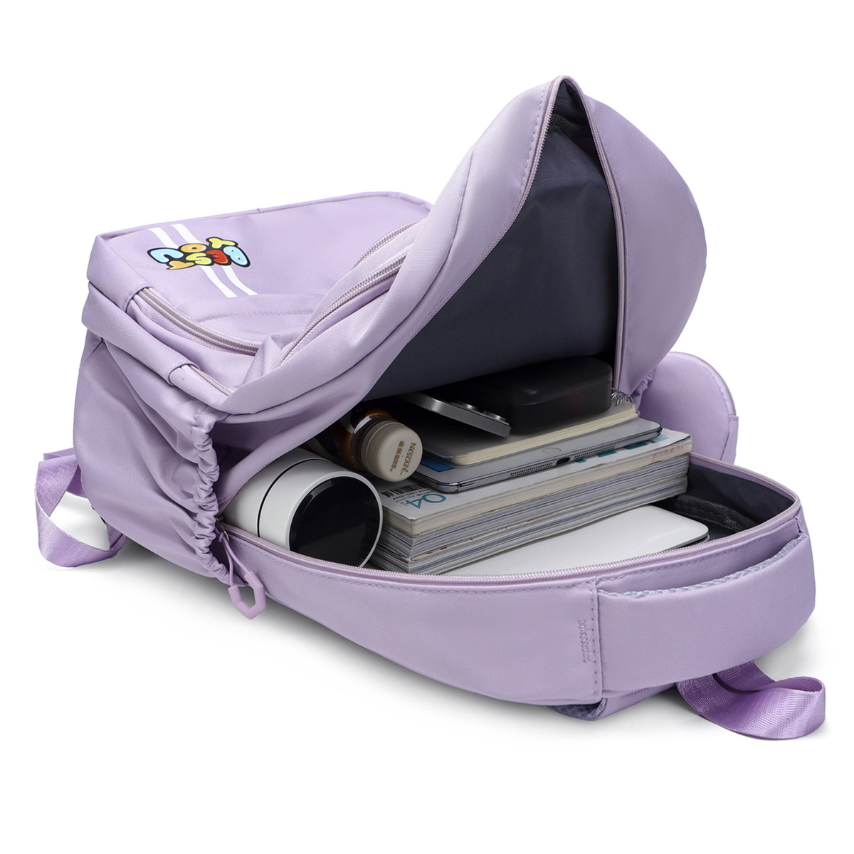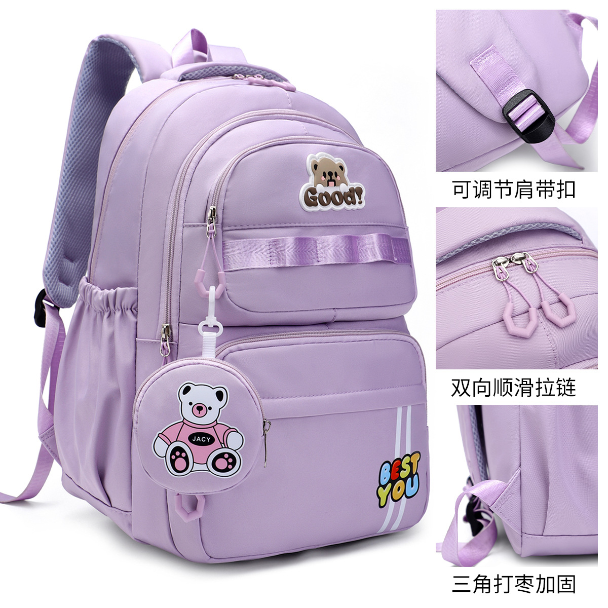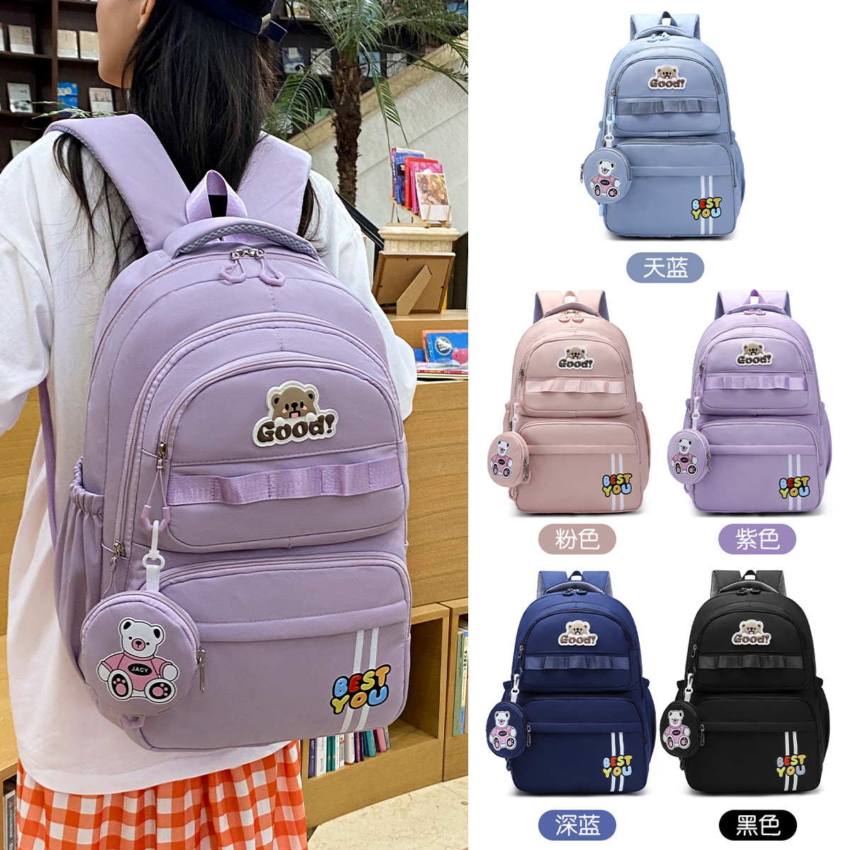材质: 牛津布 里料质地: 涤纶 功能: 透气,减负 风格: 青春校园 开盖方式: 拉链 品牌: 其他 流行元素: 字母 颜色: 黑色,粉红色,紫罗兰,天蓝色,深蓝色 货号: 245-27 上市年份季节: 2025夏季 包内部结构: 电脑插袋 硬度: 中偏软 外袋种类: 内贴袋 有可授权的自有品牌: 否 有无夹层: 无 适用场景: 日常搭配 重量: 0.5 kg/个