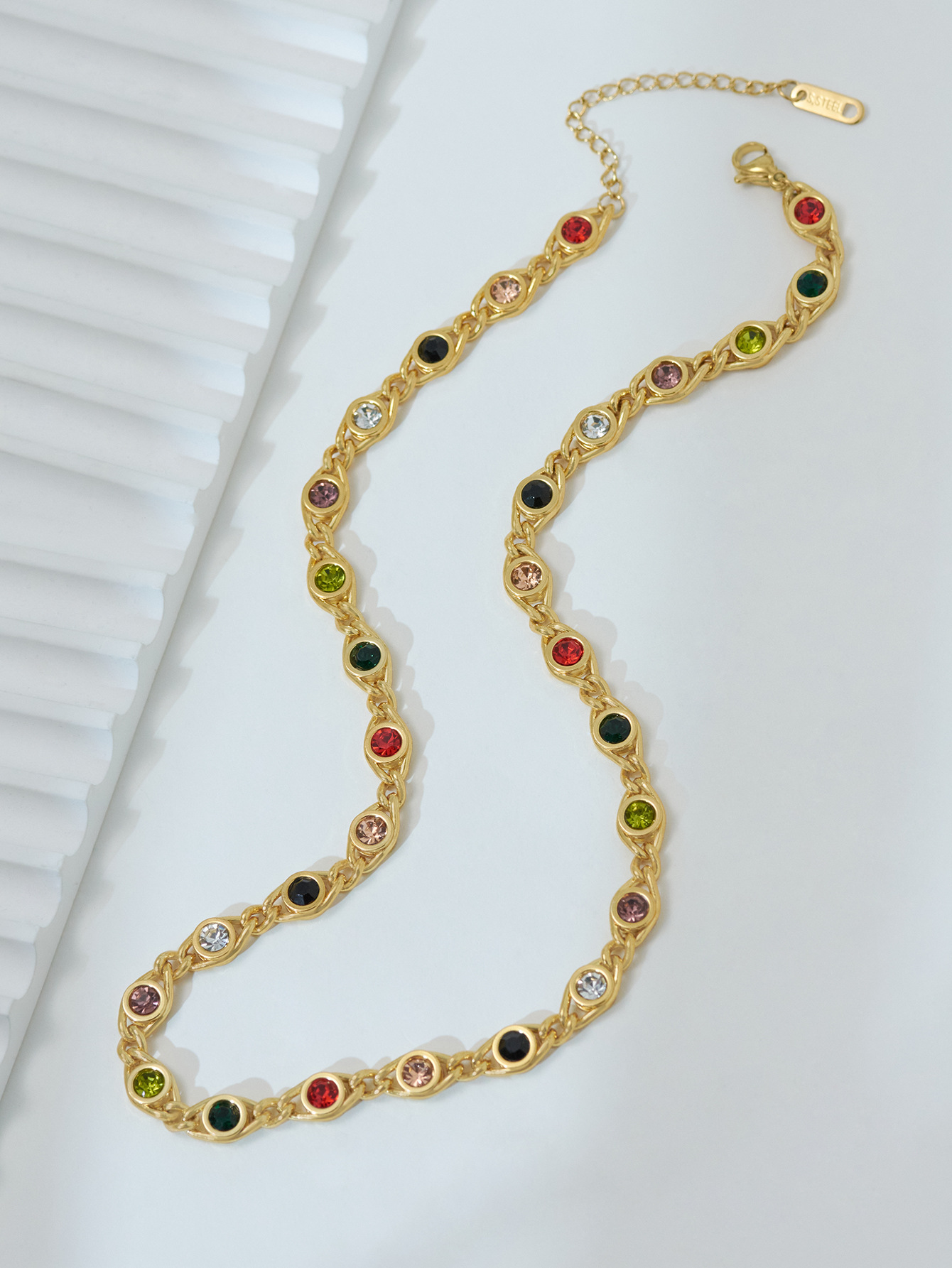 波西米亚欧美风时尚百搭彩色锆石不锈钢镀18K金圈式链条项链女