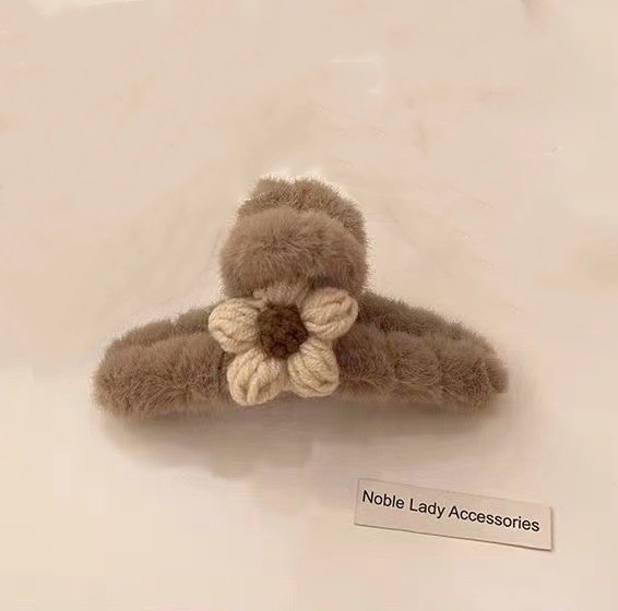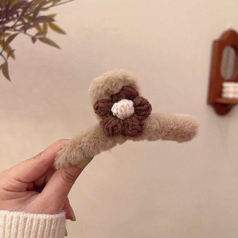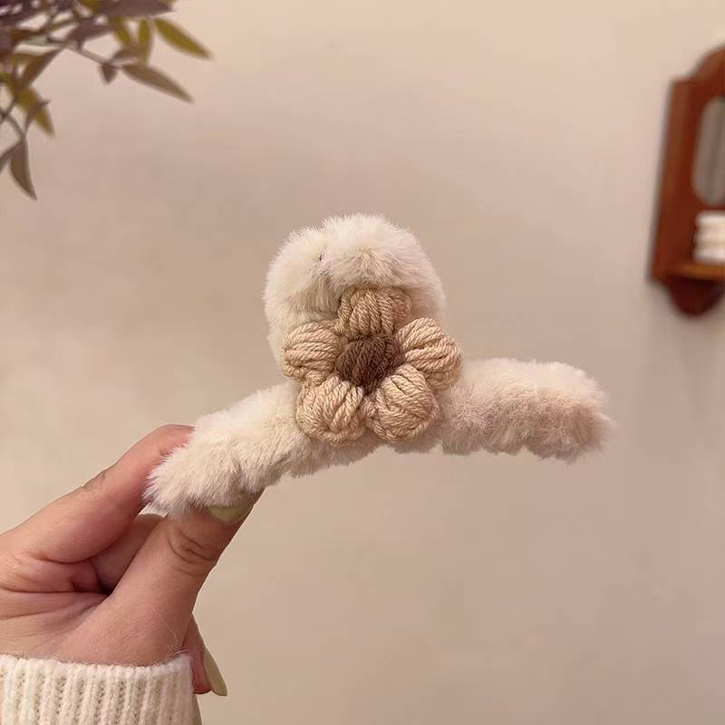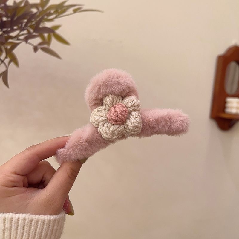 秋冬新款甜味少女毛绒抓夹甜美毛线花朵发夹女盘发夹子鲨鱼夹发卡