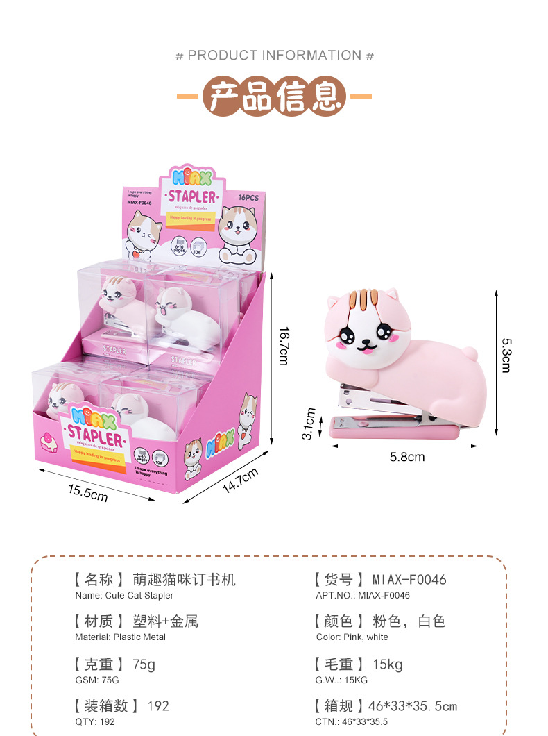 产品类别: 订书机 类型: 普通订书机 品牌: 美即爱学 装订厚度: 15 装订数: 15 适应针型: 24/6 货号: MIAX-F0046 型号: MIAX-F0046 规格: MIAX-F0046 包装方式: PVC盒+卡纸 适用送礼场合: 婚庆,生日,满月,旅游纪念,毕业,乔迁, 加印LOGO: 可以 加工定制: 是 净重: 75g 使用书针型号: 10# 是否进口: 否 是否跨境出口专供货源: 否 是否属于礼品: 是,个人礼品 适用送礼关系: 晚辈,情侣,夫妻,同事,朋友,长辈,孩子 适用节日: 圣诞节,情人节,春节,父亲节,母亲节,教 重量: 0.095 kg/只