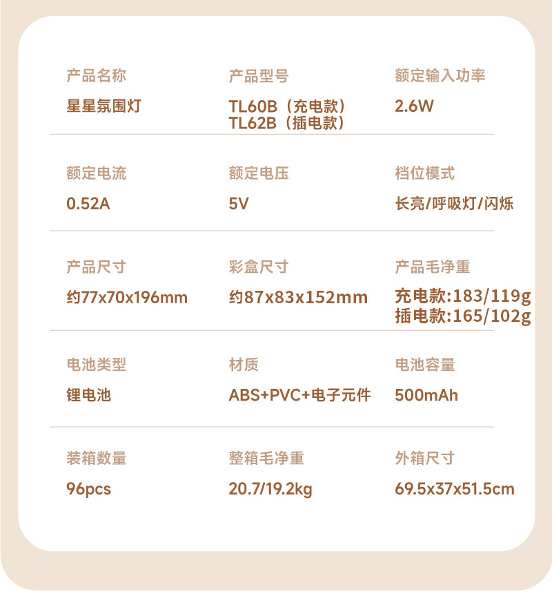 灯光颜色:暖色 产品颜色:米色