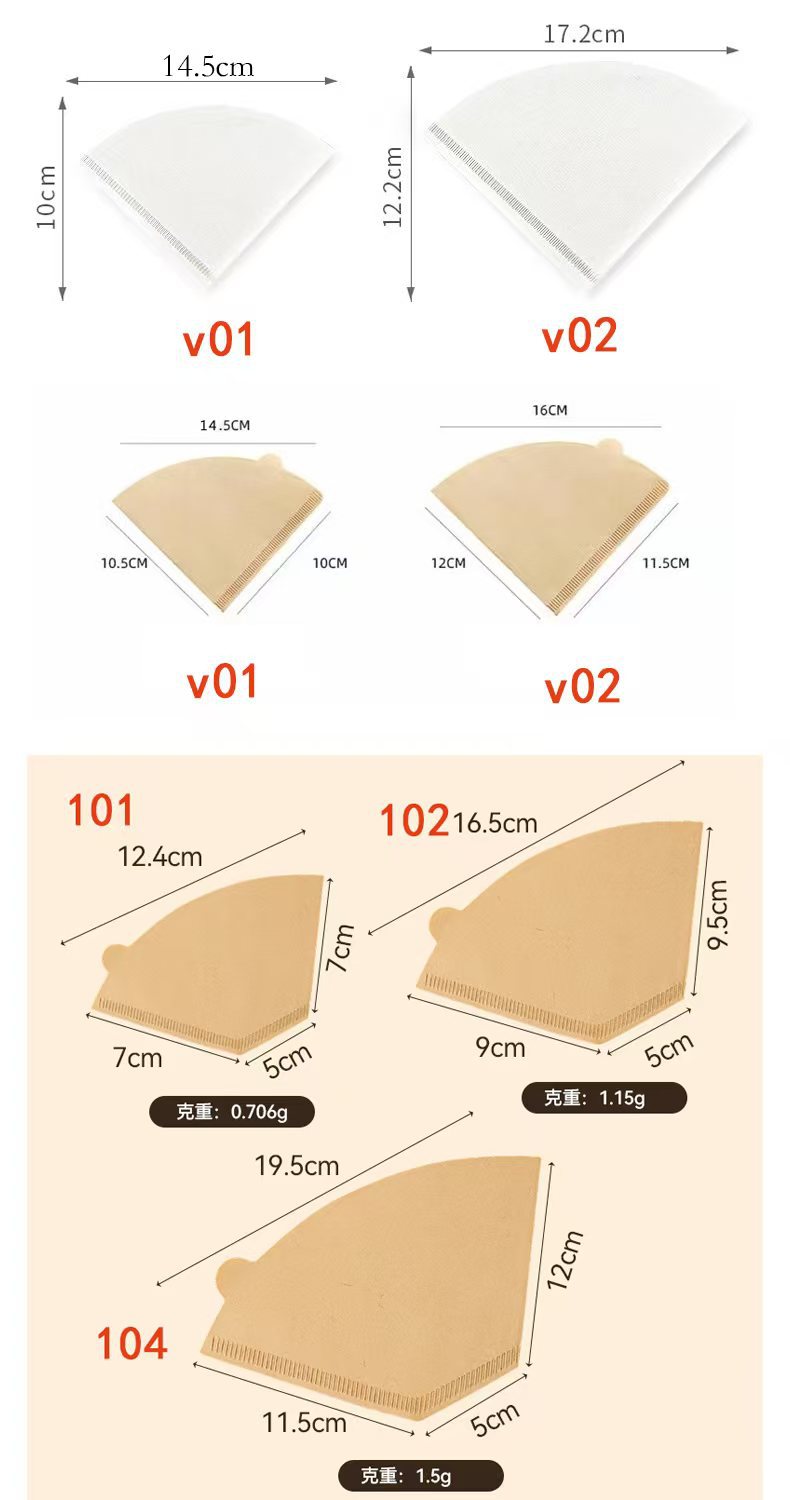 V形滤纸有V01,V02,颜色有本色,白色。包装规格有40片,50片,100片,也可按客户要求包装。