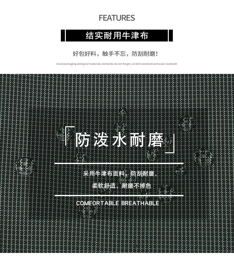 材质: 牛津布 功能: 透气,防水,超轻,耐磨 里料质地: 涤纶 容纳电脑尺寸: 14英寸 品牌: 思尧 风格: 都市简约 流行元素: 车缝线,撞色 图案: 纯色 颜色: 深灰色,黑色,墨绿色,深蓝色 有可授权的自有品牌: 否 上市年份季节: 2024年秋季 适用场景: 商务出行 重量: 0.2 kg/个