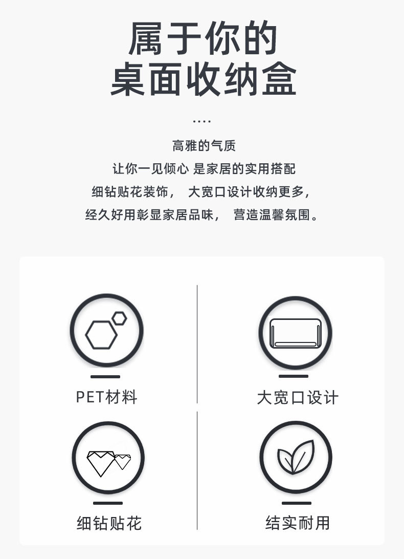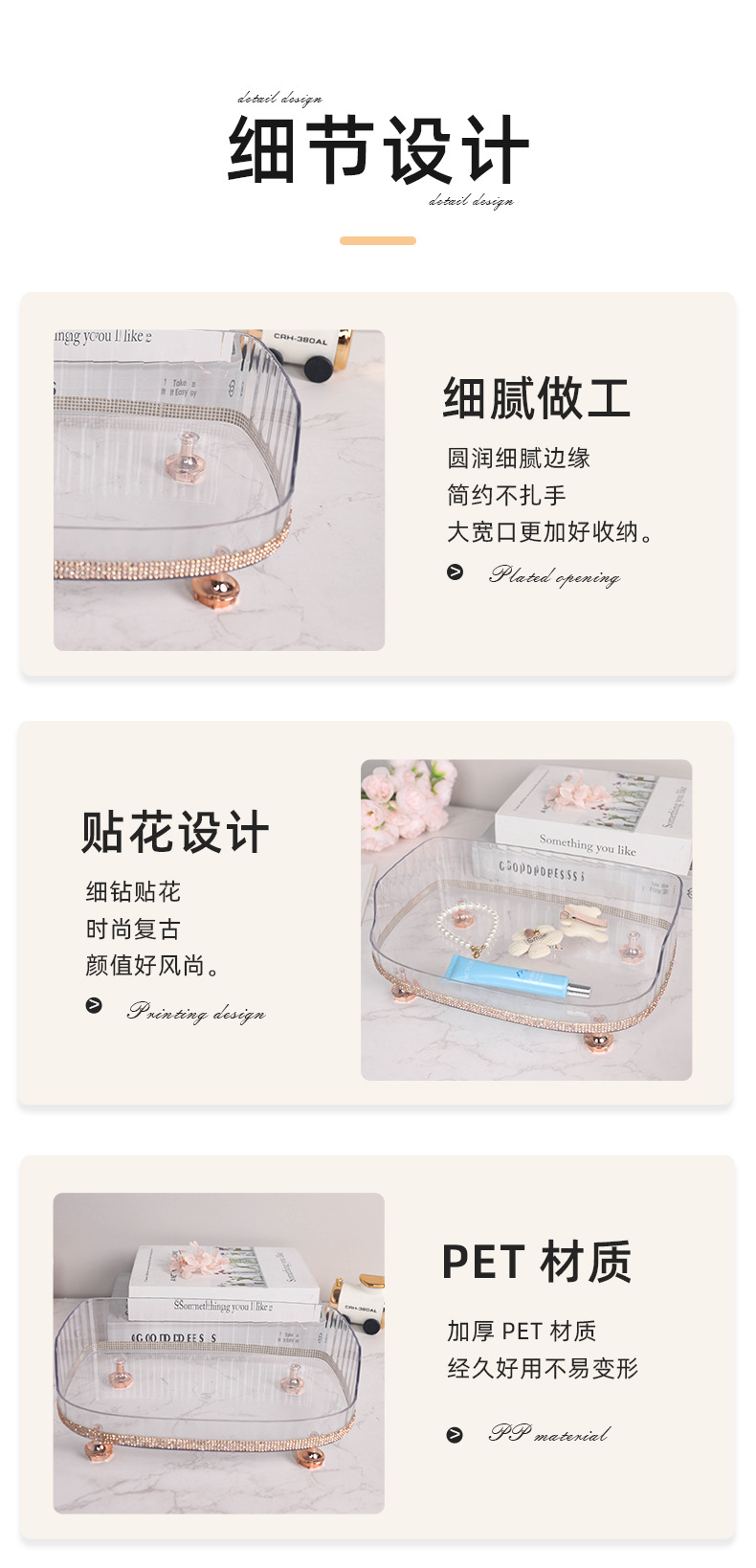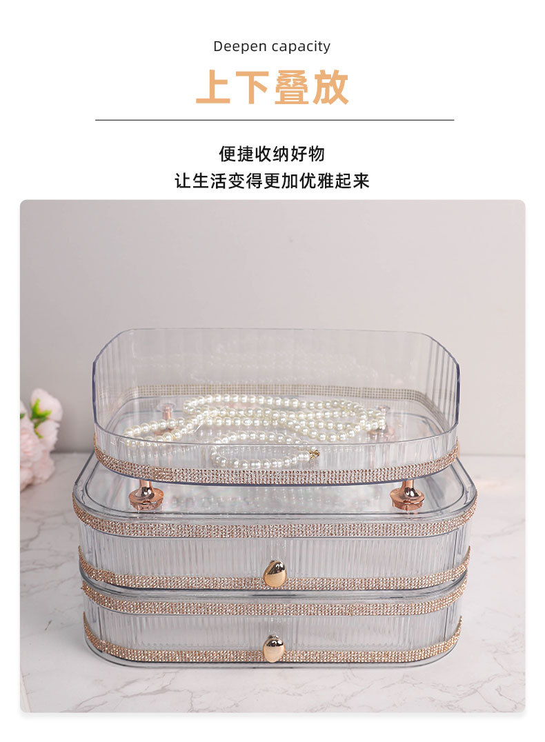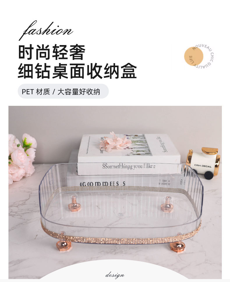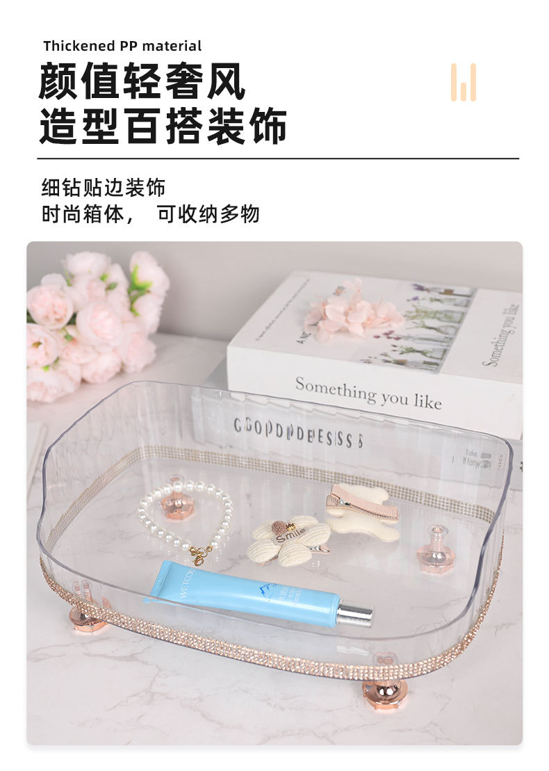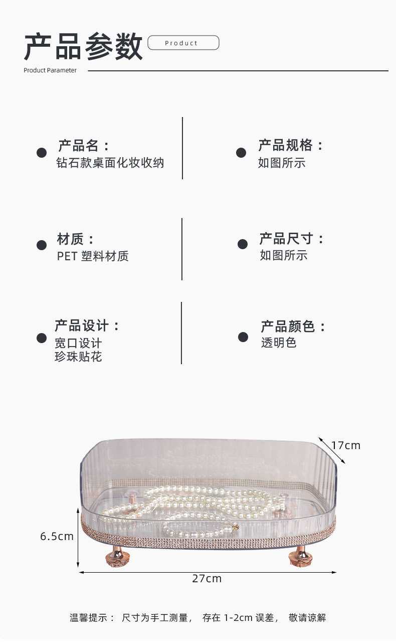材质: PET 功能: 多用途 风格: 轻奢 层数: 1层 产品类别: 首饰架 是否进口: 否 安装方式: 桌面式 产地: 金华 产品上市时间: 2025 收纳场景: 卫浴收纳 货号: 999钻石款 颜色: 贴钻化妆收纳置物架 规格: 27*17*6.5 专利: 否 主要下游平台: ebay,亚马逊,wish,速卖通,独立 主要销售地区: 非洲,欧洲,南美,东南亚,北美,东北亚, 有可授权的自有品牌: 是 是否跨境出口专供货源: 是 毛重: 12.6KG 重量: 0.5 kg/个