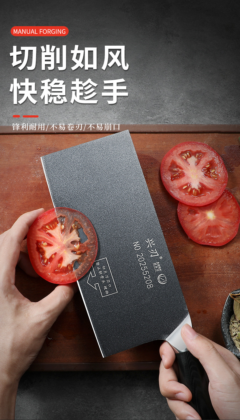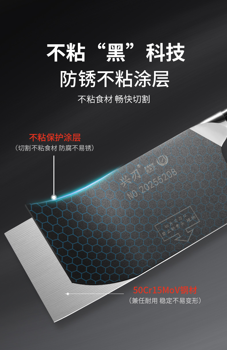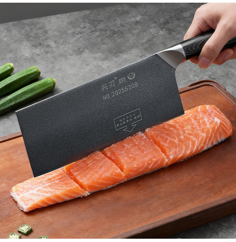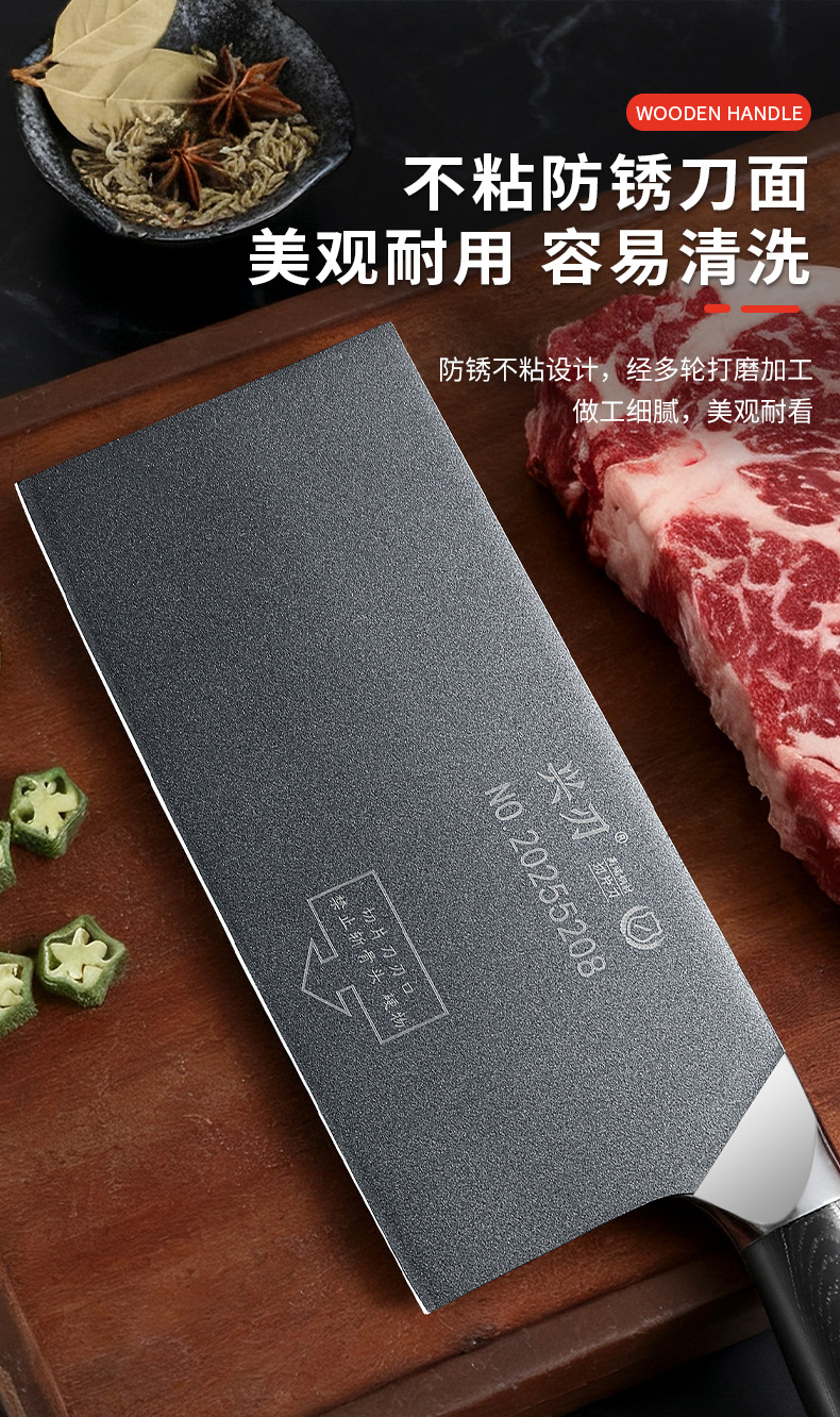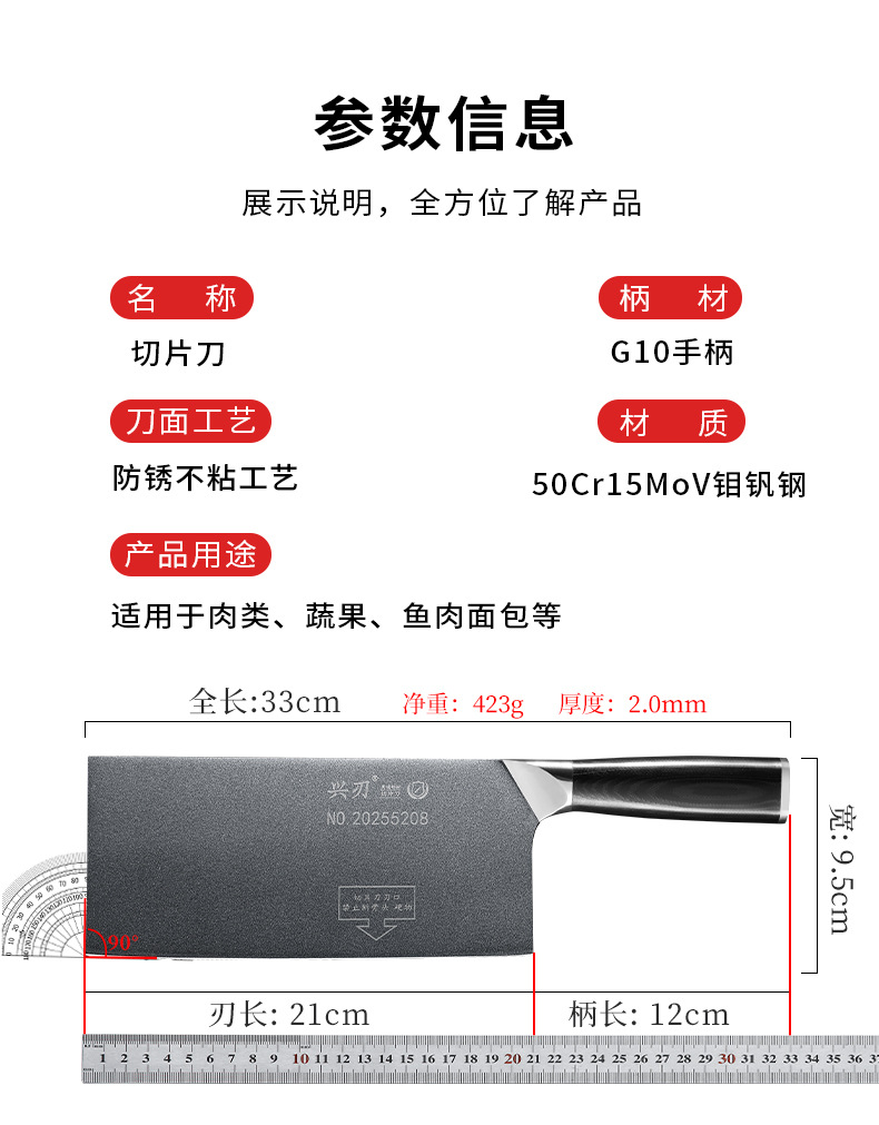 材质: 5CR15 品牌: 鑫五合 刀身材质: 5Cr系列钢 产品类别: 切片刀 工艺: 一体成型 是否进口: 否 货号: XR-CD1342 加印LOGO: 不可以 加工定制: 否 产品上市时间: 2026年春 价格段: 30-40元 是否有专利: 否 规格: 不沾钢头切片刀 有可授权的自有品牌: 否 是否跨境出口专供货源: 否 风格: 新中式 刀尖角度: 60°以上 刃长: 21 刀柄长: 12 全刀长最大值: 33