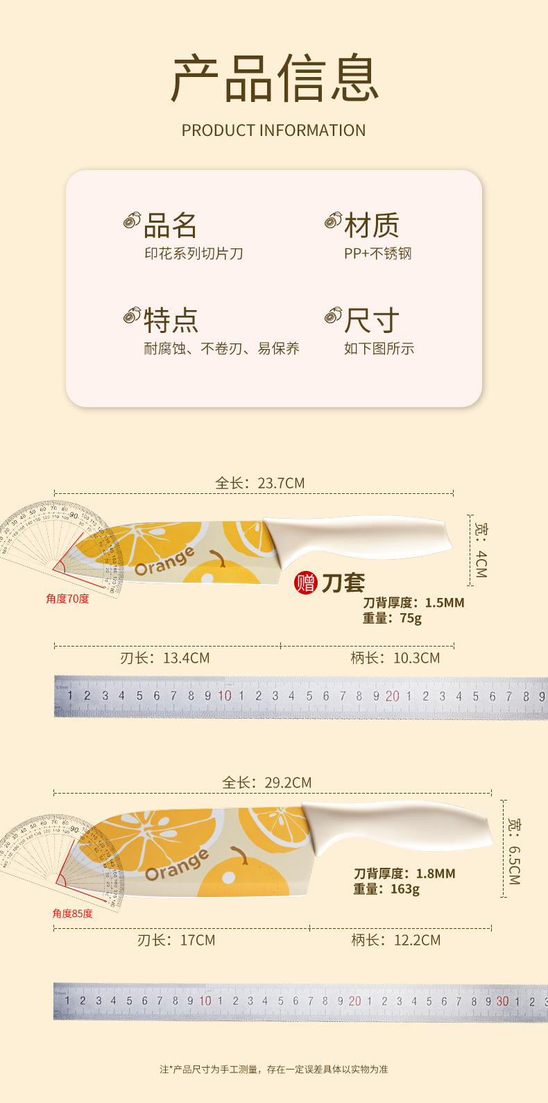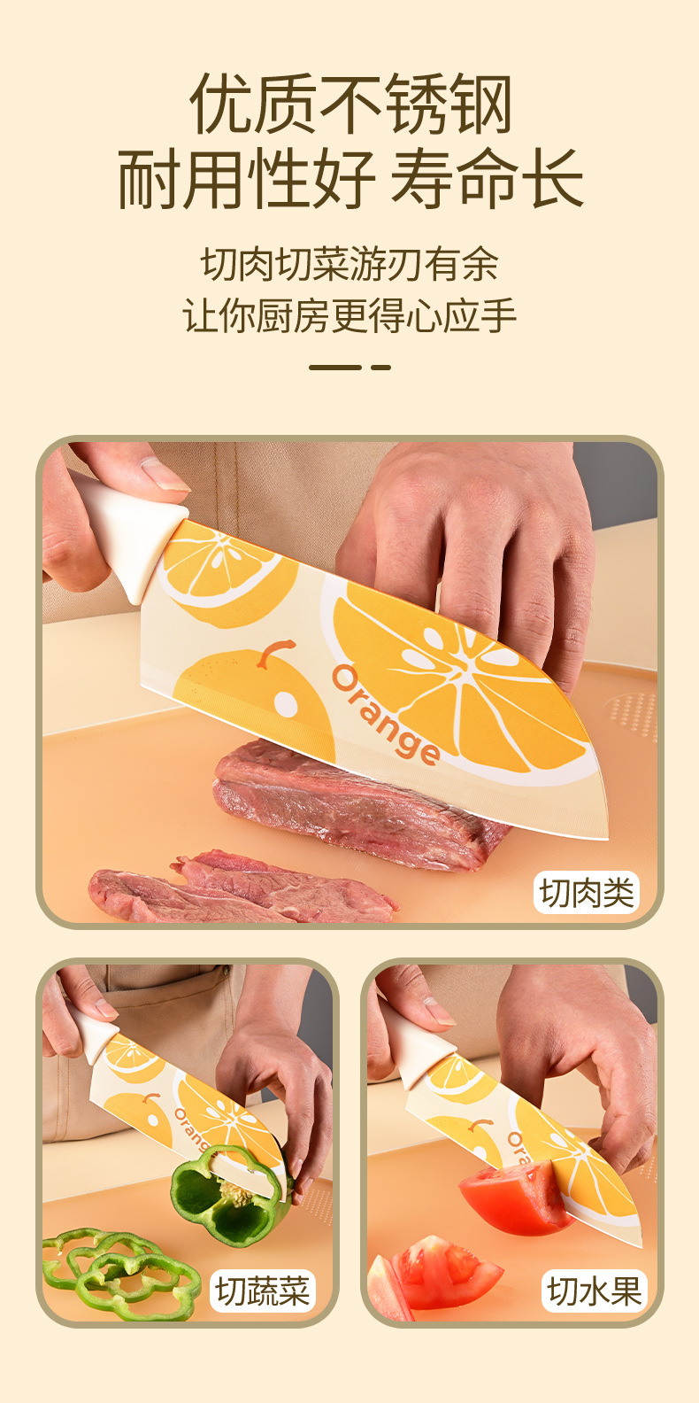 材质: 不锈钢 刀身材质: 3Cr系列钢 品牌: 兴刃 产品类别: 切片刀 是否进口: 否 原产国/地区: 中国 货号: 22BTZDG0102 产地: 阳江 价格段: 10元以内 是否有专利: 否 规格: XR大橘大利菜刀,XR大橘大利厨刀(带刀 主要下游平台: 亚马逊,独立站,LAZADA 主要销售地区: 南美,东南亚,北美 有可授权的自有品牌: 是 是否跨境出口专供货源: 是 风格: 现代简约 颜色: 桔色 版权: 无 刀尖角度: 60°以上 刃长: 17