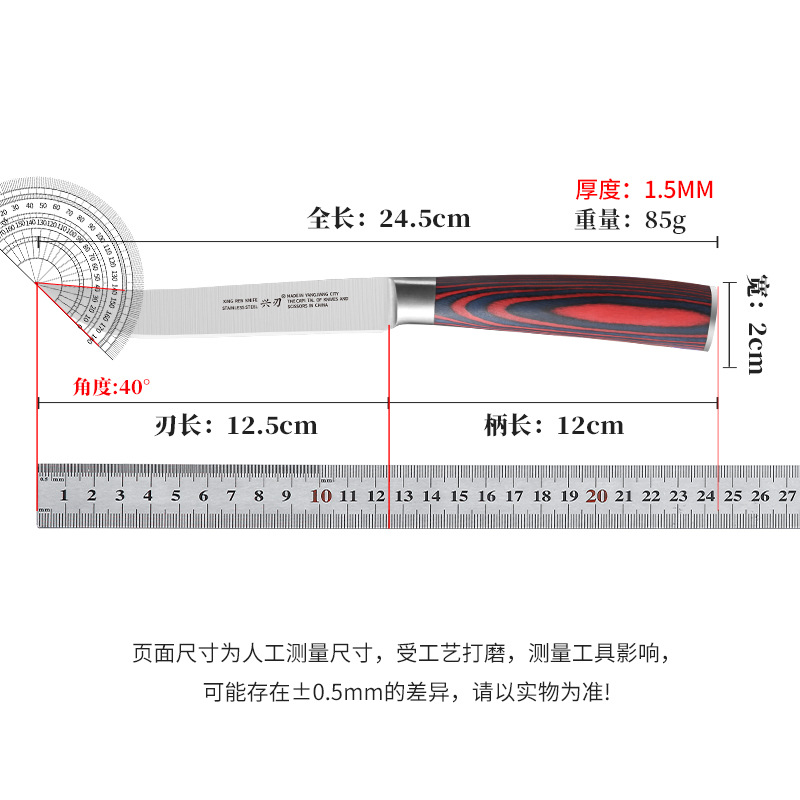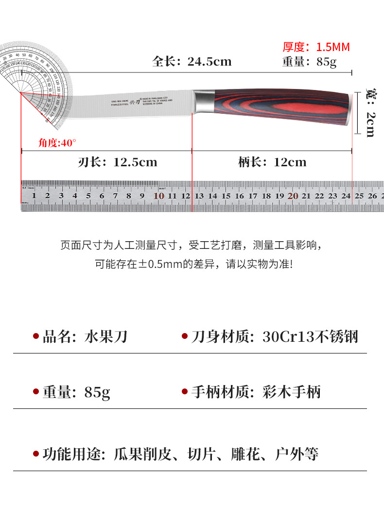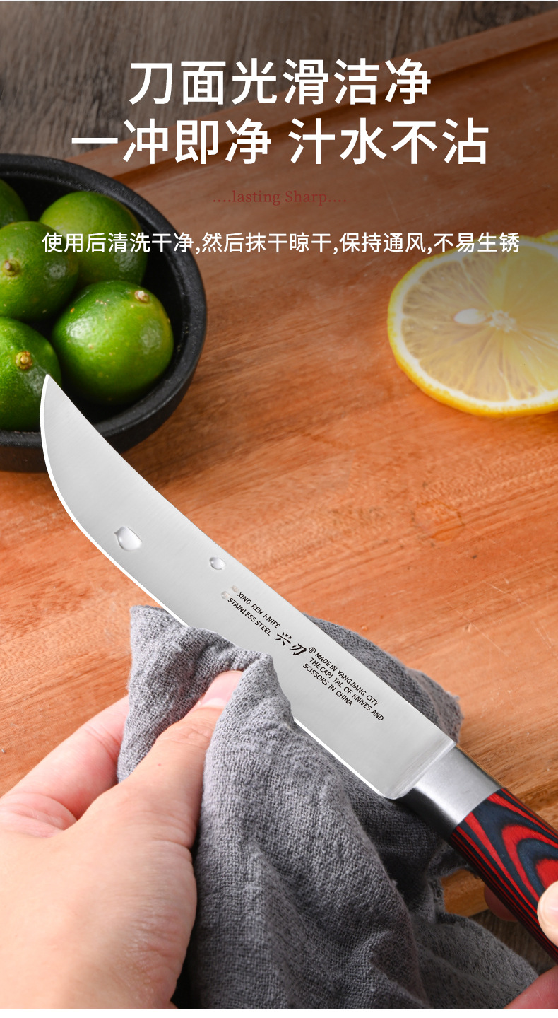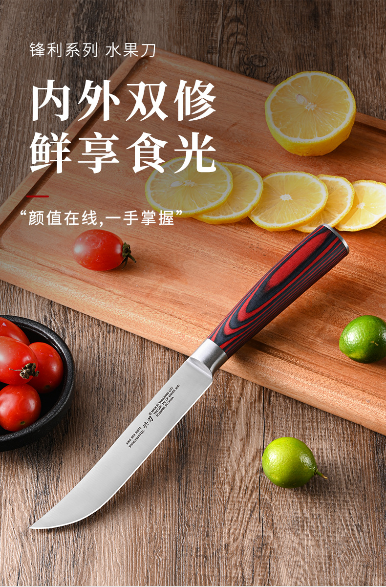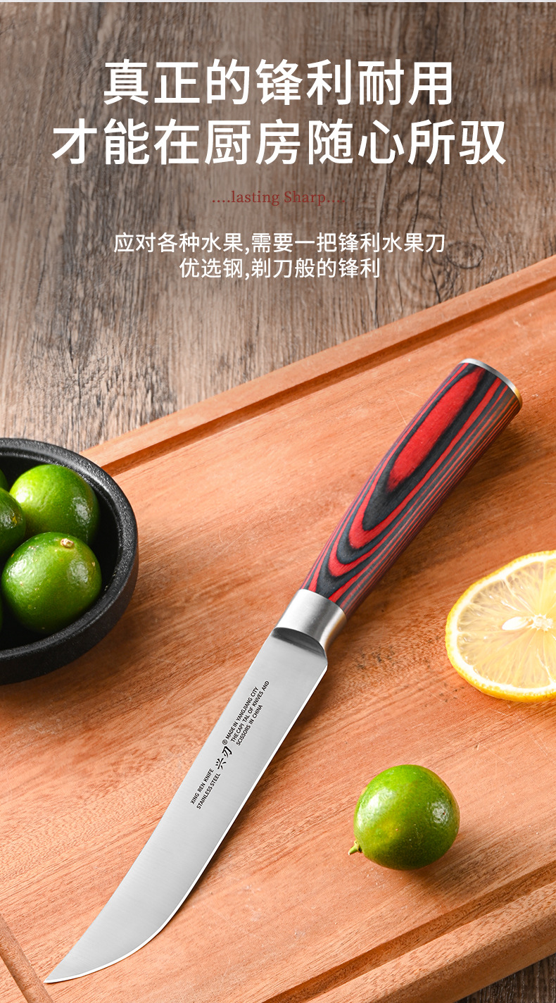 材质: 不锈钢 刀身材质: 3Cr系列钢 品牌: 兴刃 全刀长最大值: 24.5 产地: 阳江 货号: XR-GP1148 产品类别: 水果刀 价格段: 5-10元 是否有专利: 否 规格: 彩怒钢头水果1号 原产国/地区: 广东 是否进口: 否 是否跨境出口专供货源: 是 风格: 现代简约 主要销售地区: 南美,东南亚,中东 主要下游平台: 亚马逊,速卖通,LAZADA 有可授权的自有品牌: 否 版权: 无 刀尖角度: 60°以下 刃长: 12.5