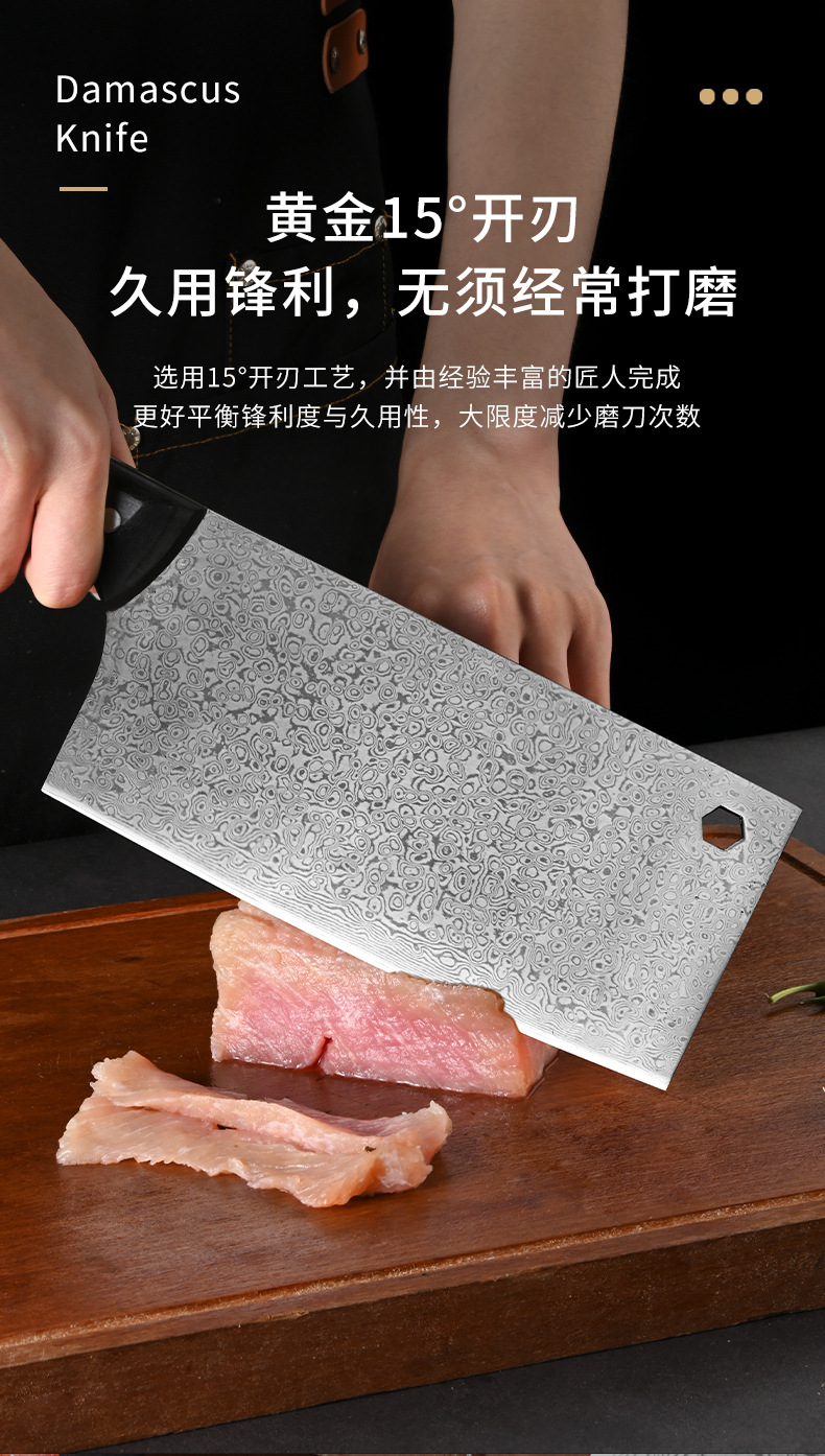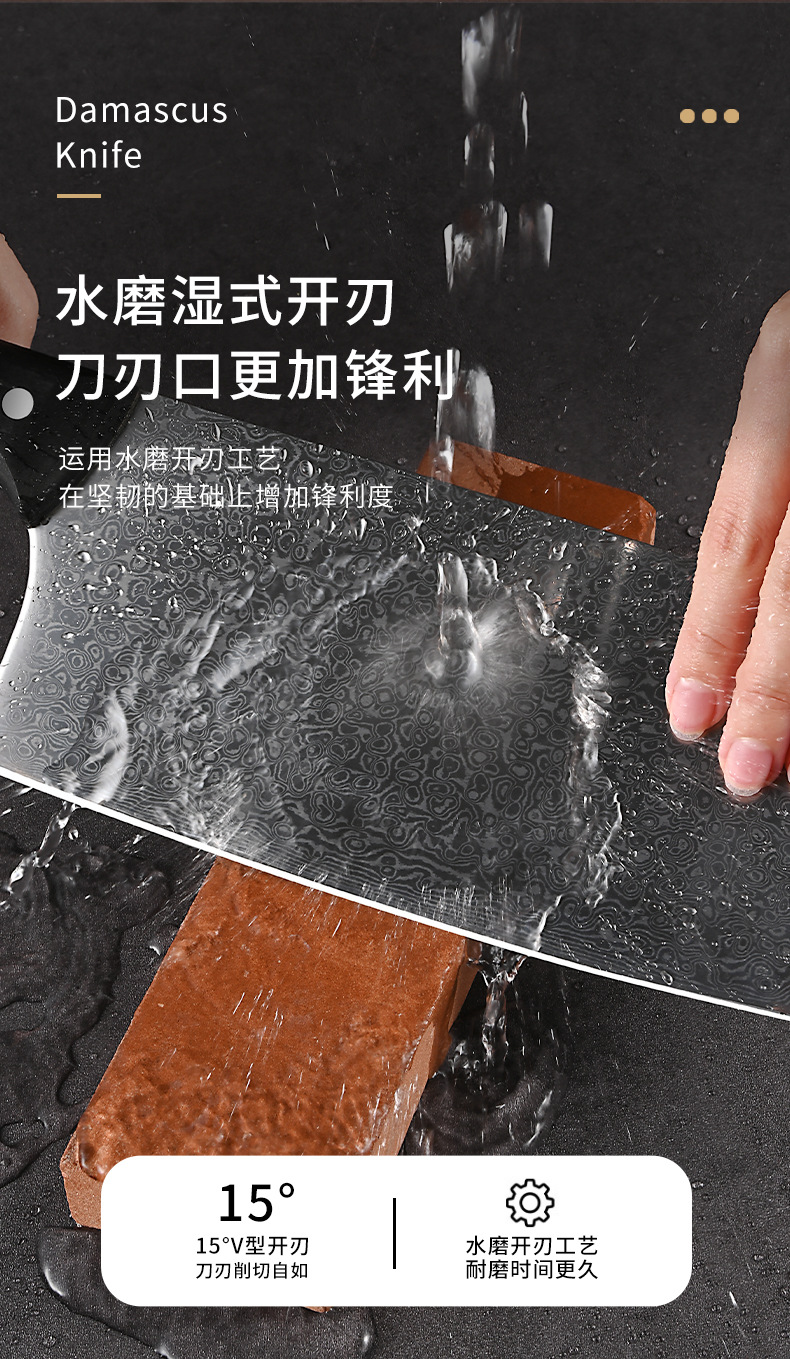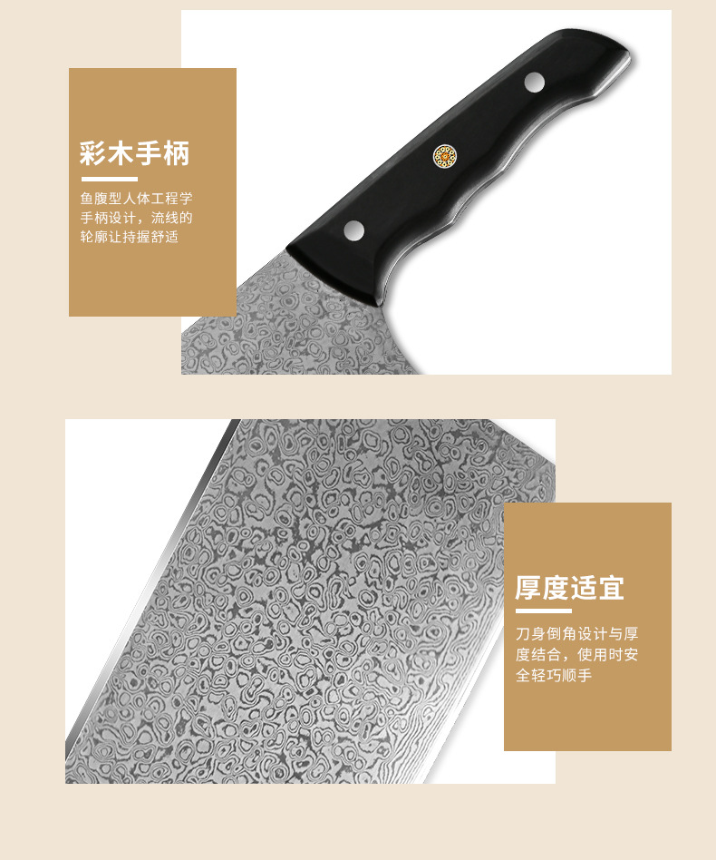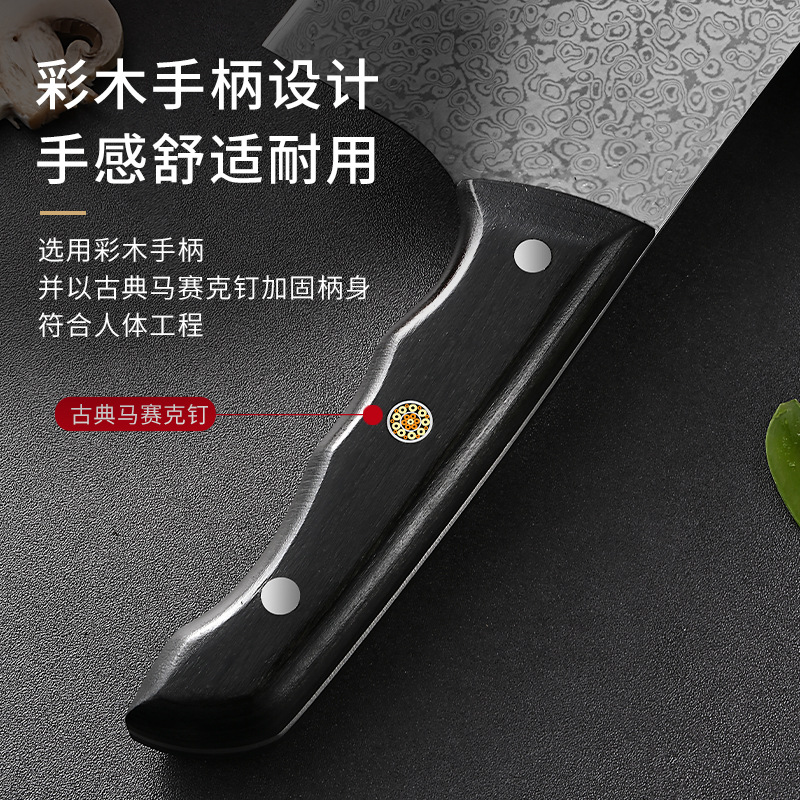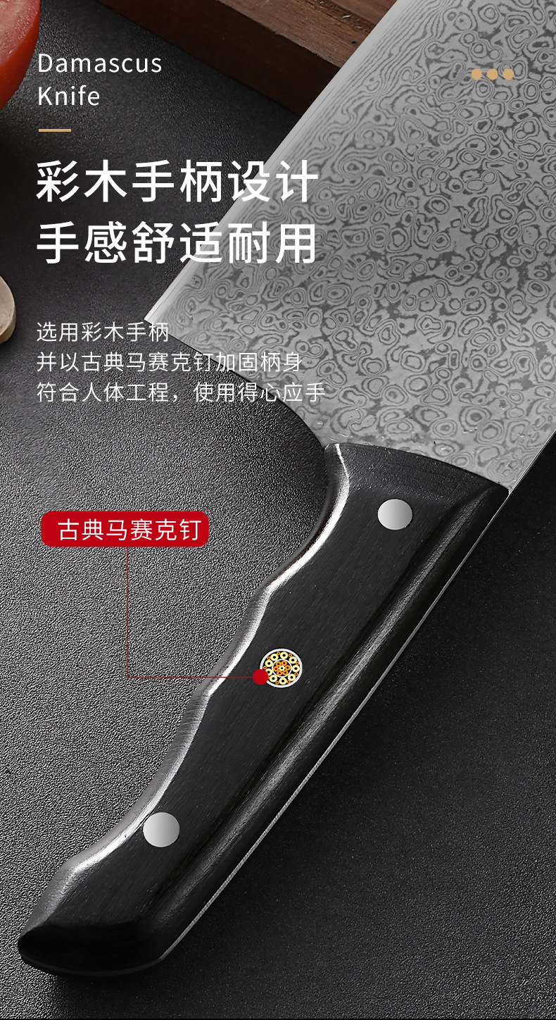 广东阳江大马士革家用菜刀酒店大厨用彩木手柄斩切刀湿式开刃厨刀 投诉