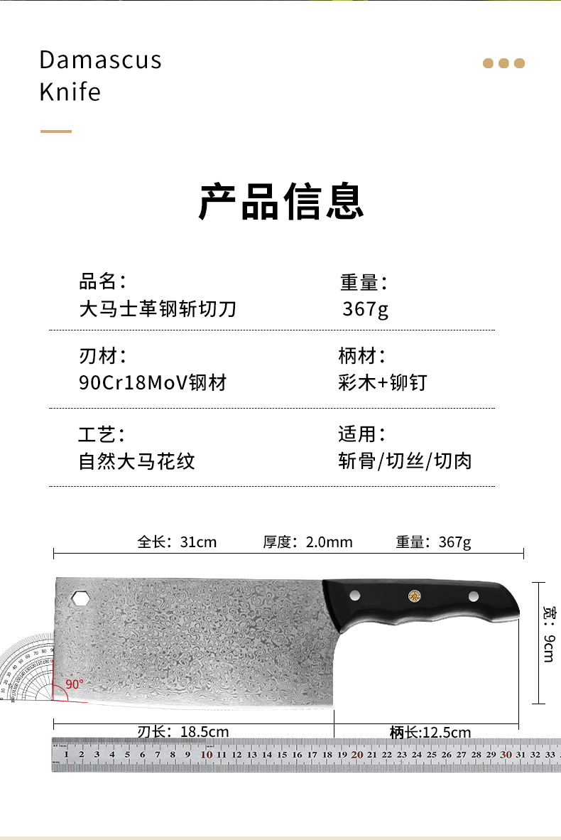 材质: 大马士革钢 品牌: 其他 刀身材质: 大马士革 产品类别: 菜刀 工艺: 大马士革 是否进口: 否 货号: XR-ZQD1258 加印LOGO: 可以 加工定制: 是 产品上市时间: 2025夏 价格段: 40-50元 是否有专利: 否 规格: 大马士革斩切刀(带彩盒包装) 有可授权的自有品牌: 否 是否跨境出口专供货源: 否 风格: 新中式 刀尖角度: 60°以上 刃长: 18.5 刀柄长: 12.5 全刀长最大值: 31