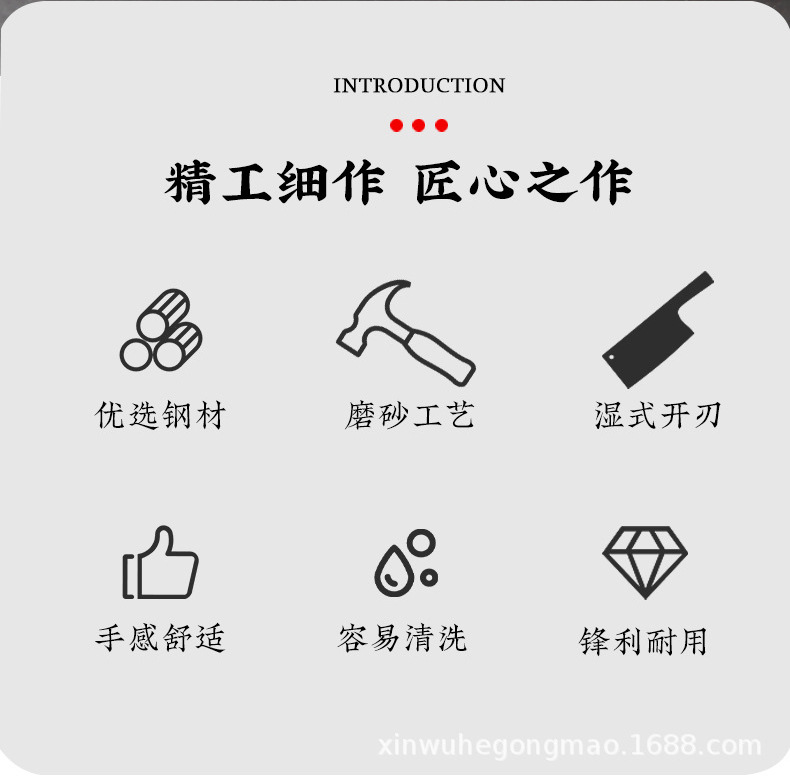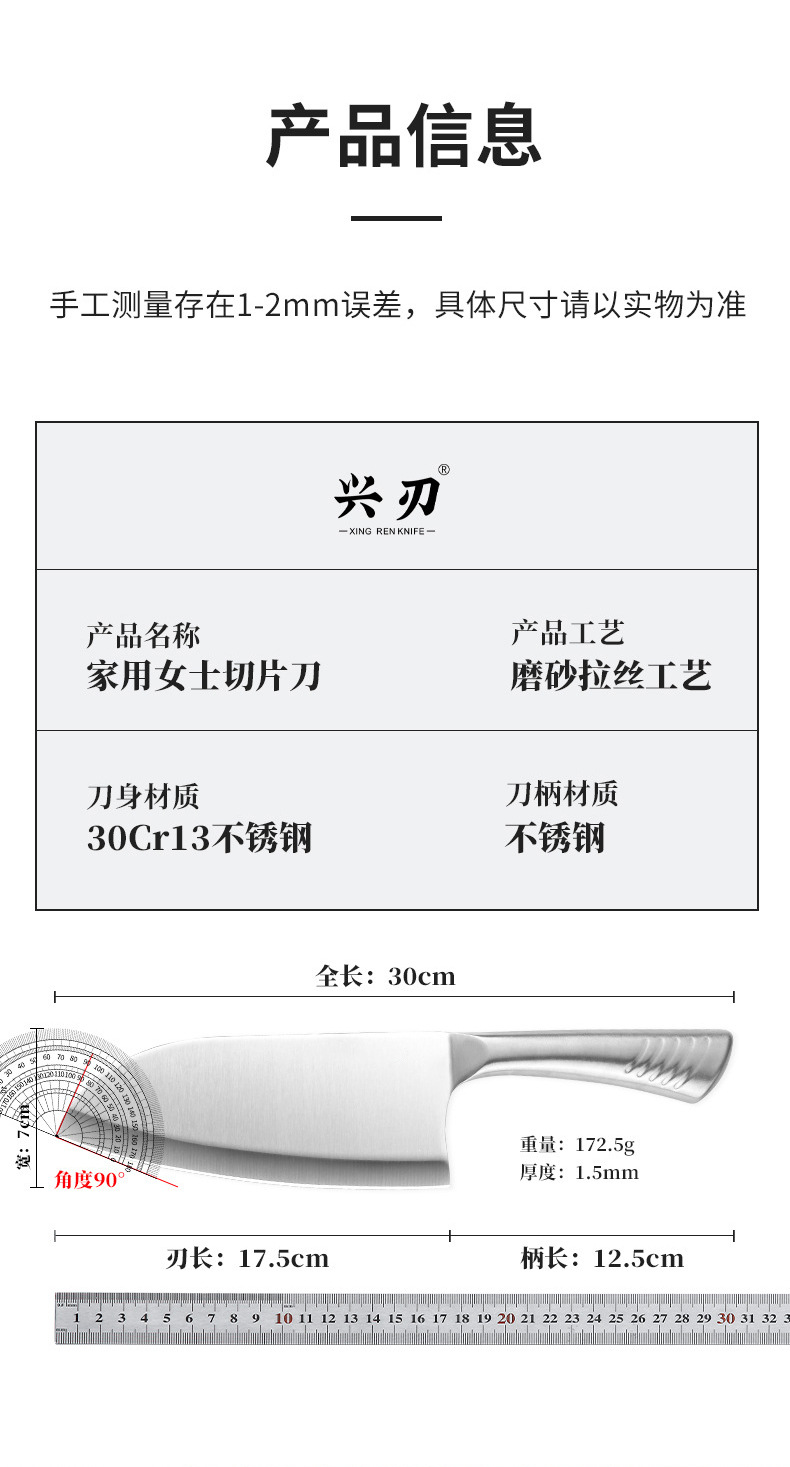 材质: 不锈钢 刀身材质: 3Cr系列钢 品牌: 兴刃 工艺: 镜面磨砂 产品类别: 菜刀 是否进口: 否 原产国/地区: 广东 货号: WG-CD1268 产地: 阳江 价格段: 5-10 是否有专利: 否 规格: 马蹄柄小菜刀 主要下游平台: 亚马逊,独立站,LAZADA 主要销售地区: 南美,东南亚,北美 有可授权的自有品牌: 是 是否跨境出口专供货源: 是 风格: 新中式 颜色: 灰色 刀尖角度: 60°以上 刃长: 17.5cm