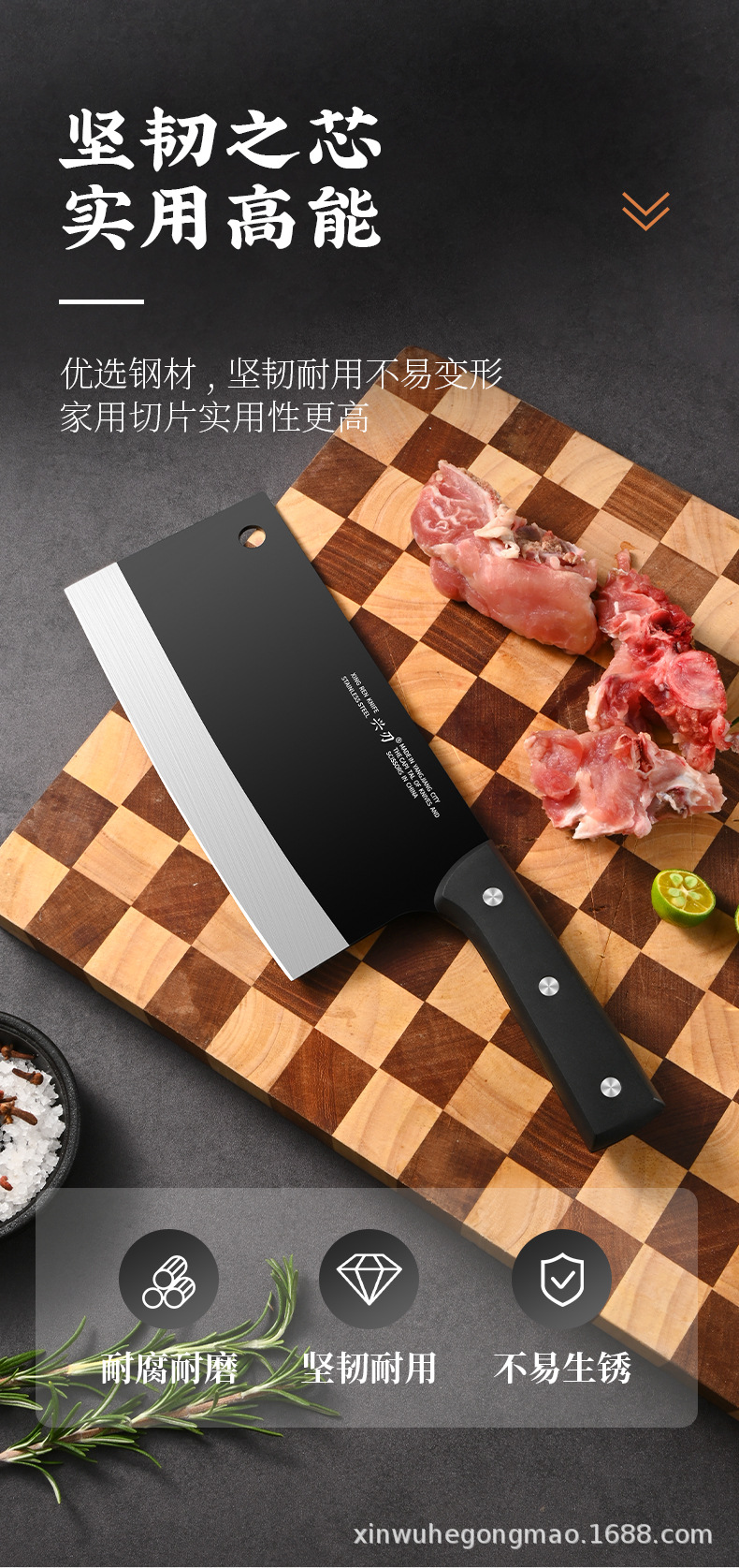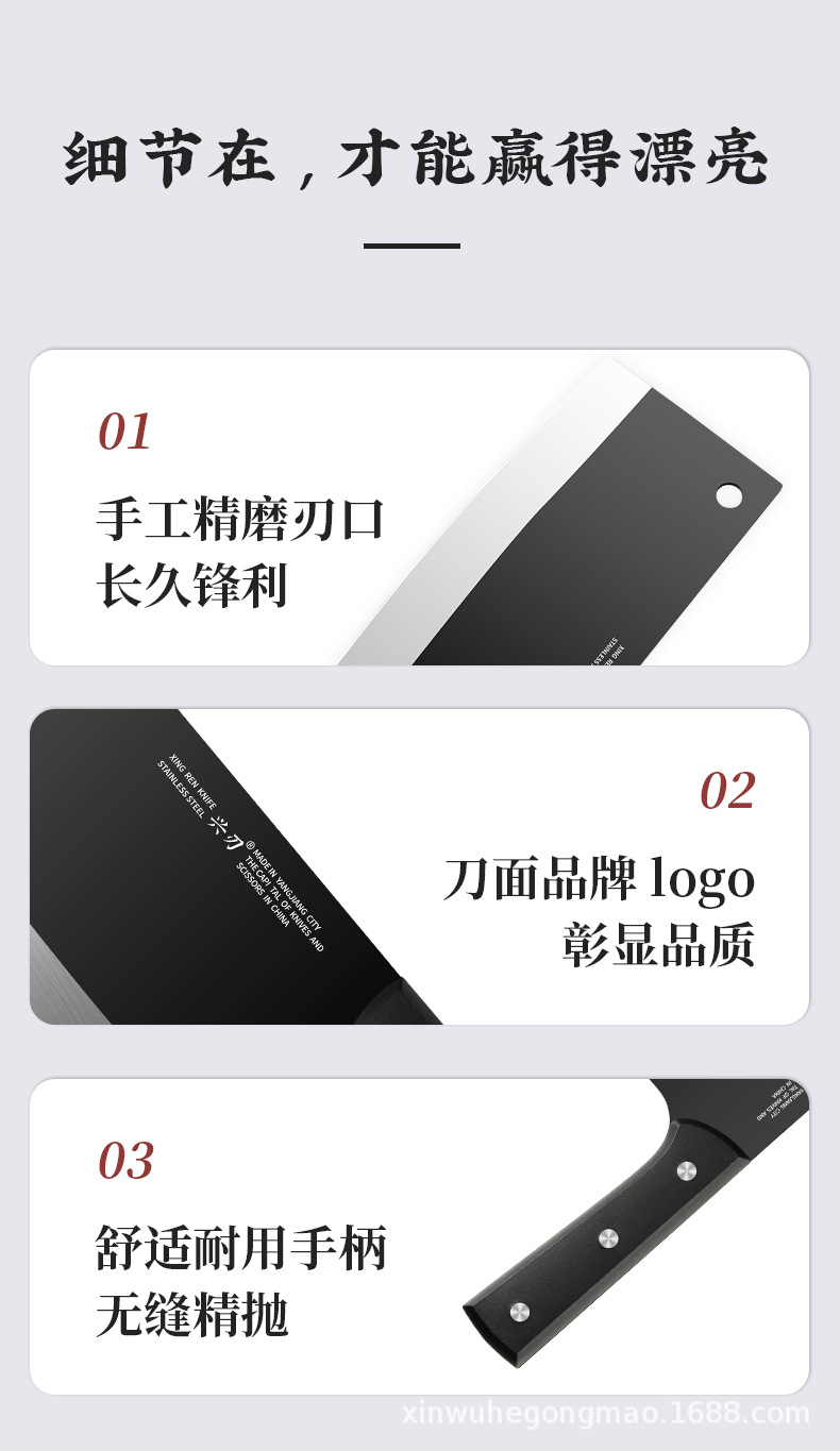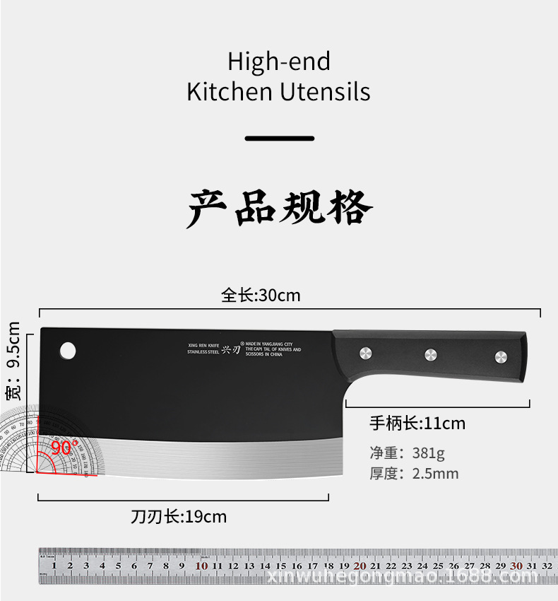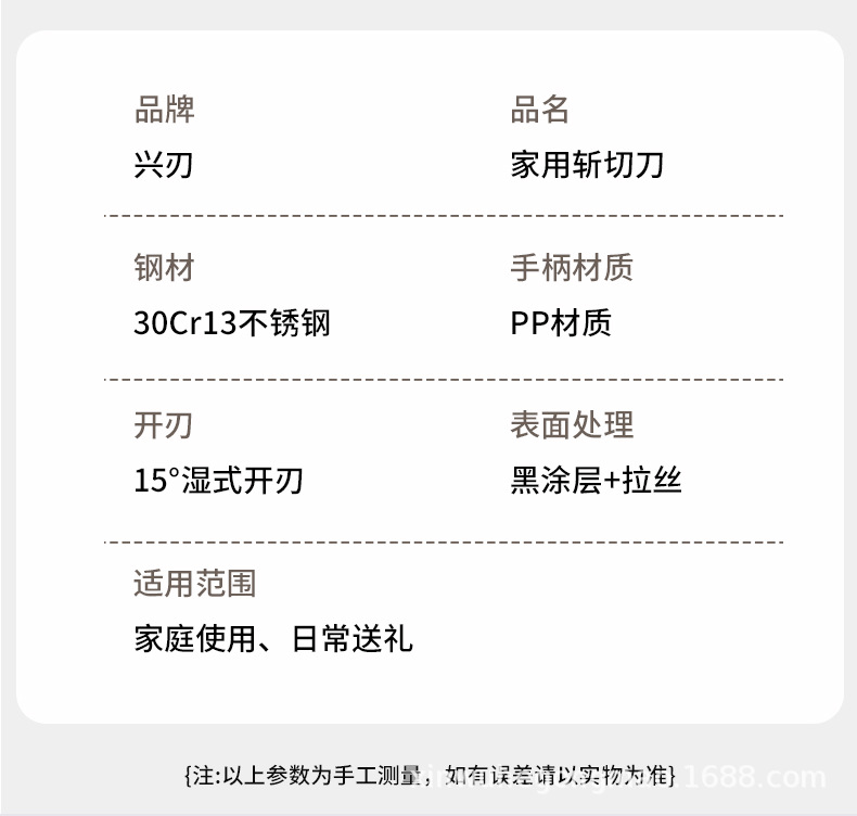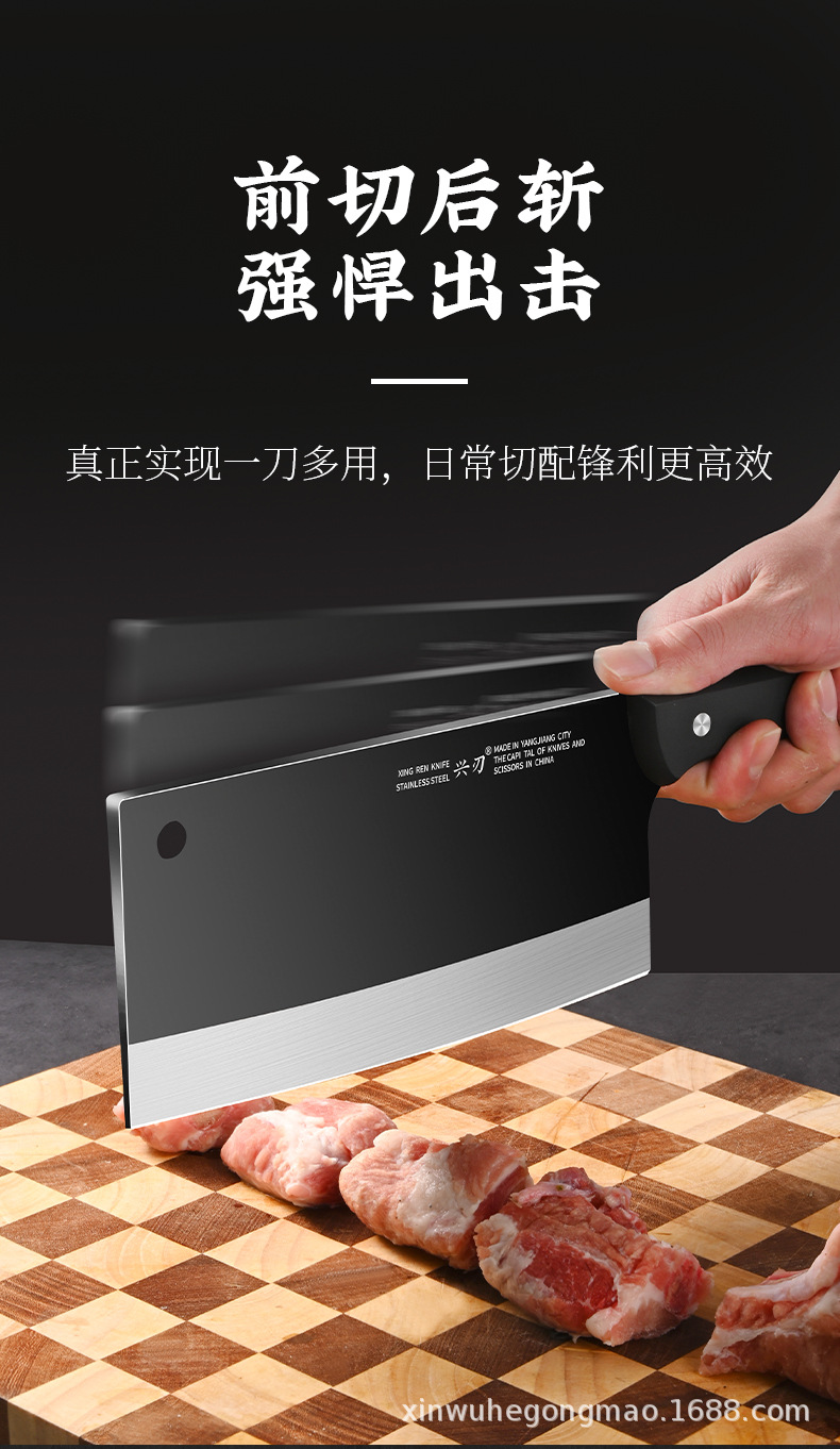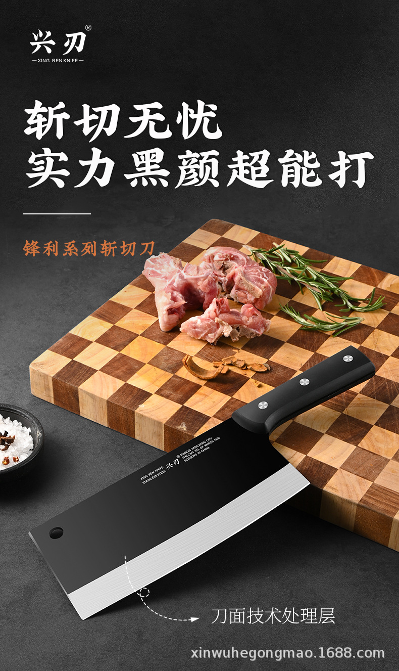 材质: 不锈钢 刀身材质: 3Cr系列钢 品牌: 兴刃 产品类别: 菜刀 是否进口: 否 原产国/地区: 广东 货号: XR-ZQD1193 产地: 阳江 价格段: 5-10 是否有专利: 否 规格: M8平面斩切刀2.5 主要下游平台: 亚马逊,独立站,LAZADA 主要销售地区: 南美,北美,东北亚 有可授权的自有品牌: 是 是否跨境出口专供货源: 是 风格: 新中式 颜色: 黑色 版权: 无 刀尖角度: 60°以上 刃长: 19cm
