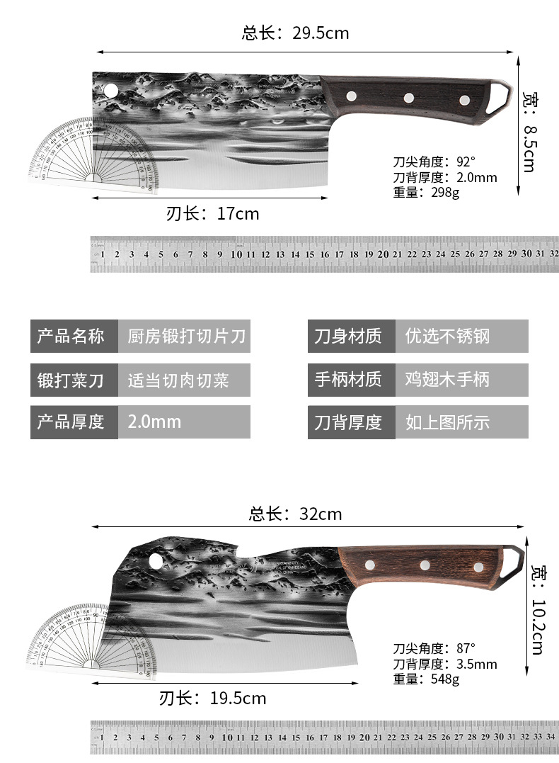 材质: 不锈钢 刀身材质: 不锈钢 品牌: 兴刃 工艺: 锻打工艺 产品类别: 菜刀 是否进口: 否 原产国/地区: 广东 货号: DY-473 产地: 阳江 价格段: 10-30 是否有专利: 否 规格: 2厘尾扣切片刀,3.5厘尾扣砍骨刀 有可授权的自有品牌: 否 是否跨境出口专供货源: 否 风格: 新中式 颜色: 鸡翅木手柄 版权: 无 刀尖角度: 60°以上 刃长: 17 刀柄长: 12.5