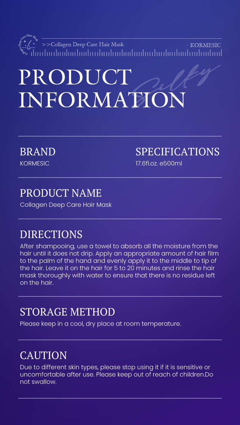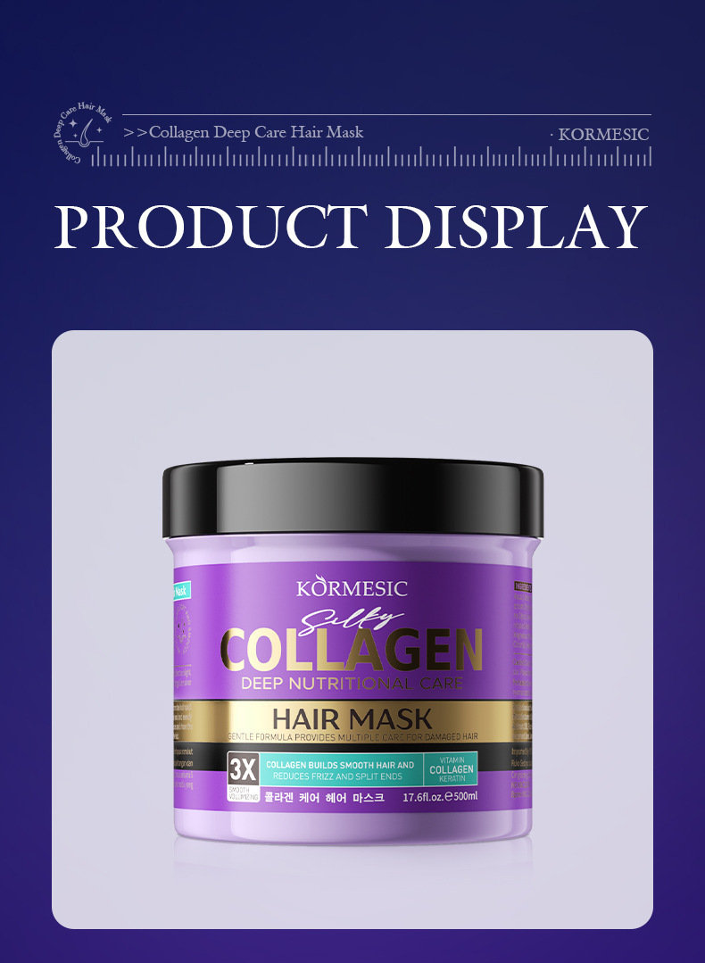 品牌: KORMESIC 功效: 补水 适用发质: 通用 产品类别: 发膜、倒膜 香型: 草本香 护发用品: 发膜 适用人群: 青年 品牌类型: 国货品牌 是否进口: 否 产地: 广东 商品条形码: 8994462432030 货号: NO.KMC32030 箱装数量: 360 生产许可证号: 粤妆20230009 是否促销装: 否 适用性别: 通用 毛重: / 包装体积: / 净含量: 胶原蛋白深层护理发膜500ml[仅供外贸 主要下游平台: ebay,亚马逊,wish,速卖通,独立 重量: 0.5 kg/罐 装箱信息:长宽高:1X1X1cm 装箱重量: 1KG 装箱数量:1pcs