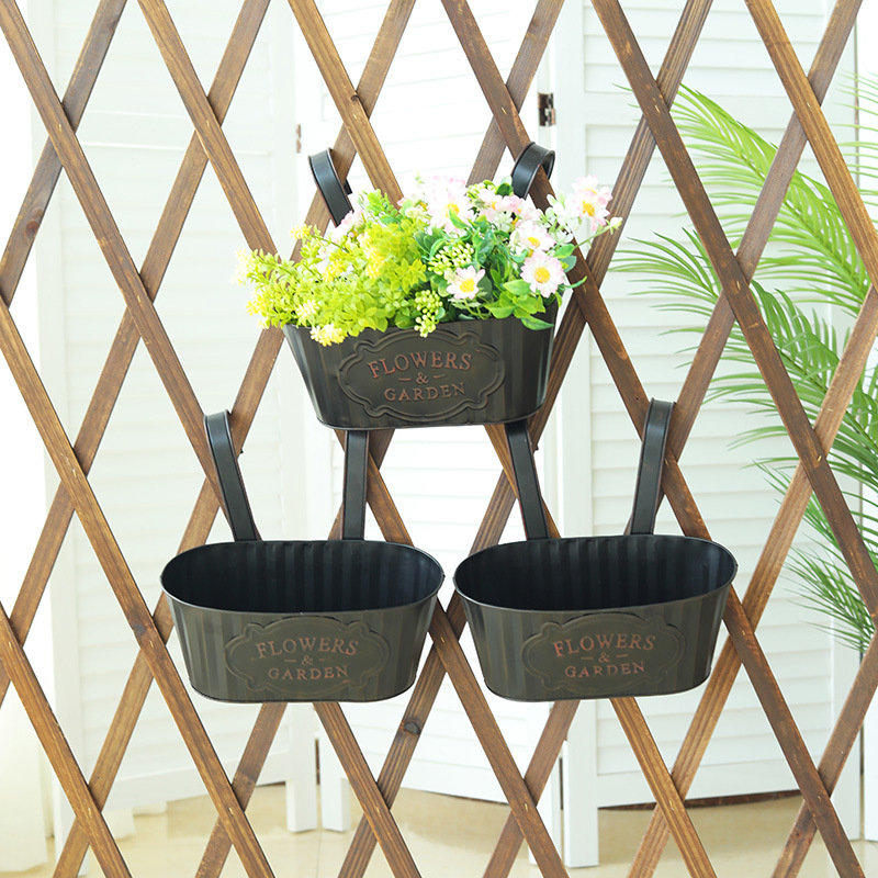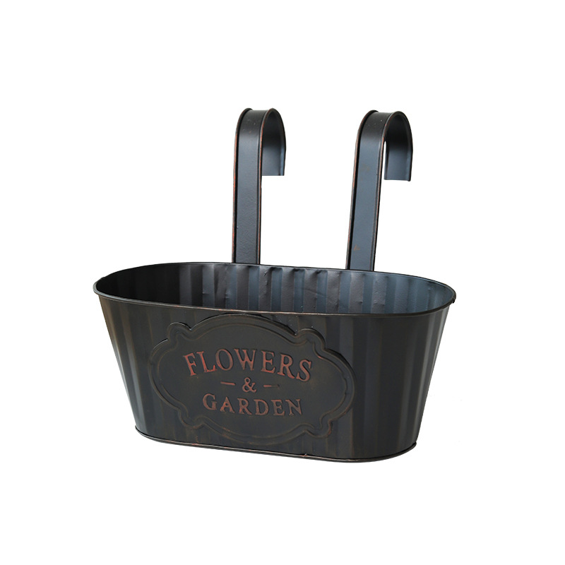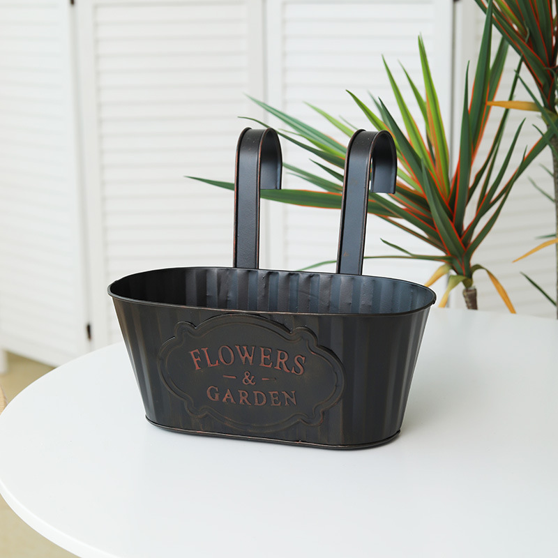 跨境黑色做旧椭圆挂盆美式铁皮壁挂花盆可拆卸把手悬挂装饰铁花盆