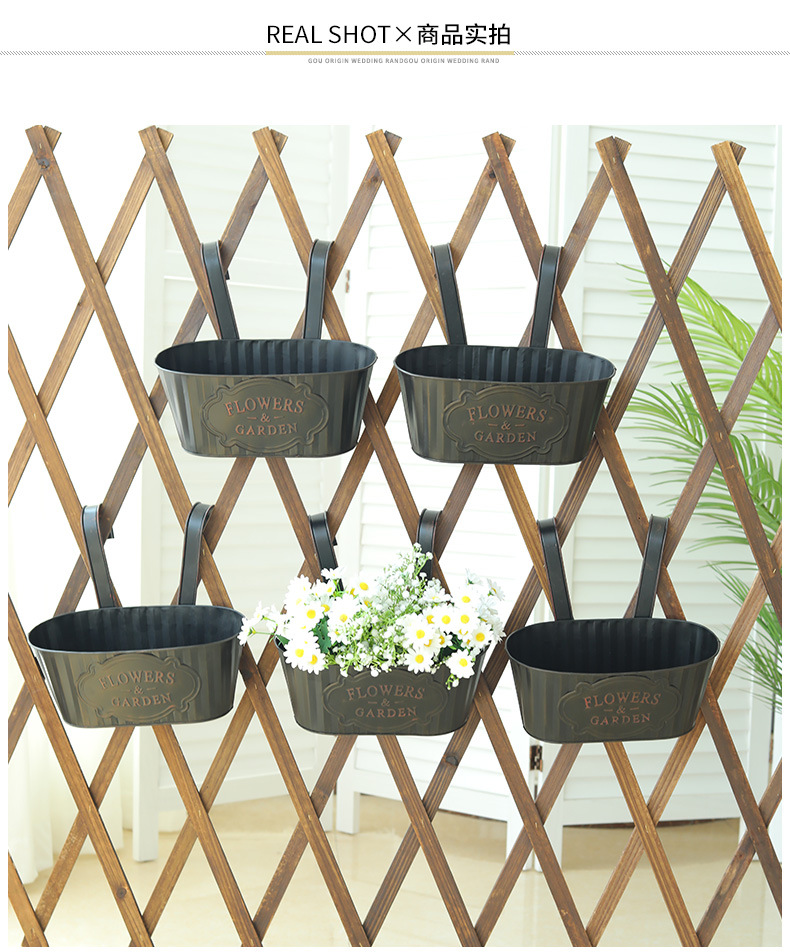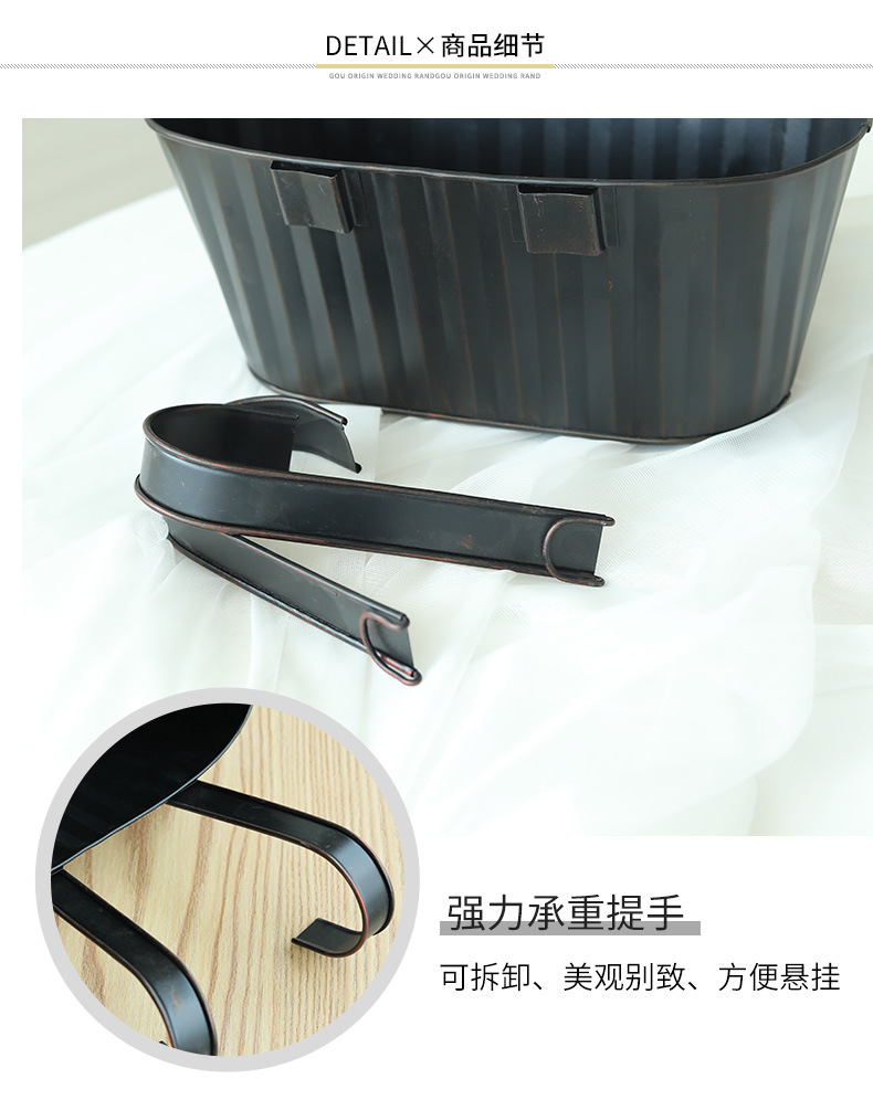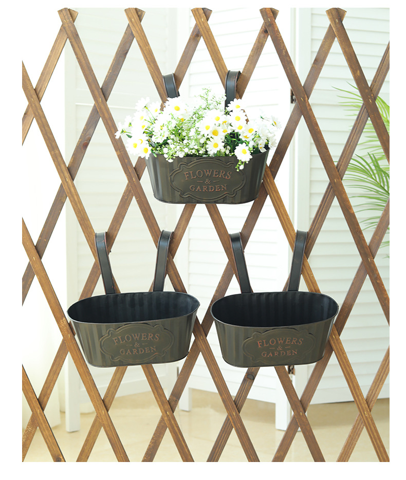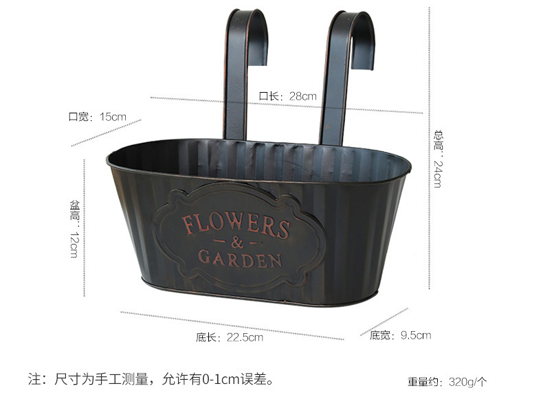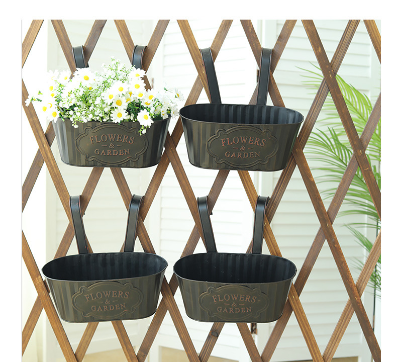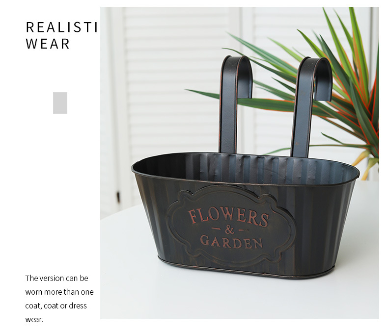 跨境黑色做旧椭圆挂盆美式铁皮壁挂花盆可拆卸把手悬挂装饰铁花盆 投诉
