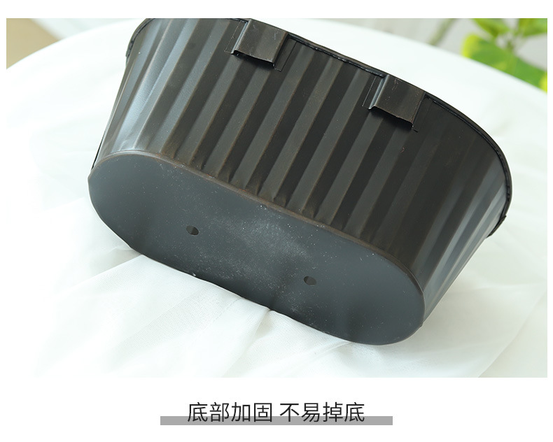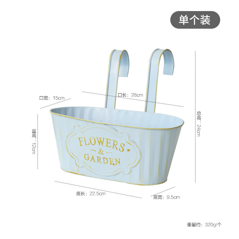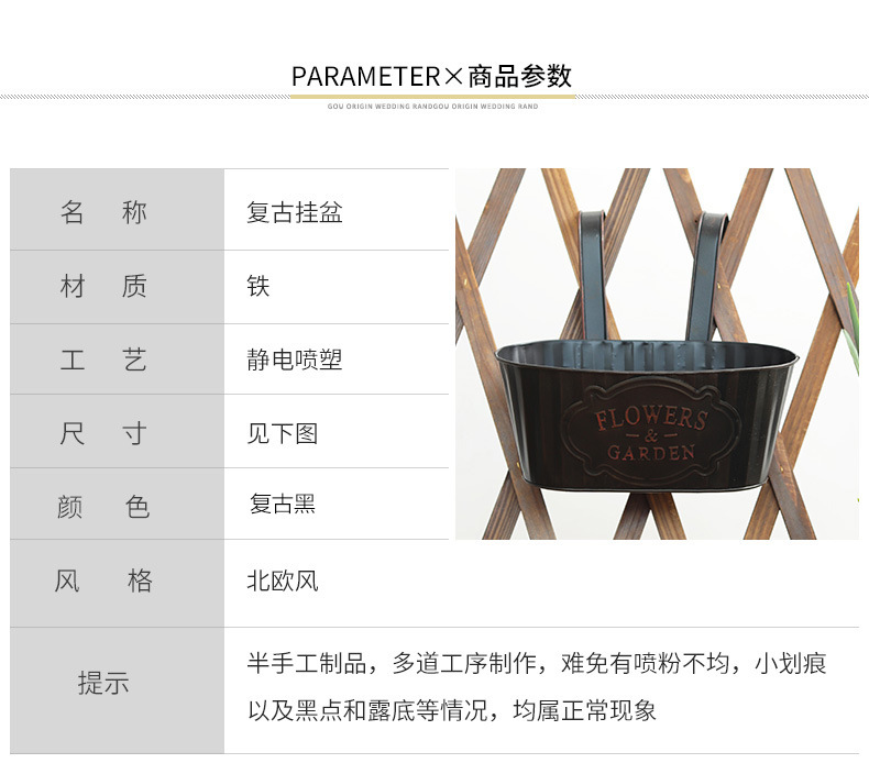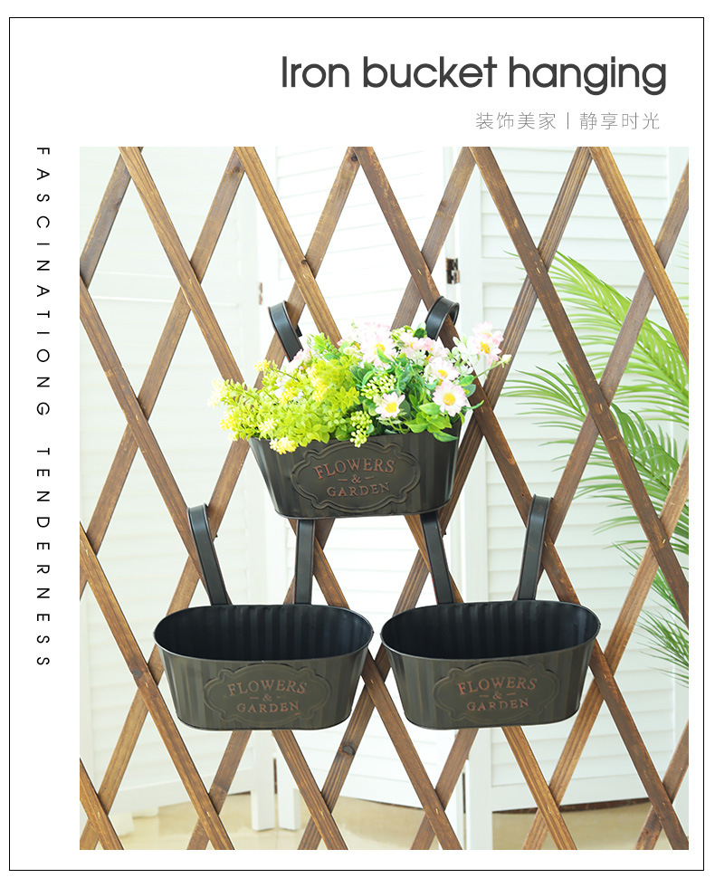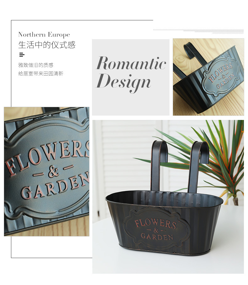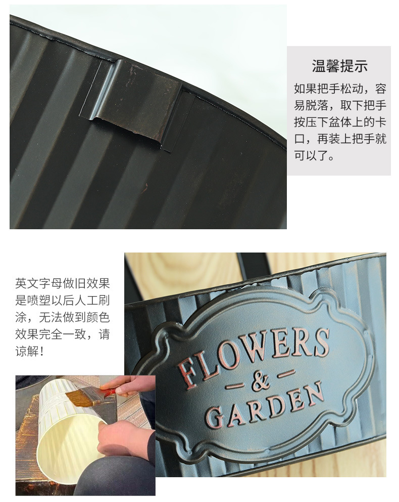 跨境黑色做旧椭圆挂盆美式铁皮壁挂花盆可拆卸把手悬挂装饰铁花盆 投诉