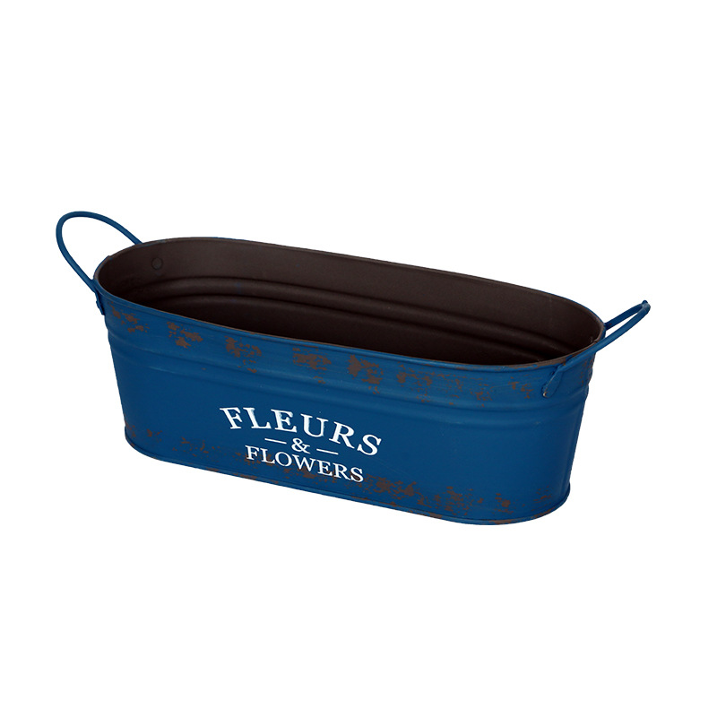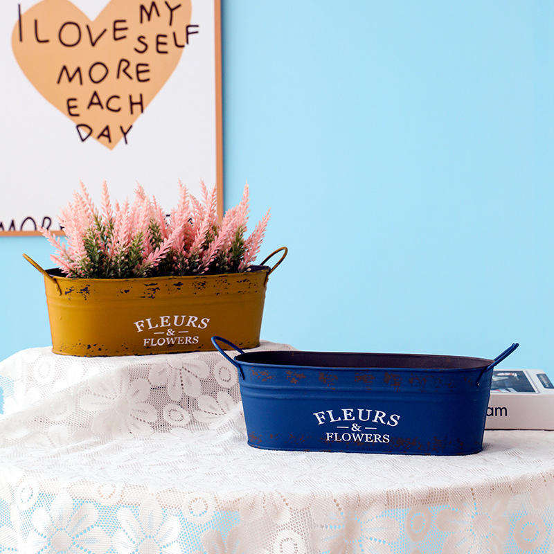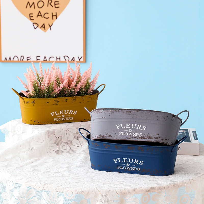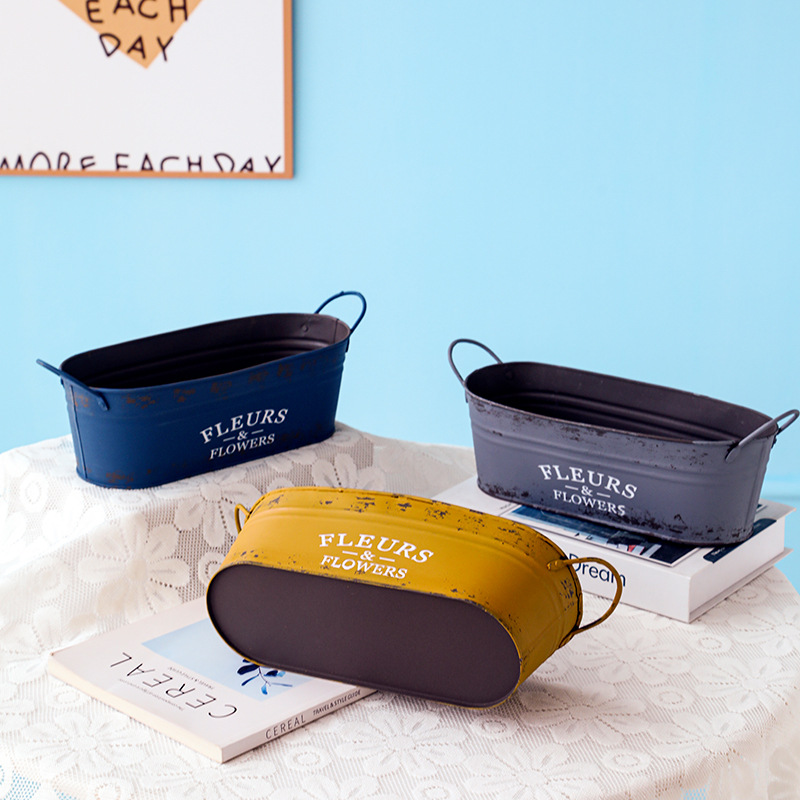 跨境复古做旧花盆椭圆形铁皮桶花桶花店阳台收纳铁艺多肉植物花器