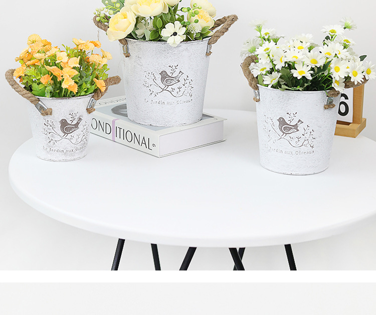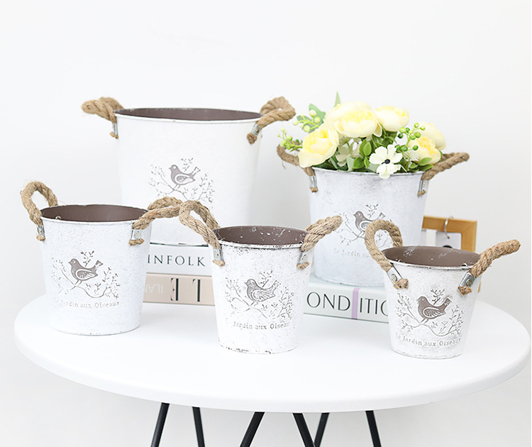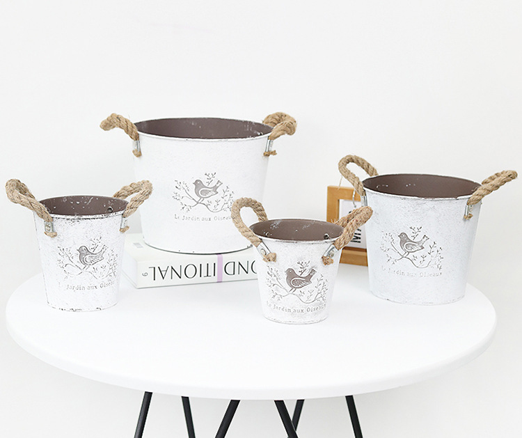 复古做旧刷白铁皮花盆多肉绿植小鸟图案铁艺花盆室内桌面装饰花盆