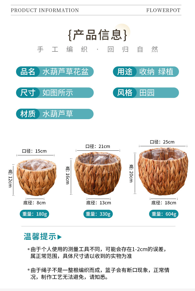 材质: 草编 特性: 其他 类型: 花盆 品牌: 愚美人 使用形式: 桌面式,落地式 应用场景: 办公室,家居摆设,家庭园艺,阳台菜园 工艺: 手工 是否进口: 否 风格: 欧式 货号: 水葫芦花盆