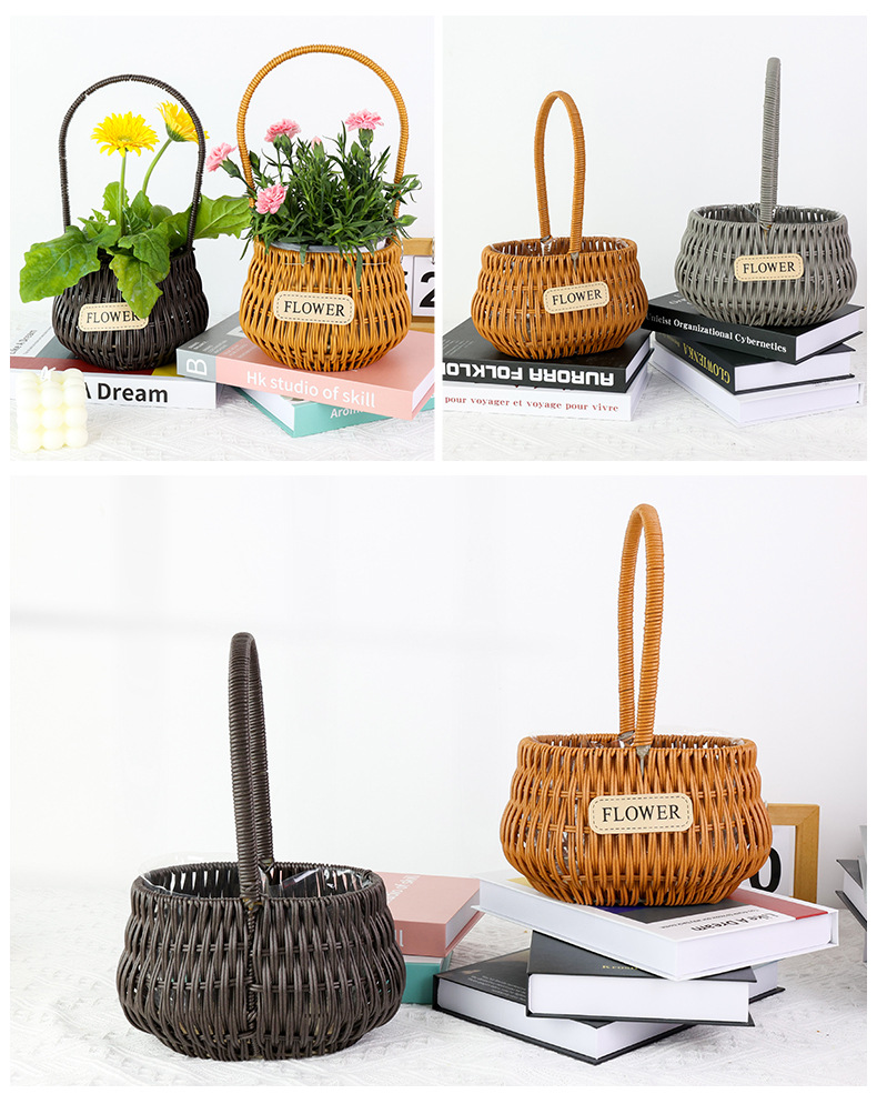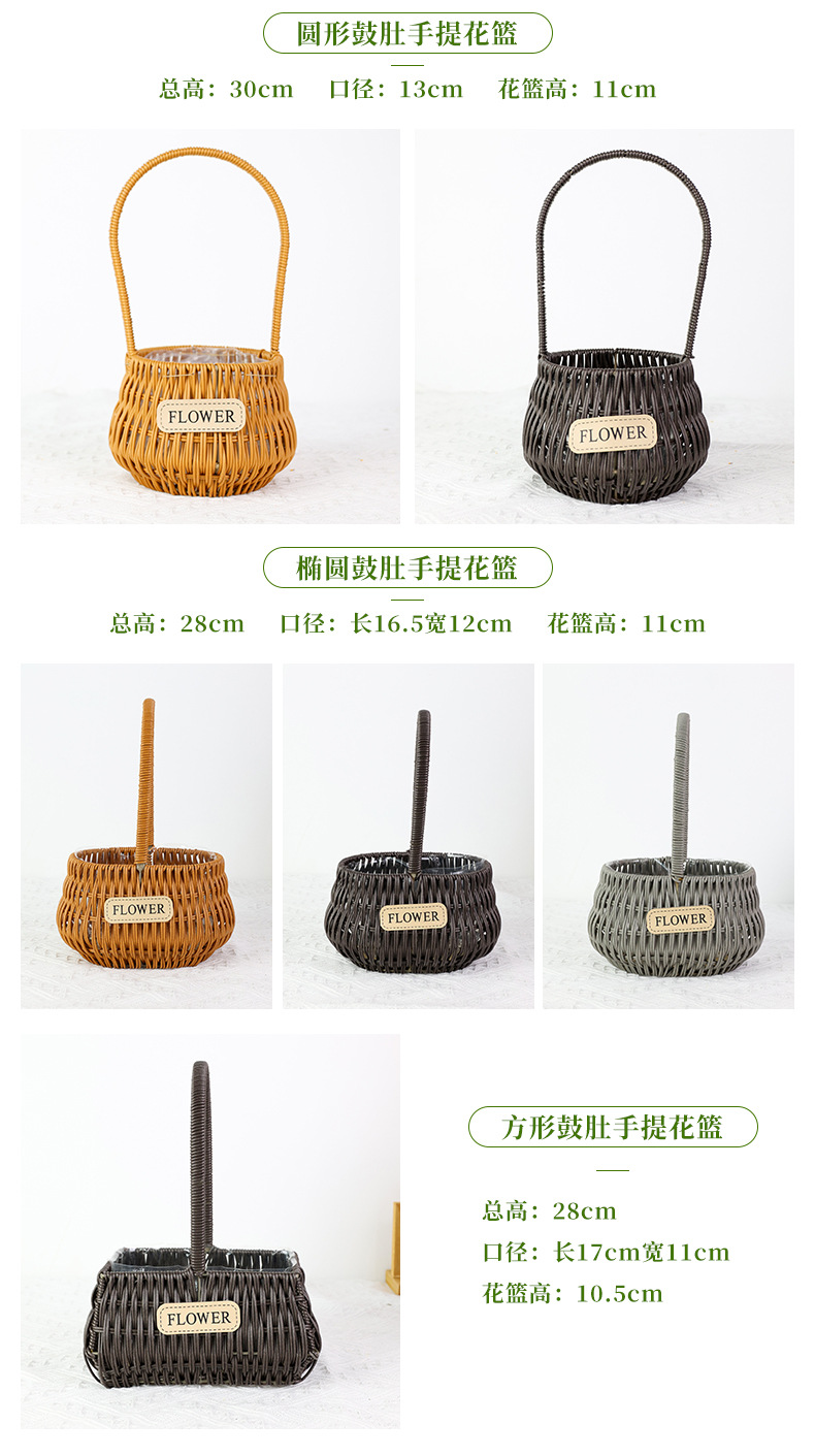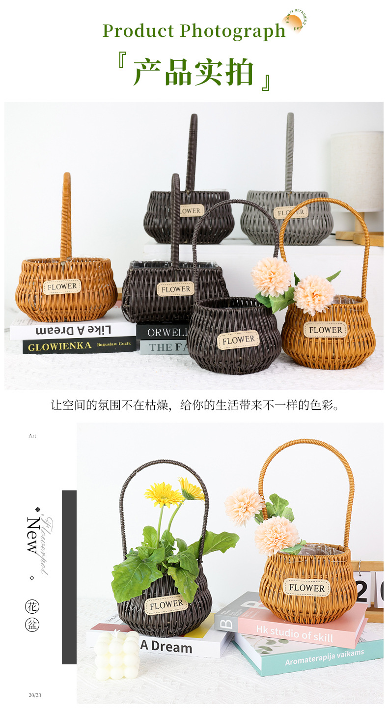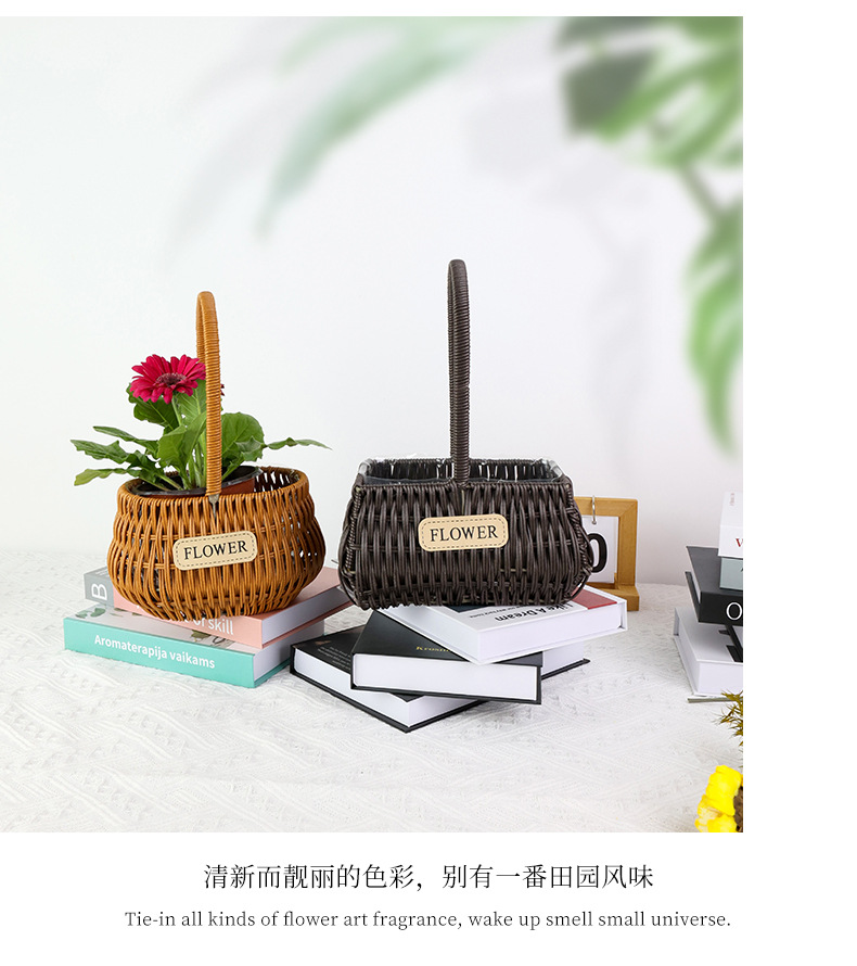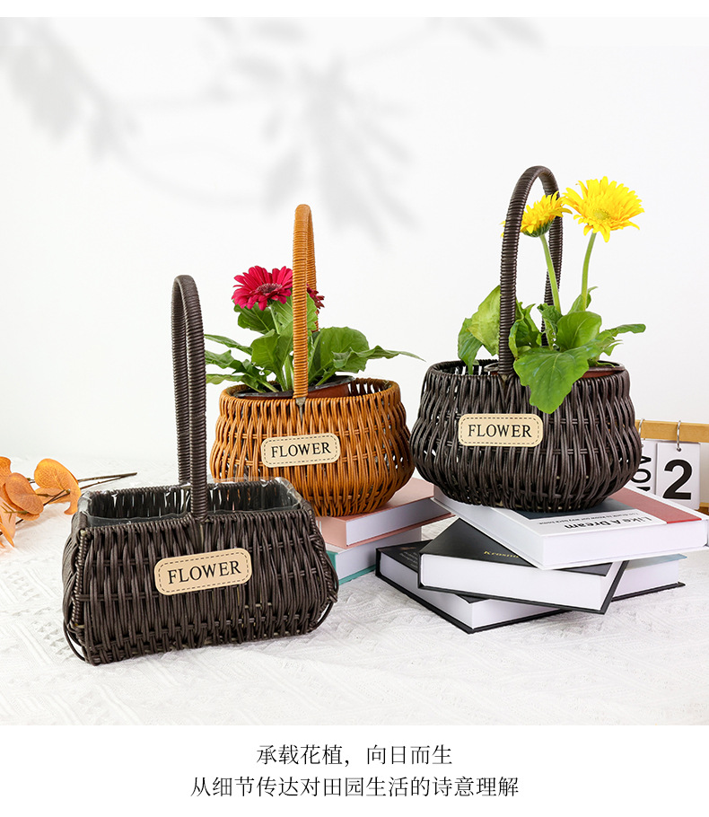 材质: 塑料原料 特性: 其他 类型: 花盆 品牌: 愚美人 使用形式: 组合式,桌面式,落地式,吊盆式 应用场景: 花圃苗圃生产,其他 工艺: 藤编 是否进口: 否 风格: 田园 货号: flower仿藤编手提花篮