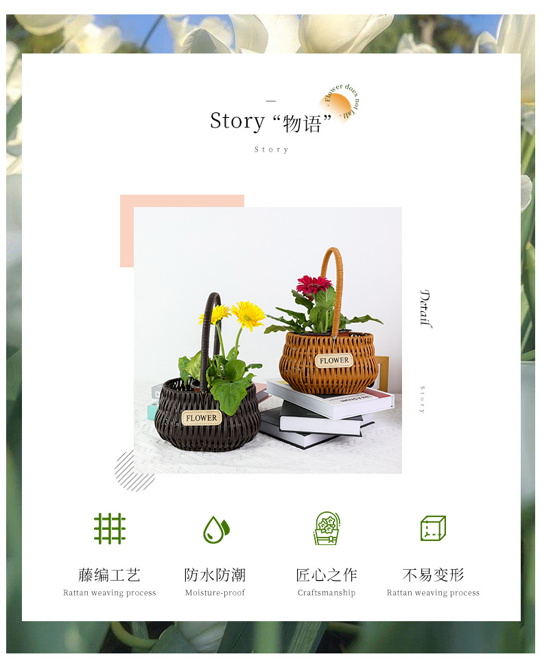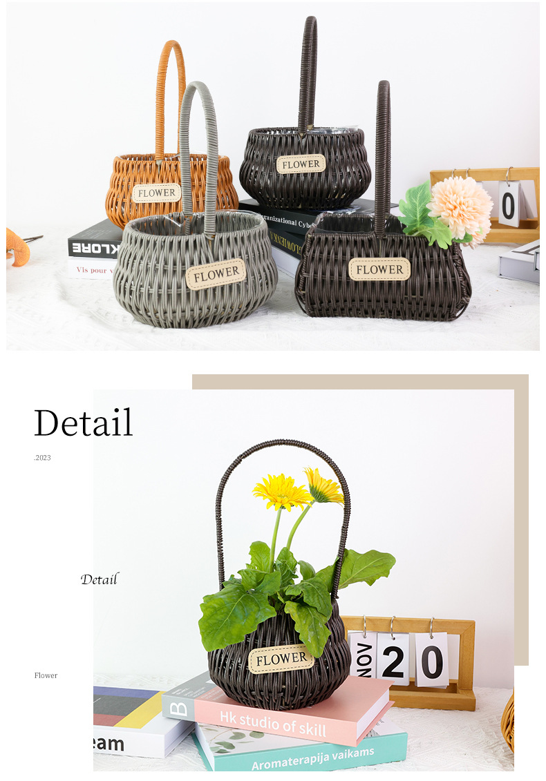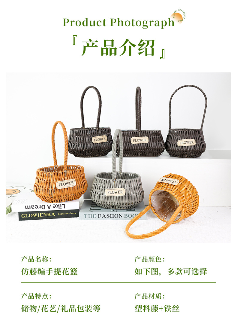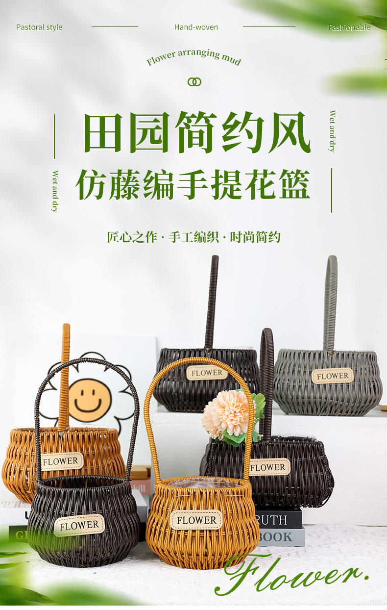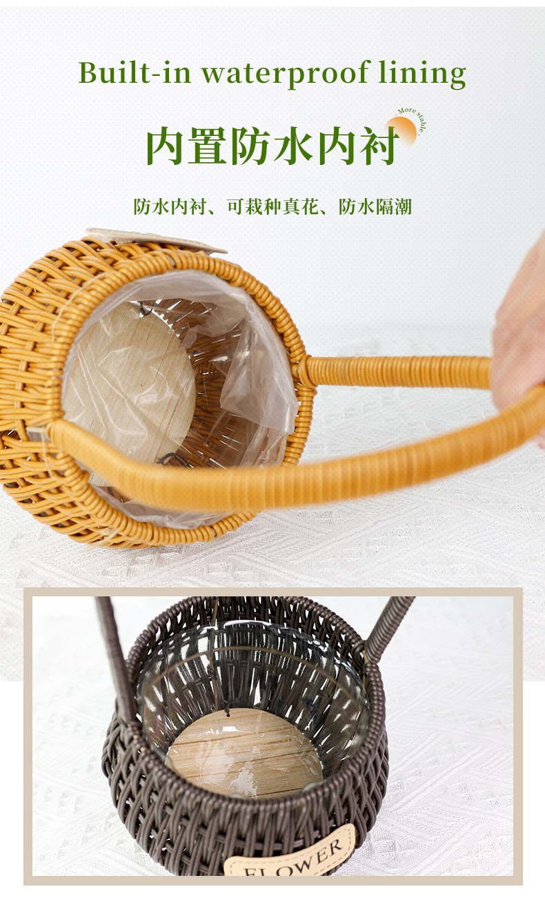 材质: 塑料原料 特性: 其他 类型: 花盆 品牌: 愚美人 使用形式: 组合式,桌面式,落地式,吊盆式 应用场景: 花圃苗圃生产,其他 工艺: 藤编 是否进口: 否 风格: 田园 货号: flower仿藤编手提花篮