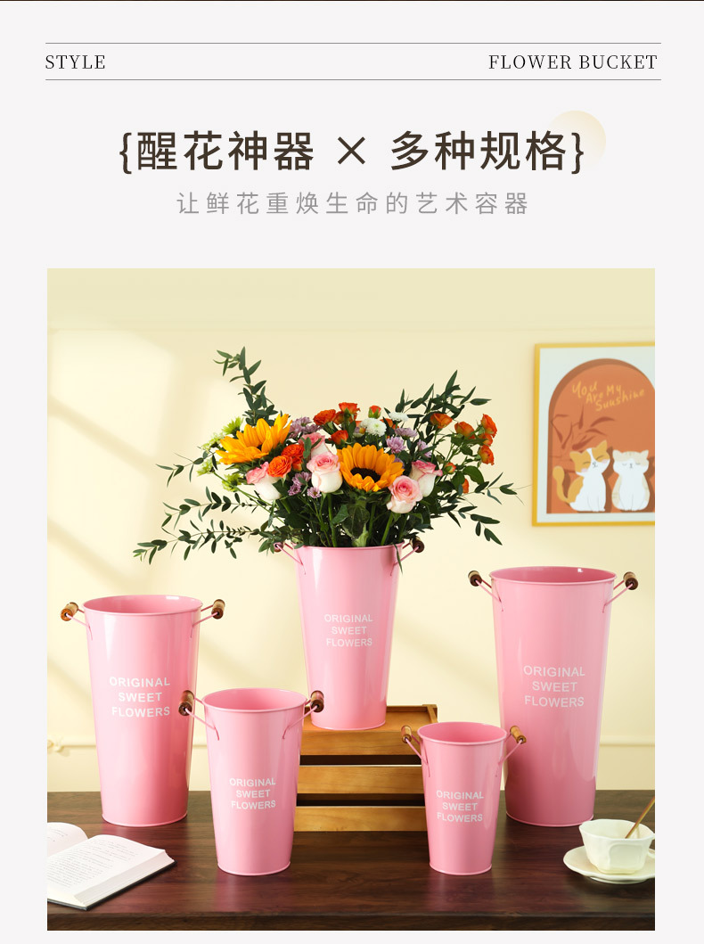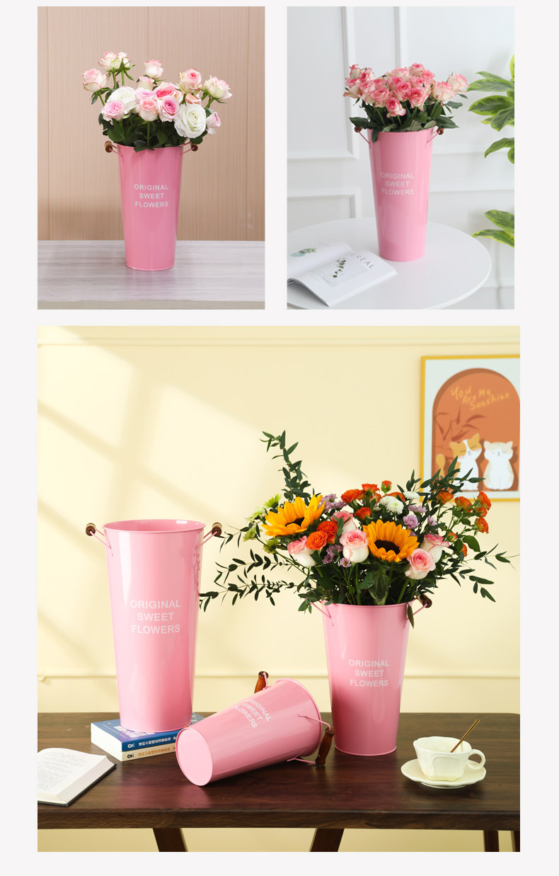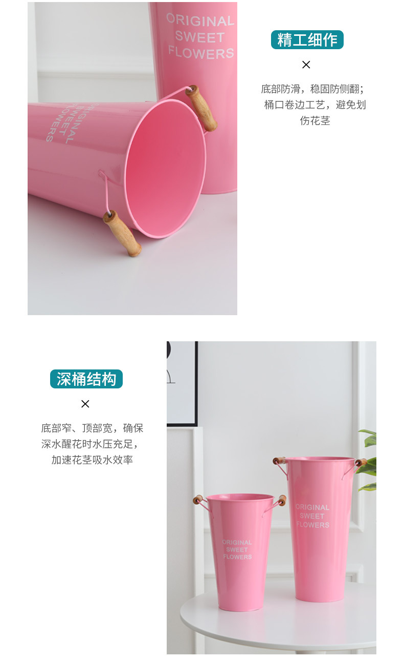 北欧风家用木把粉醒花桶花店鲜花花桶装饰铁皮插花深水养花大花 投诉