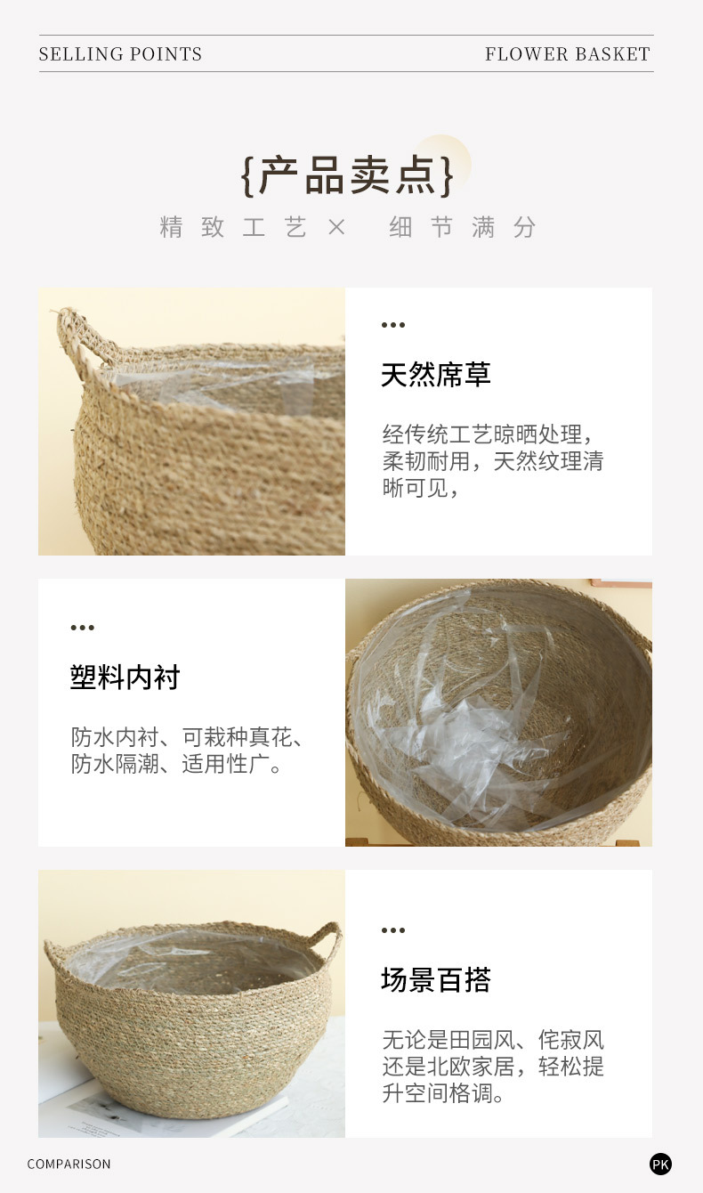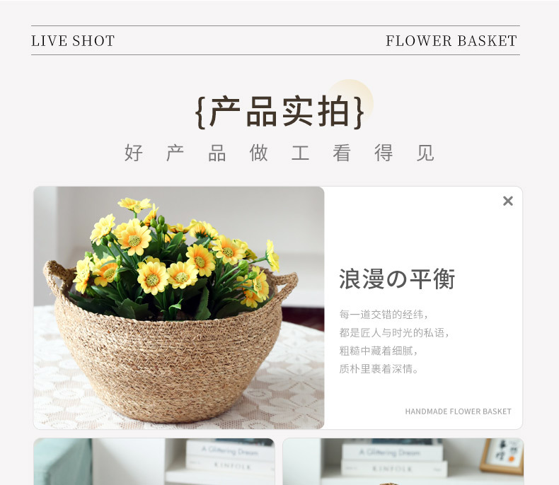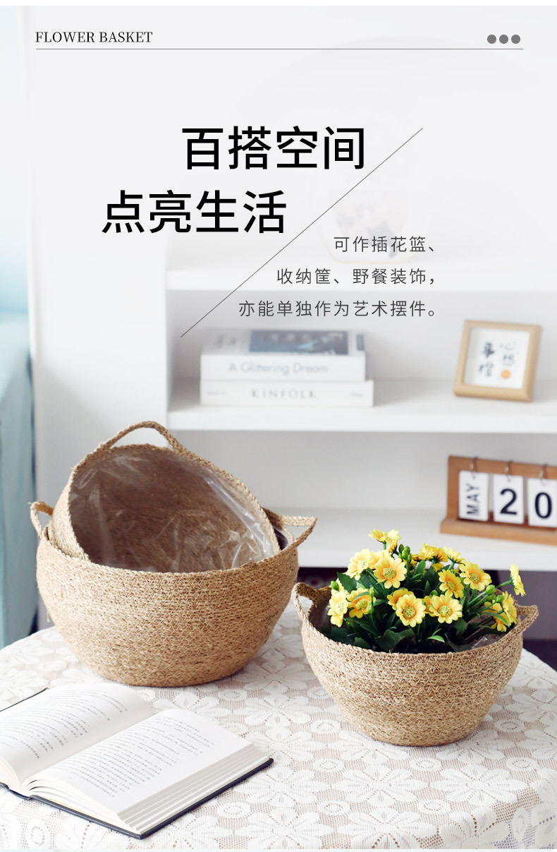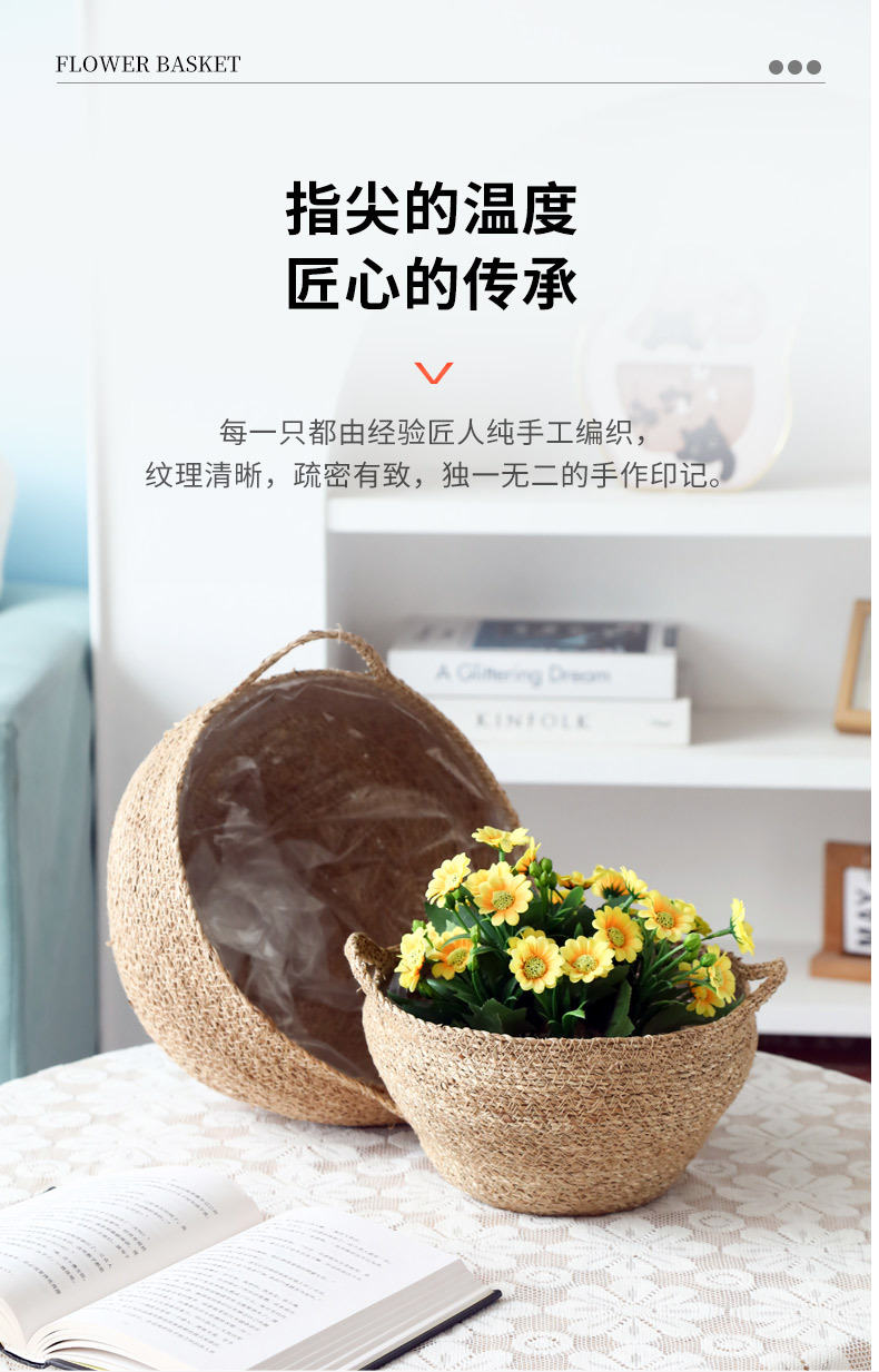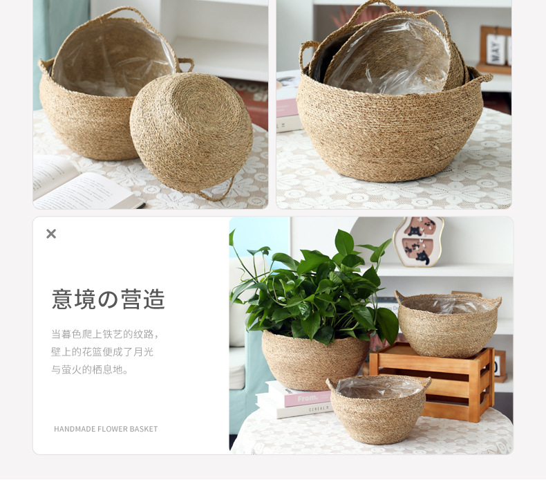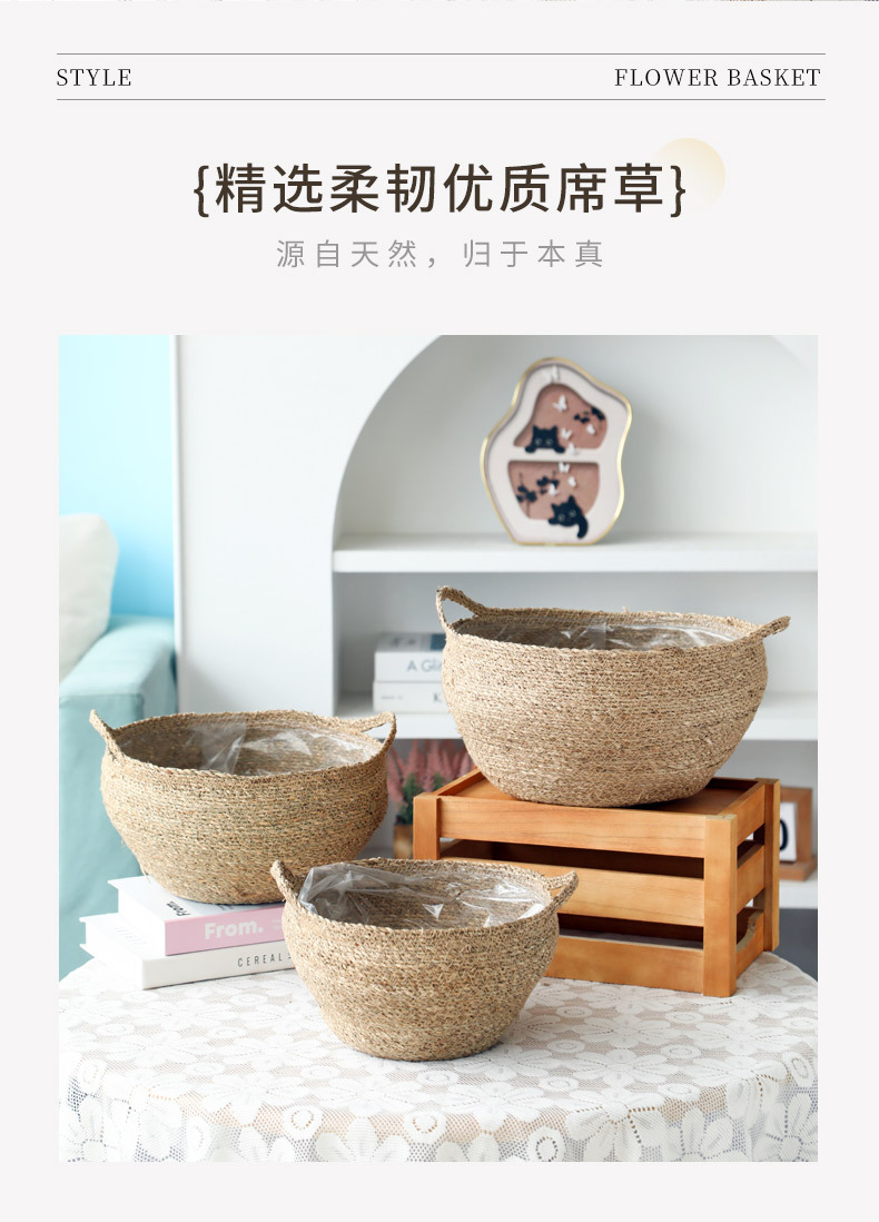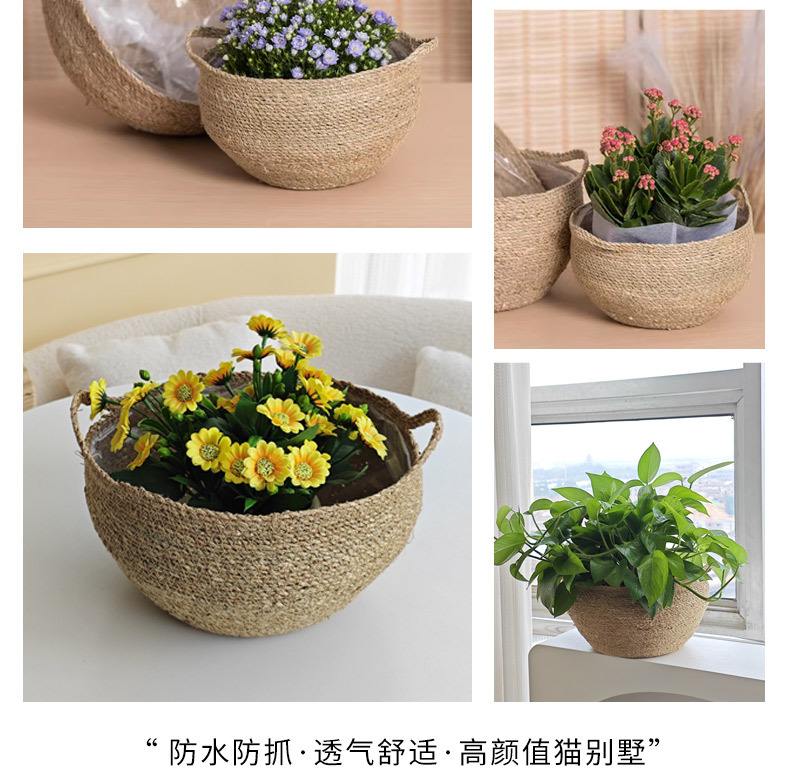 材质: 草编 特性: 可降解,节水抗旱 类型: 花盆 品牌: 愚美人 使用形式: 组合式,桌面式,落地式 应用场景: 办公室,酒店,家居摆设,商场,家庭园艺 工艺: 编织 是否进口: 否 风格: 田园 货号: 草编编织篮子