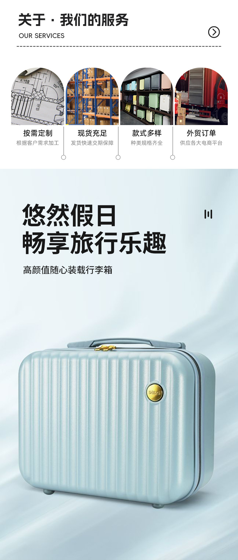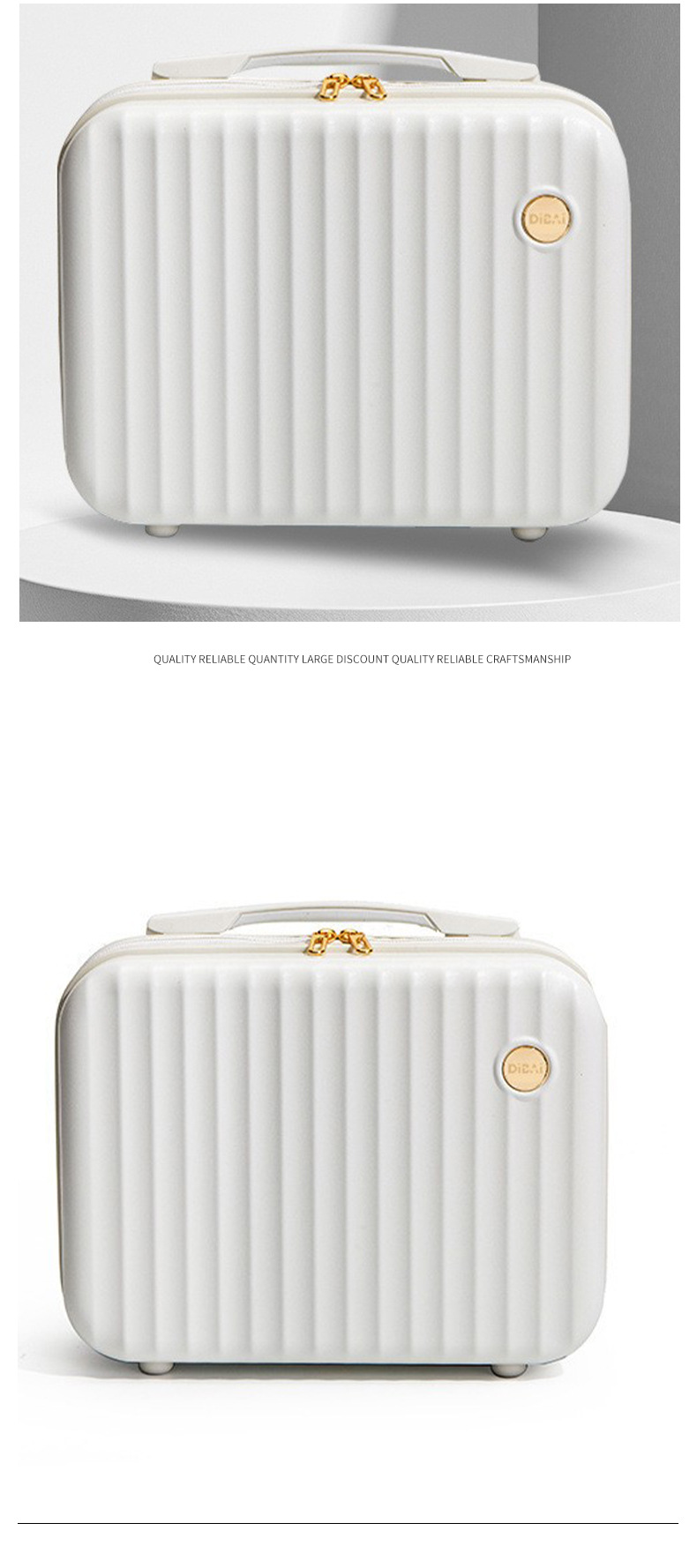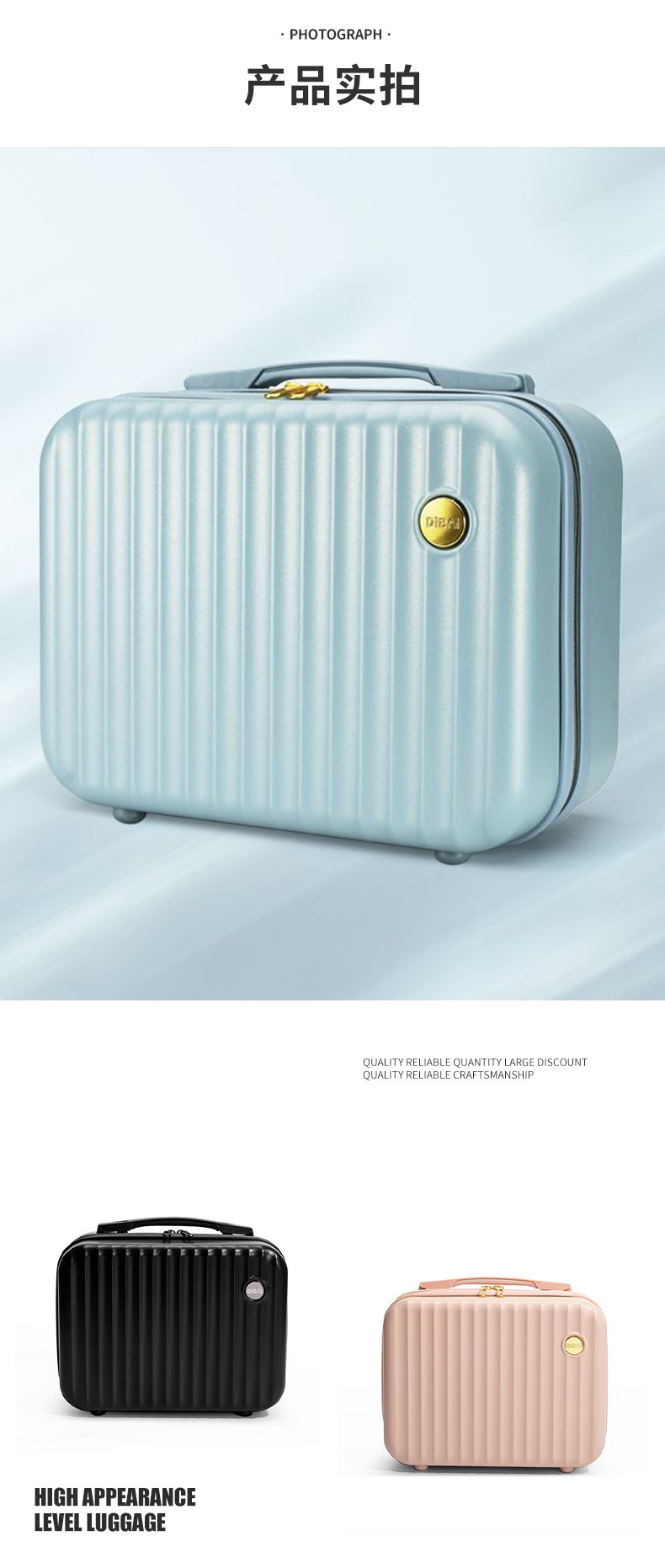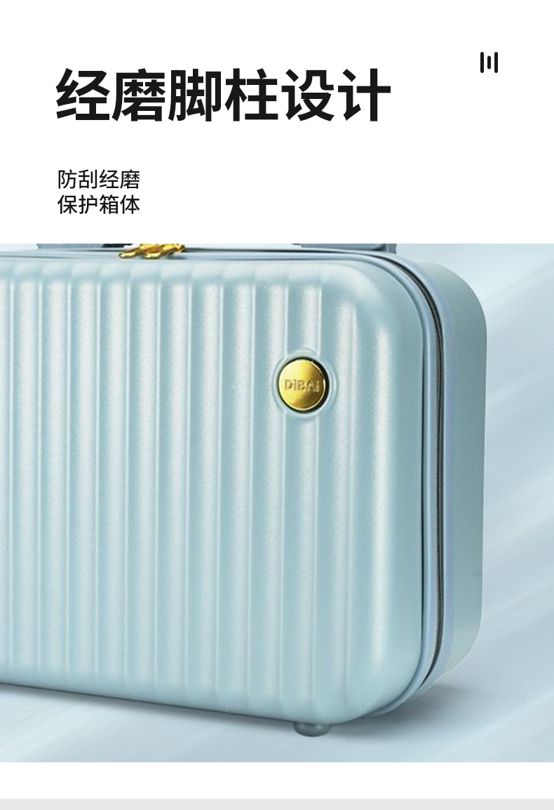 材质: ABS+PC材质 有无拉杆: 无 开盖方式: 拉链 功能: 透气,防水,可收纳 是否带锁: 否 是否有扩展层: 否 品牌: 璐璐箱包 货号: 手提化妆行李箱 适用场景: 家用收纳 尺寸: 14寸 图案: 纯色 风格: 气质熟女 颜色: 蓝色,黑色,白色,粉红色 上市年份季节: 2025年春季 重量: / 适用性别: 中性/男女均可 重量: 0.5 kg/个