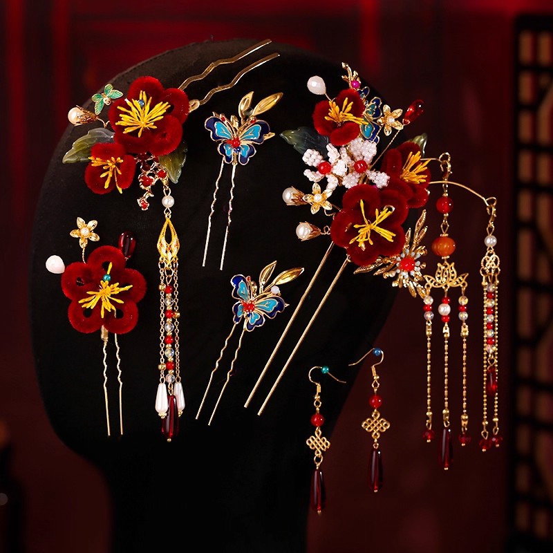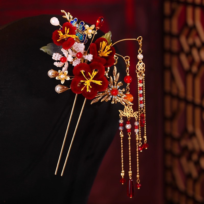 厂家直销红色绒花发簪流苏步摇套装马面裙配饰头饰汉服古风头饰