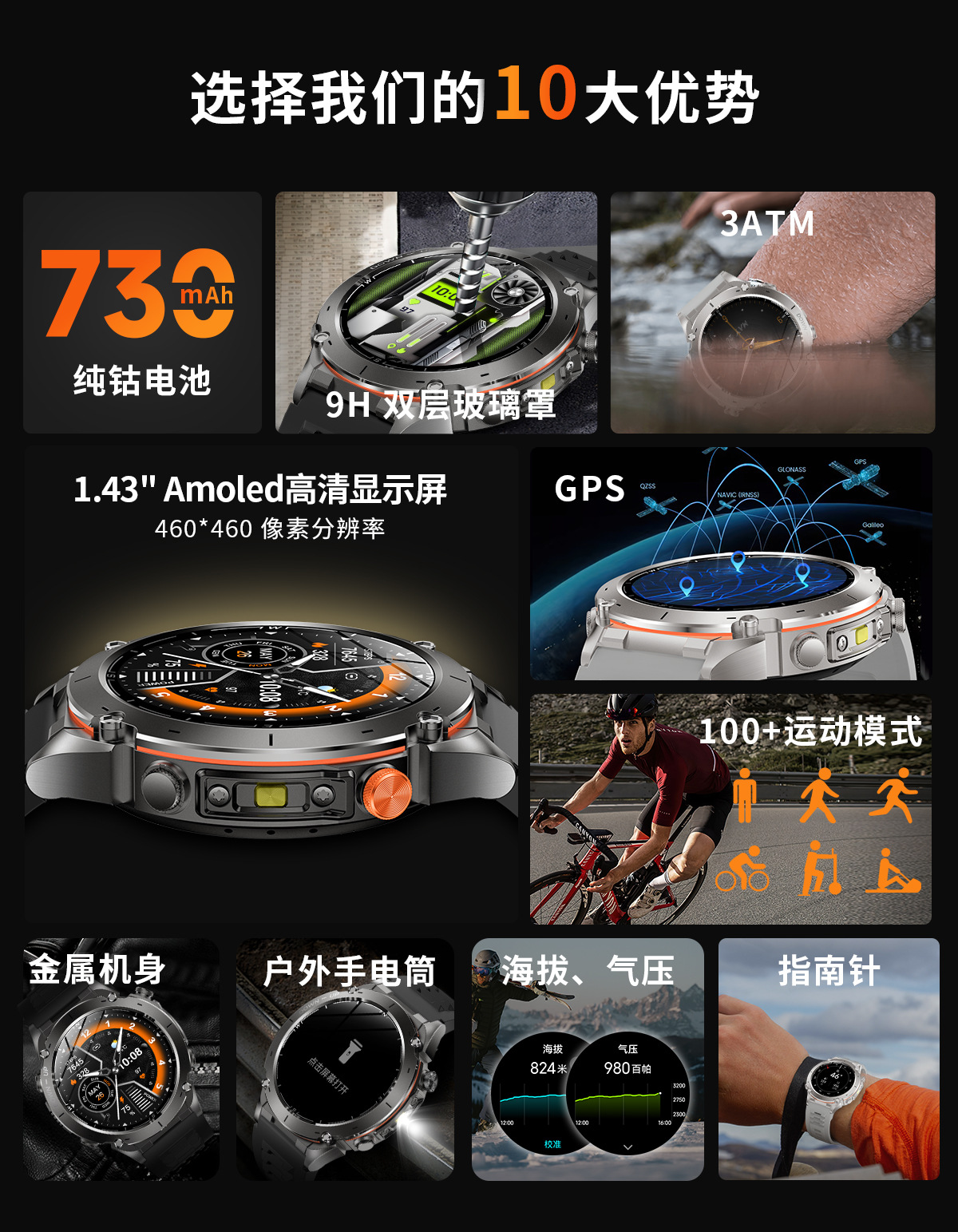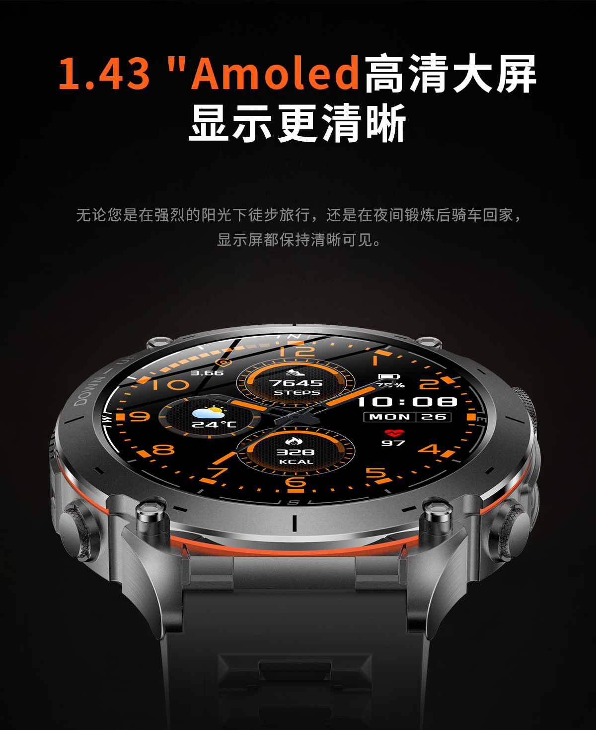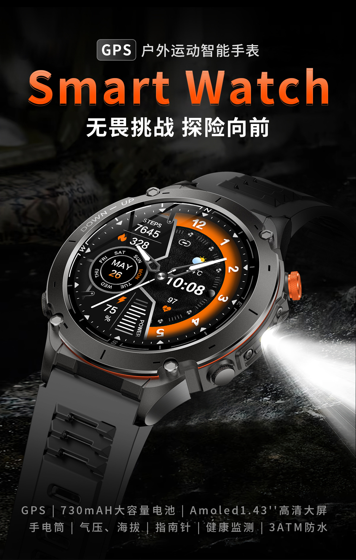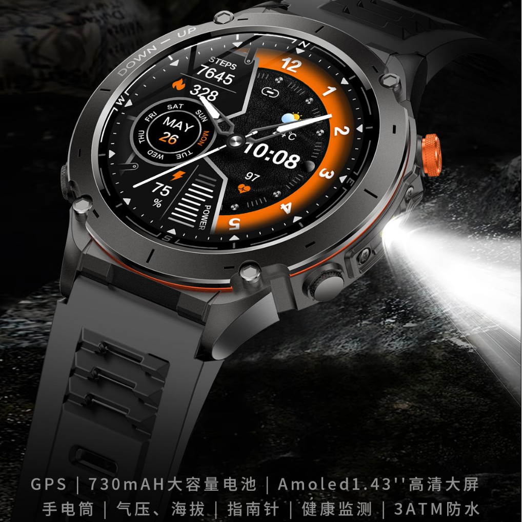 新款Y101智能手表 1.43AMoled户外GPS气压指南针运动防水手电筒表