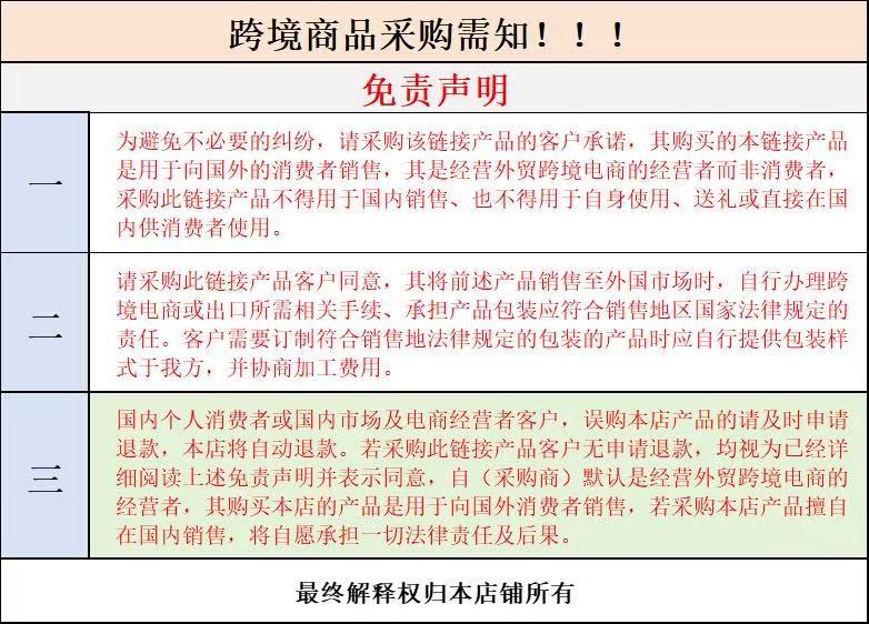 声明:尊敬的客户您好,请您在购买前,仔细阅读以上购物须知免责声明文本以及产品详情。如有疑问请联系我们的客服小姐姐。拍下即视为您已经详细的阅读我方在产品链接中明示的采购相关免责声明,并表示同意。