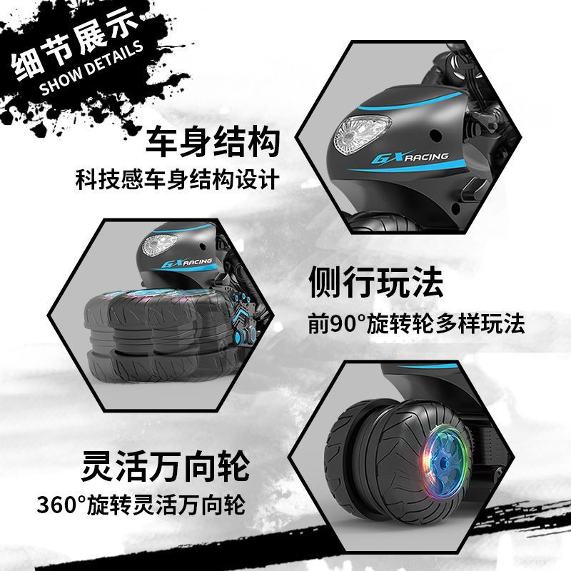 前进、后退、左转、右转。360度旋转,90度站立行驶,左侧漂移行驶,右侧漂移行驶。90度站立旋转,有灯光。