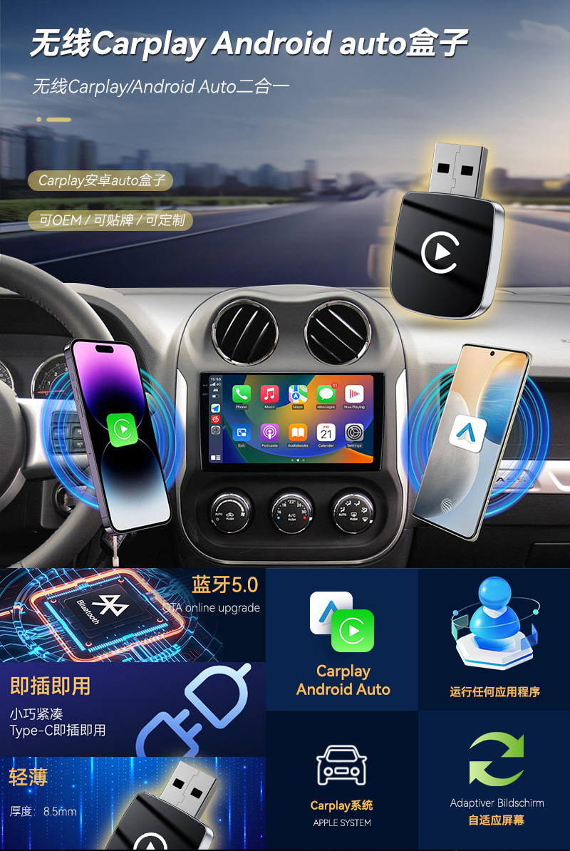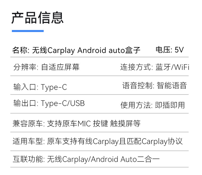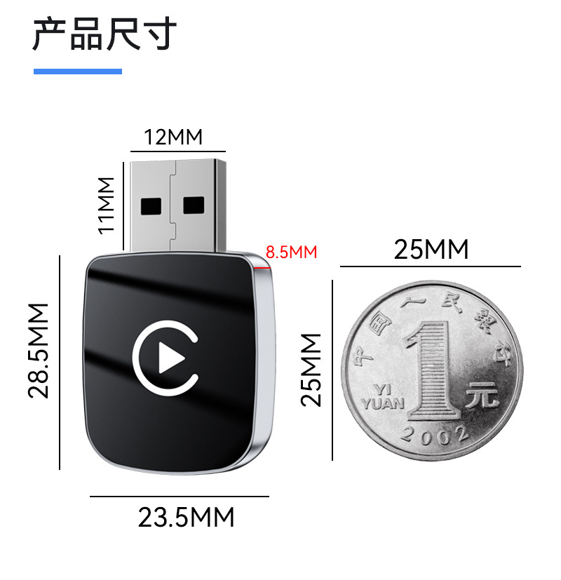 功率: 5 适用车型: 通用 材质: ABS+PC 信躁比: 1 用途: 车载互联 重量: 0.3 产地: 深圳 加工定制: 是 尺寸: 咨询卖家 电压: 5 型号: Q1U carpaly盒子 货号: Q1U carpaly盒子 主要下游平台: 亚马逊,独立站,LAZADA 主要销售地区: 北美,东北亚,中东 有可授权的自有品牌: 是 是否跨境出口专供货源: 是 规格: Q1U-银色白标,Q1U-黑色白标 产品规格: 无线Carplay 加安卓Auto 二合 产品别名: 车机互联盒子