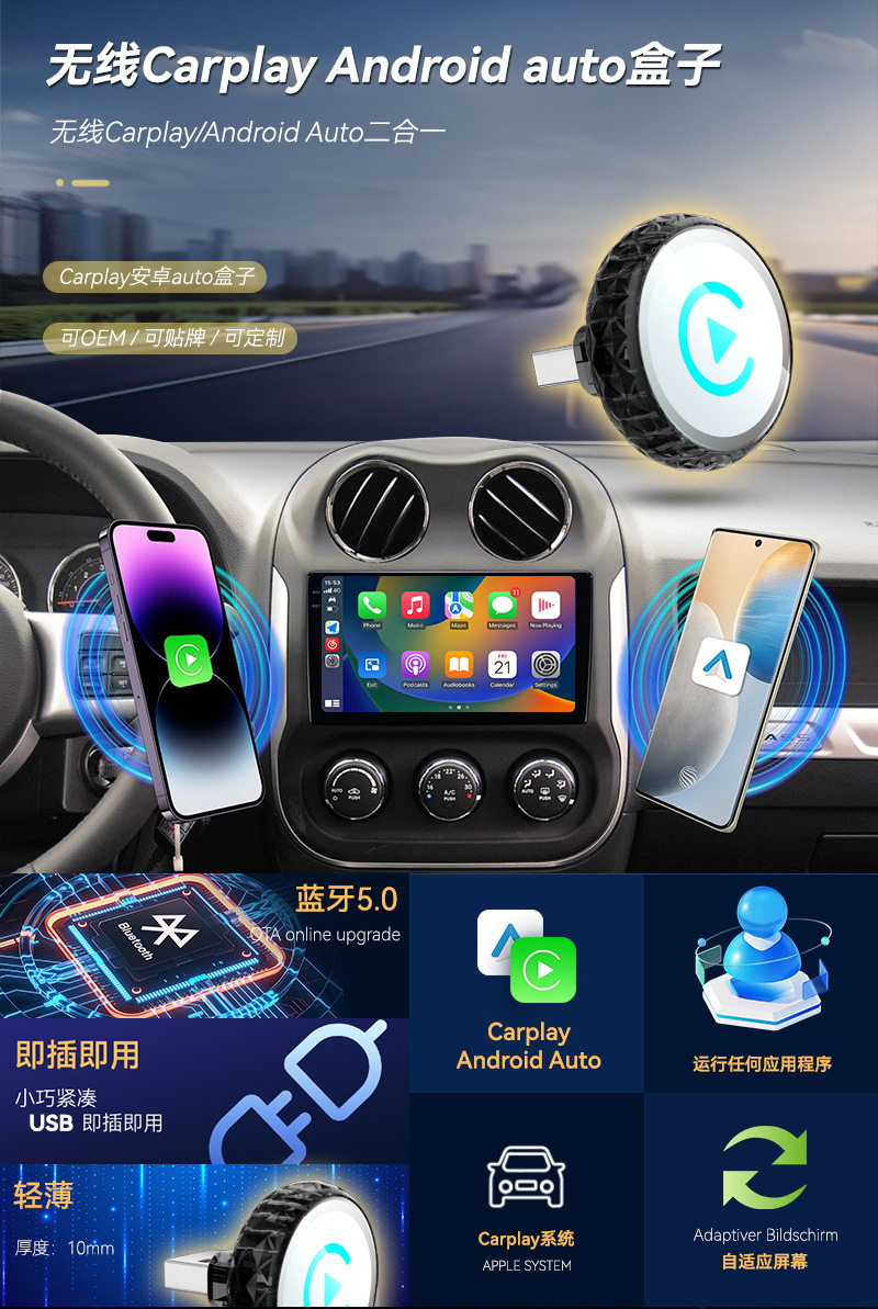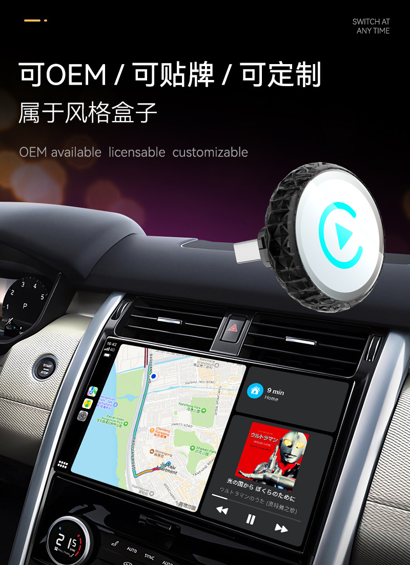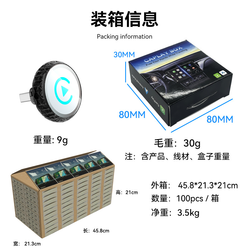 操作系统: IOS10以上版本,Android12. 适合车型: 通用 屏幕尺寸: 无屏幕 型号: carplay盒子 材质: ABS 运行内存: 无内存 分辨率: 原车分辨率 产地: 深圳 加工定制: 是 重量: 9g 接口: USB 屏幕类型: 无屏幕 外观尺寸: 咨询卖家 显卡: 咨询卖家 货号: carplay盒子新方案 规格: Q1A 黑色彩标 金属+玻璃 安卓Aut 颜色分类: 不限 主要下游平台: 亚马逊,速卖通,独立站,LAZADA 主要销售地区: 欧洲,南美,东南亚,北美