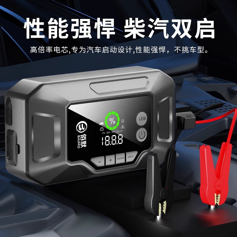品牌: 佰默 输入电压: 12V 附带功能: 启动 打气 照明 外形尺寸: 201*107*64mm 质保: 一年 显示方式: LED