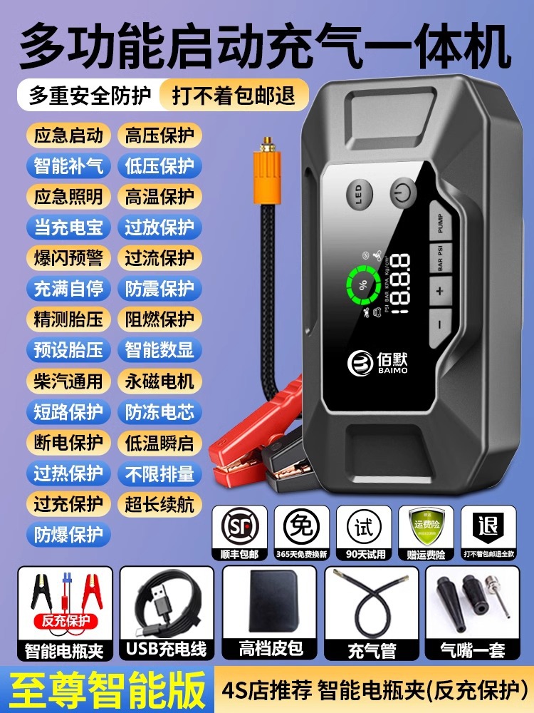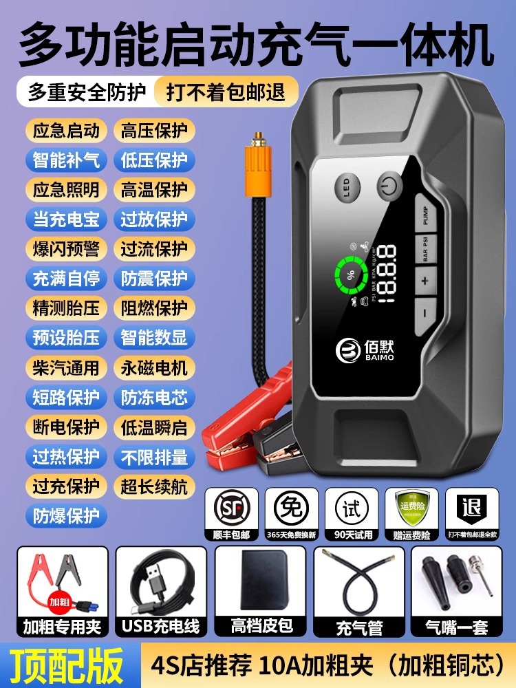 汽车应急启动电源车载充气泵一体机12V电瓶紧急搭电宝强打火神器