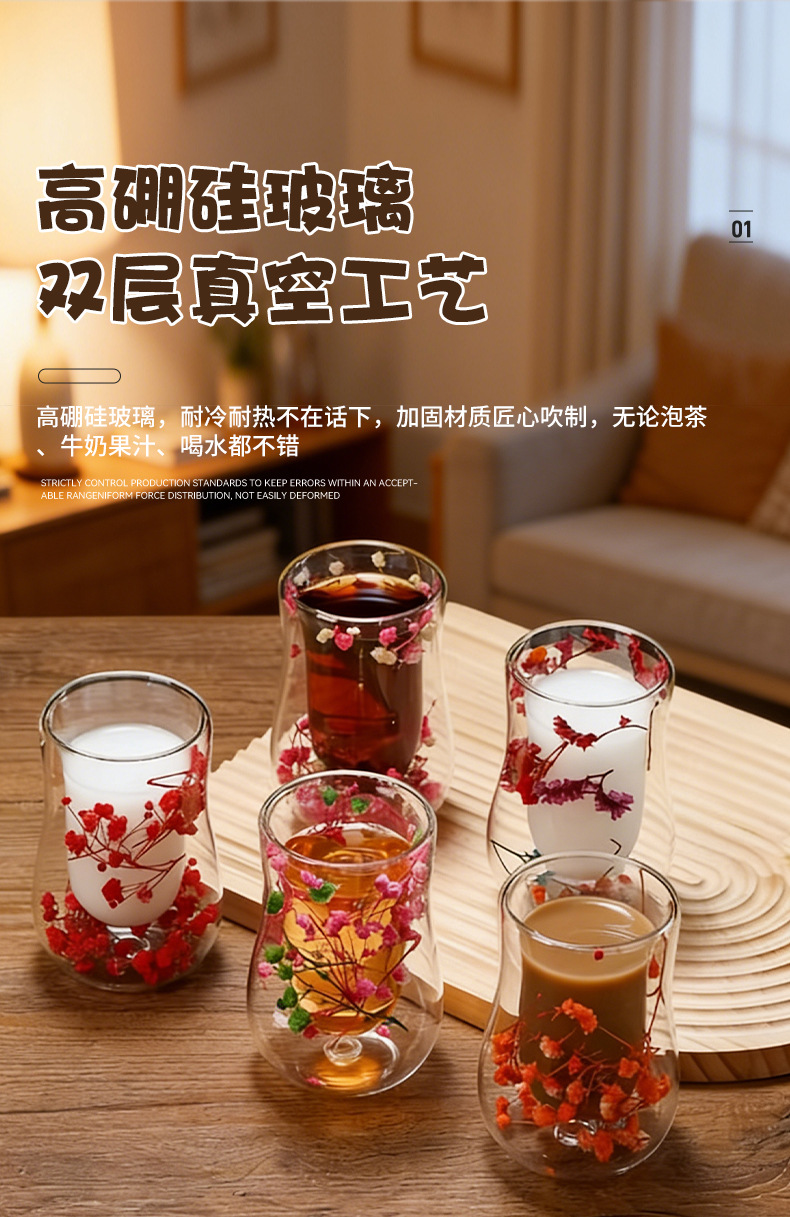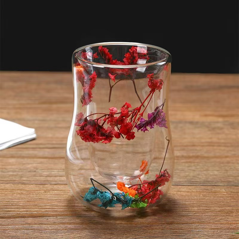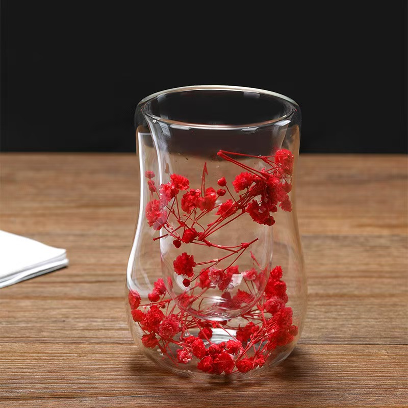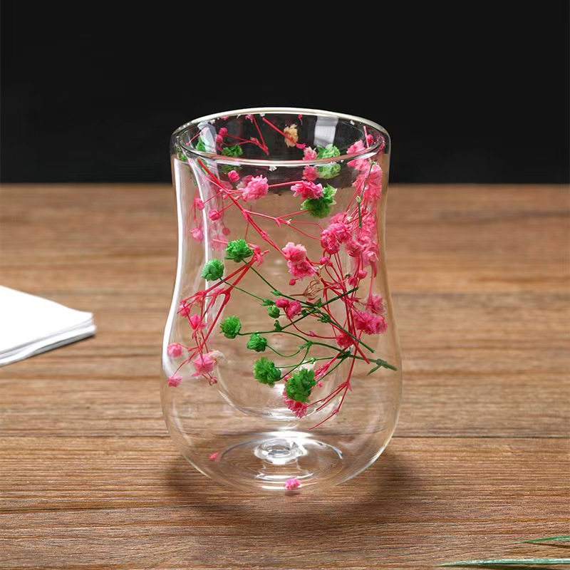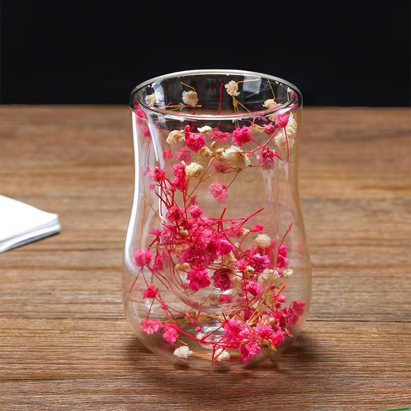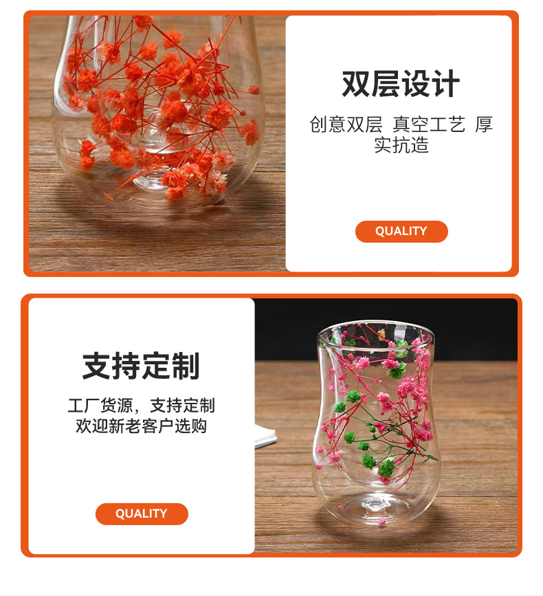 跨境高硼硅双层玻璃杯内置干花高颜值流沙干花隔热真花双层玻璃杯