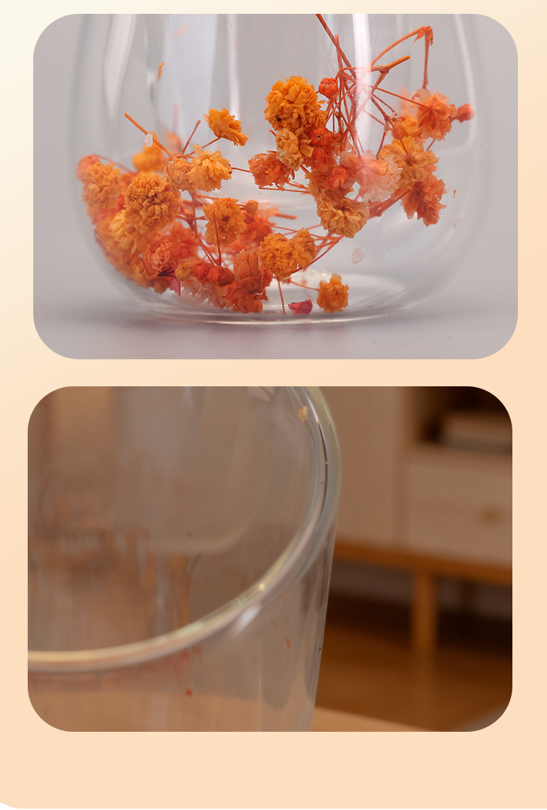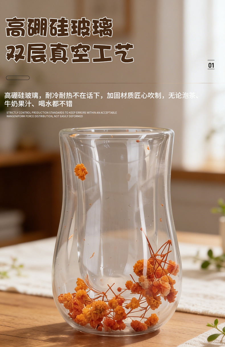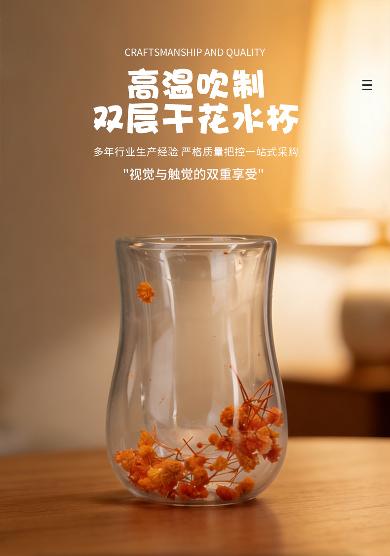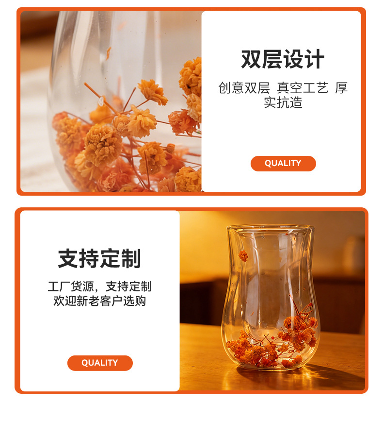 跨境高硼硅双层玻璃杯内置干花高颜值流沙隔热真花高硼硅大容量