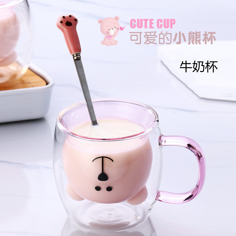 双层隔热牛奶咖啡玻璃杯带把手卡通小熊杯家用彩色内胆咖啡喝水杯