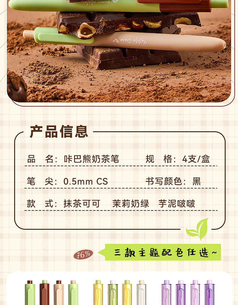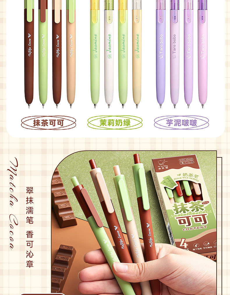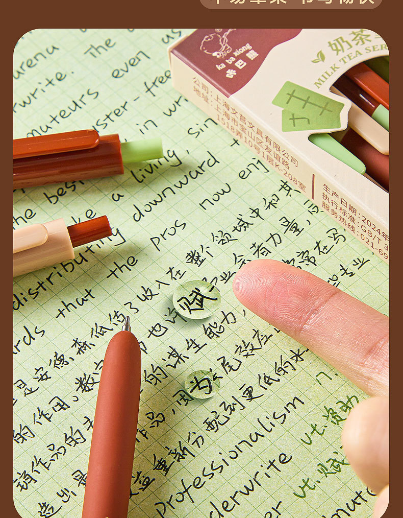 外壳材质: 塑料 品牌: 咔巴熊 笔尖材质: 不锈钢 是否可擦: 否 系列: 奶茶 货号: KBX-6340 笔头: 0.5mm 重量: 0.5 kg/盒