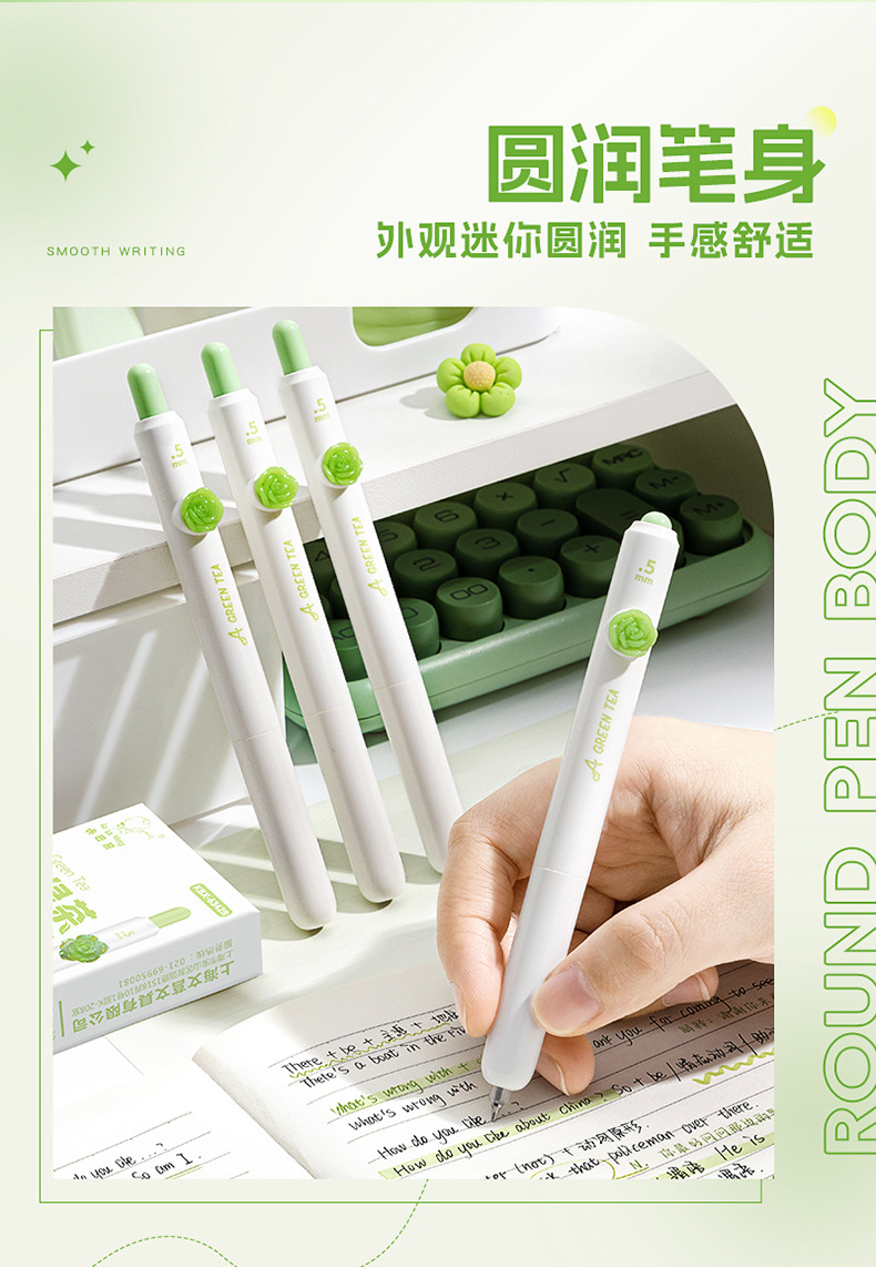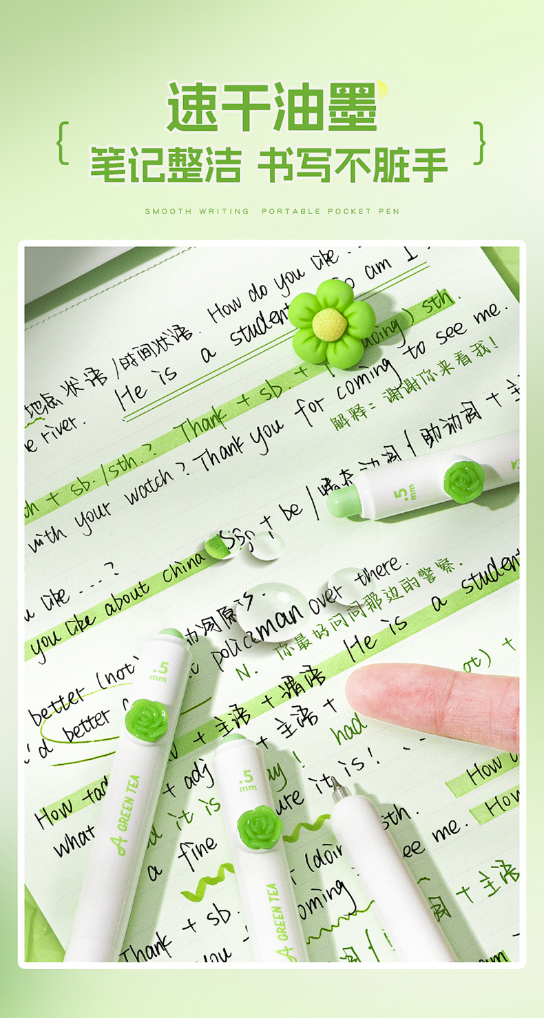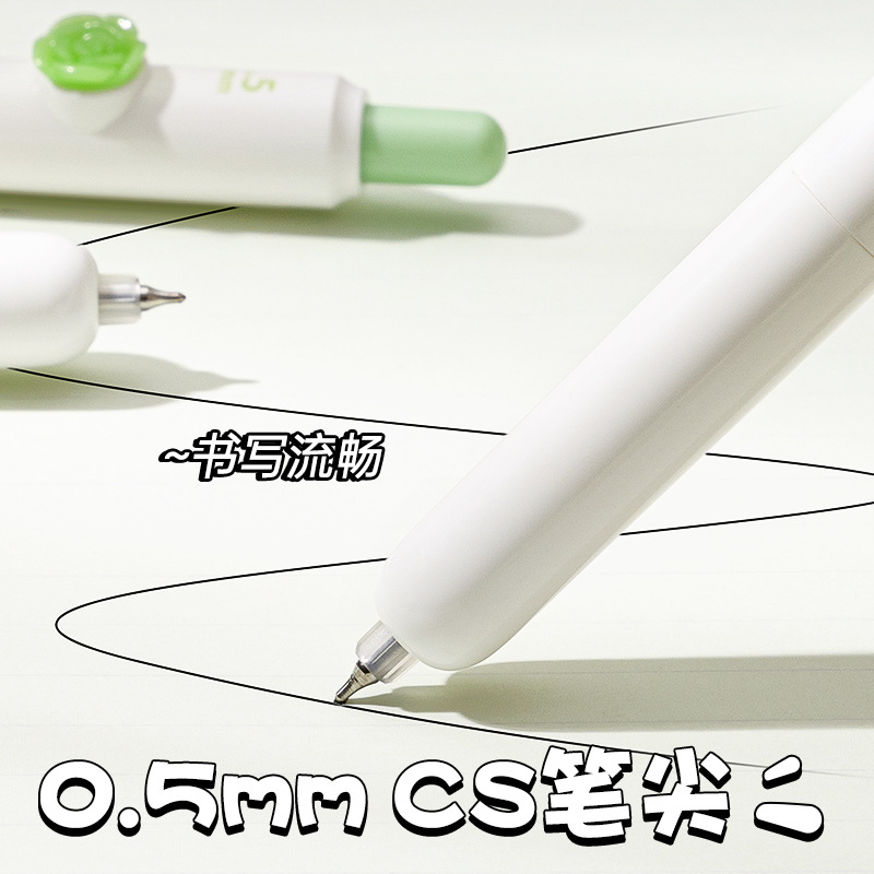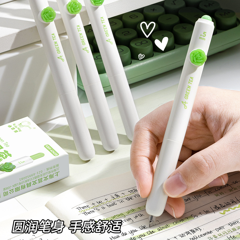 小绿茶按动中性笔花朵贴片高颜值速干刷题黑笔学生考试作业专用笔