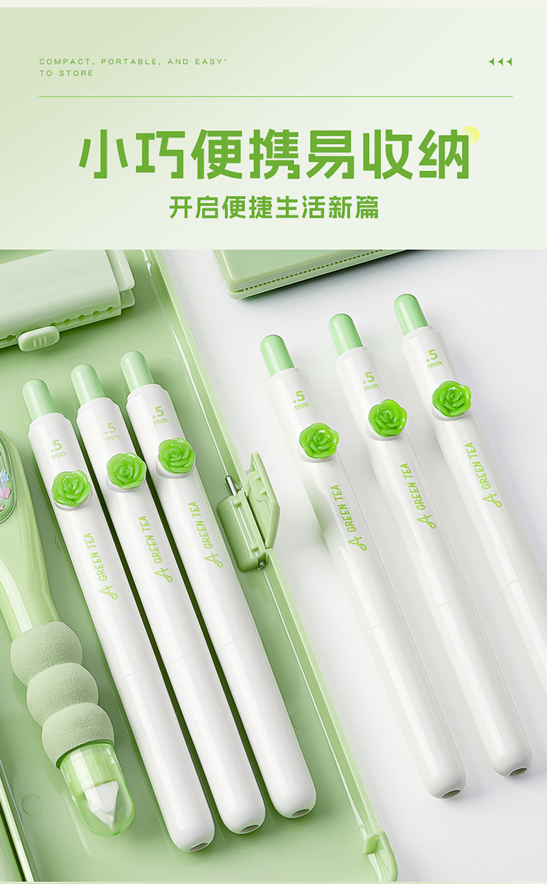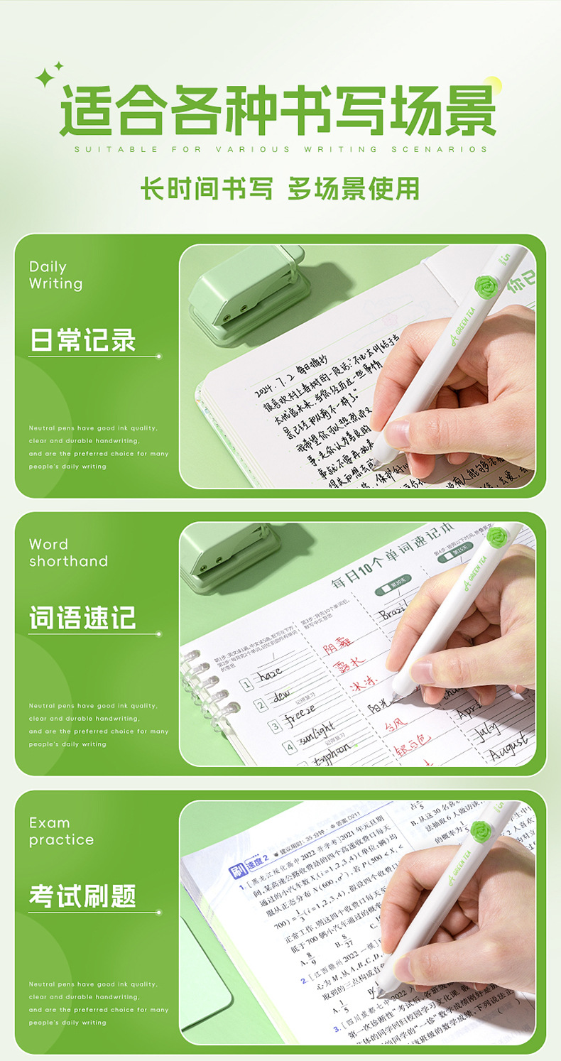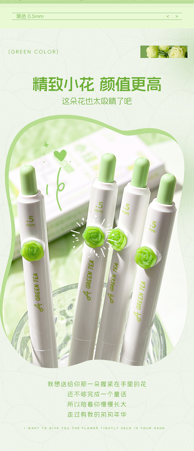 小绿茶按动中性笔花朵贴片高颜值速干刷题黑笔学生考试作业专用笔